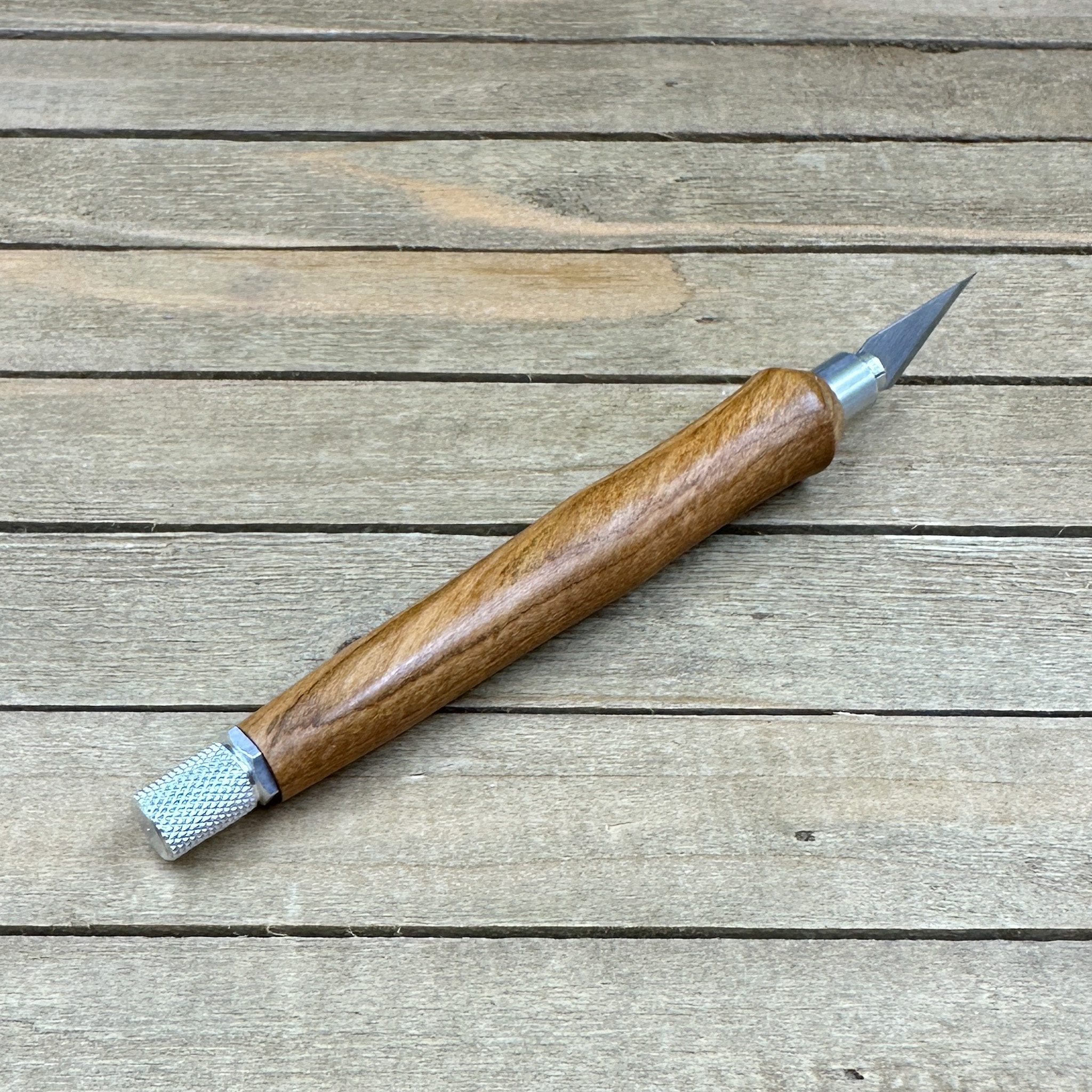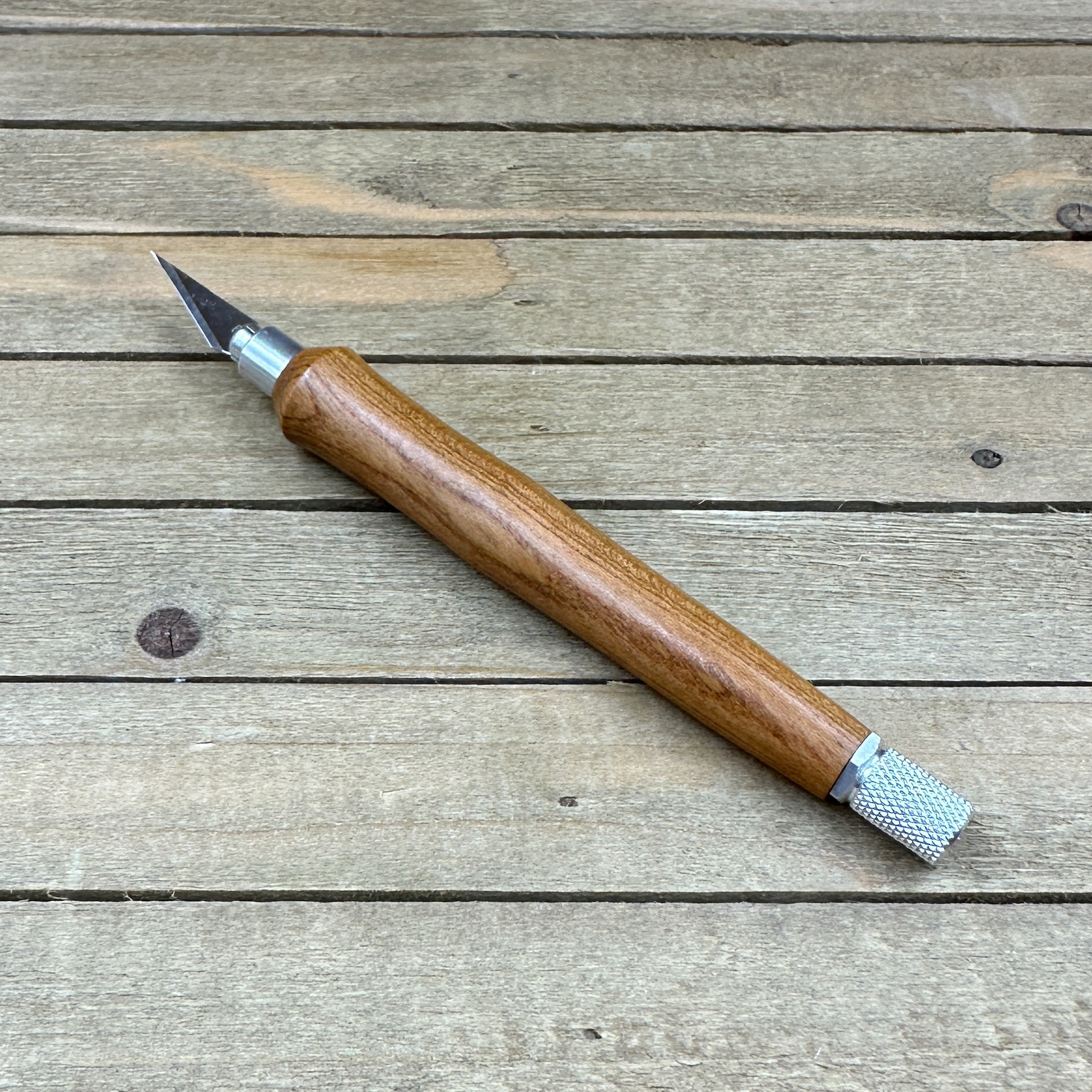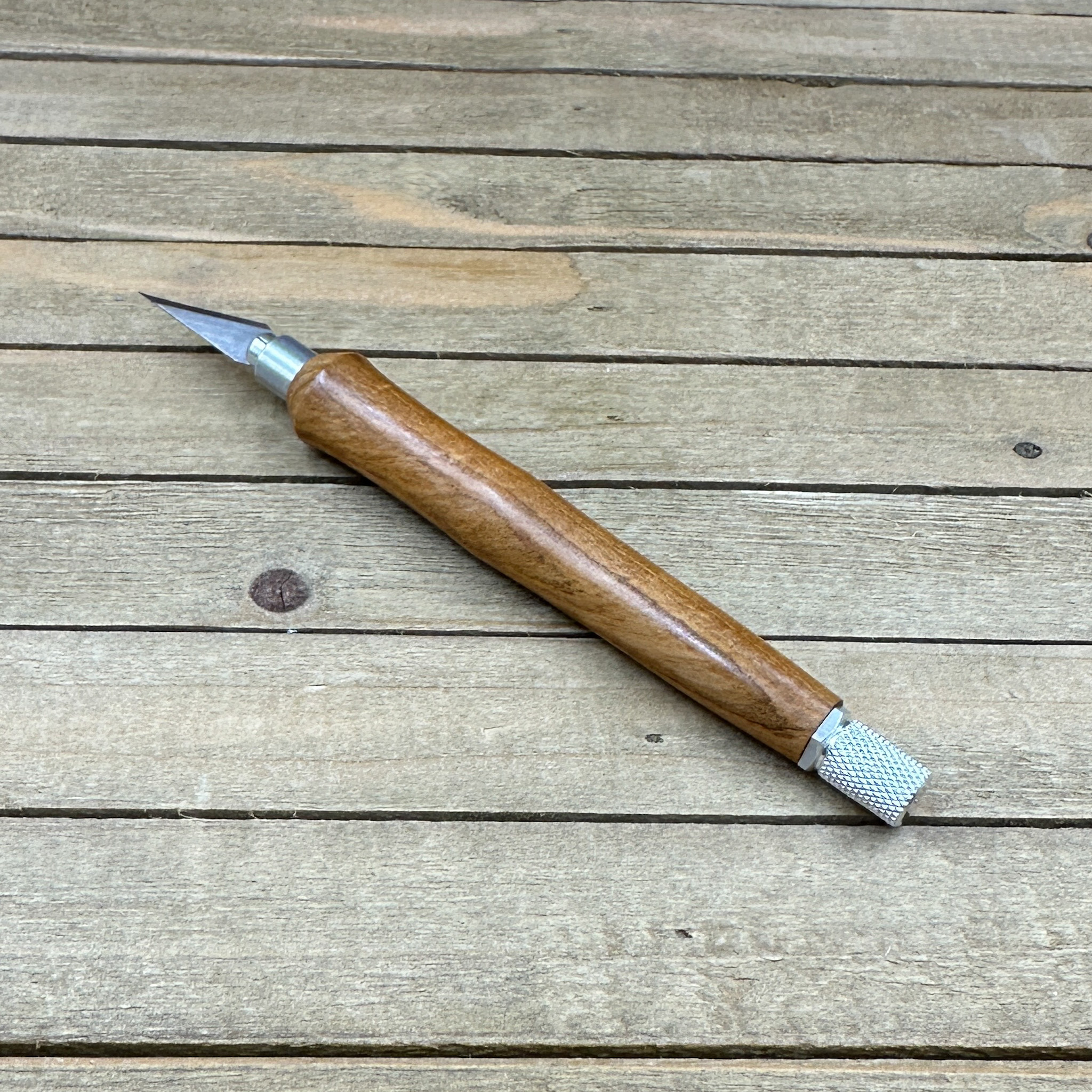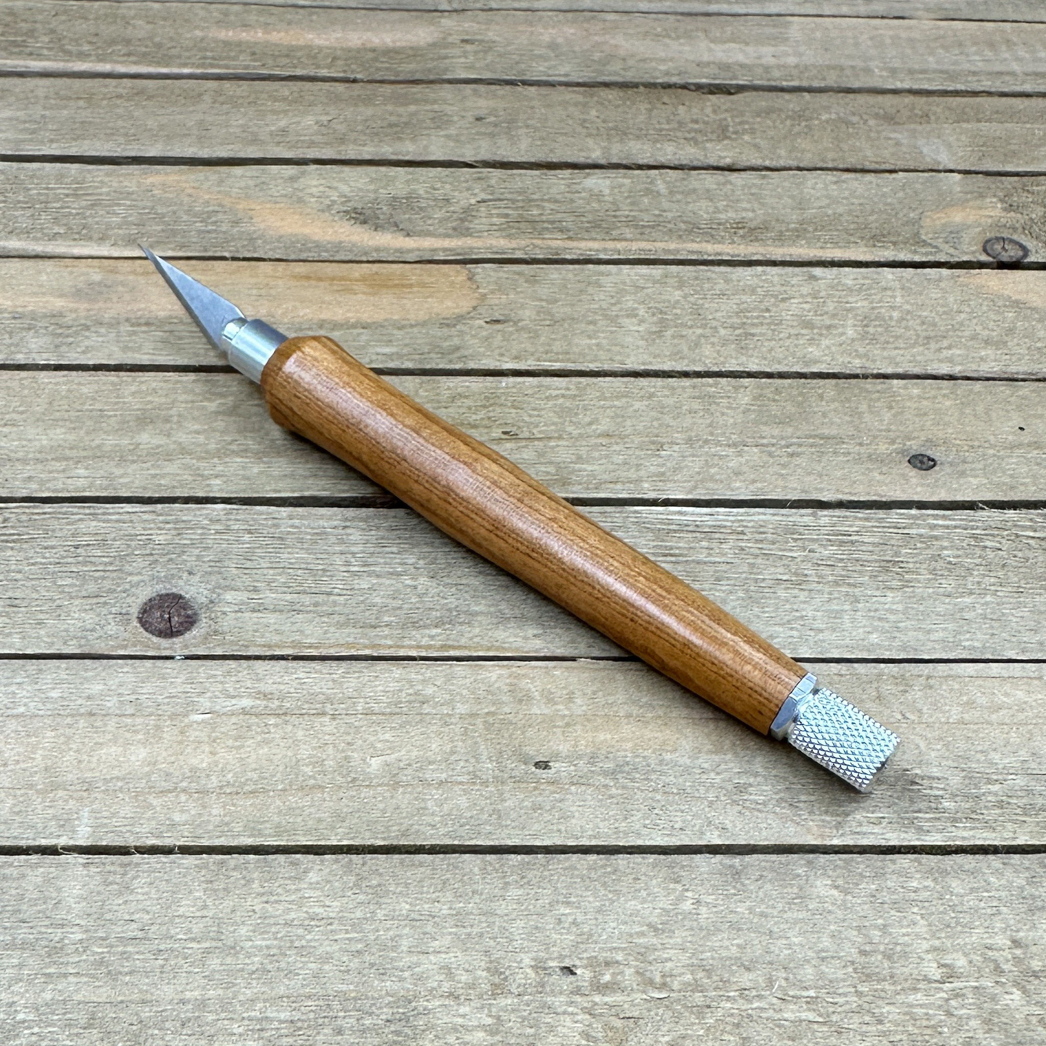 This custom handmade hobby knife, like all my other hobby knives, was personally handcrafted by me in my woodshop. These are not mass produced marking knives and each one is handcrafted by myself so you are getting a craftsman's touch and the love of their craft with each knife. Each hobby knife I craft has subtle differences making it a truly one of a kind. First, I select a piece of Bradford pear, cut it down to size to get it ready to turn on my wood lathe. Second, the newly formed blank is drilled out to fit the aluminum components and to prep it for turning. Third, it is meticulously turned down with my lathe to fit the hobby making knife components taking proper care that it transitions to the hardware perfectly. Finally, a walnut oil and wax finish is applied in multiple coats which allows you to feel the wood when you use the knife.
