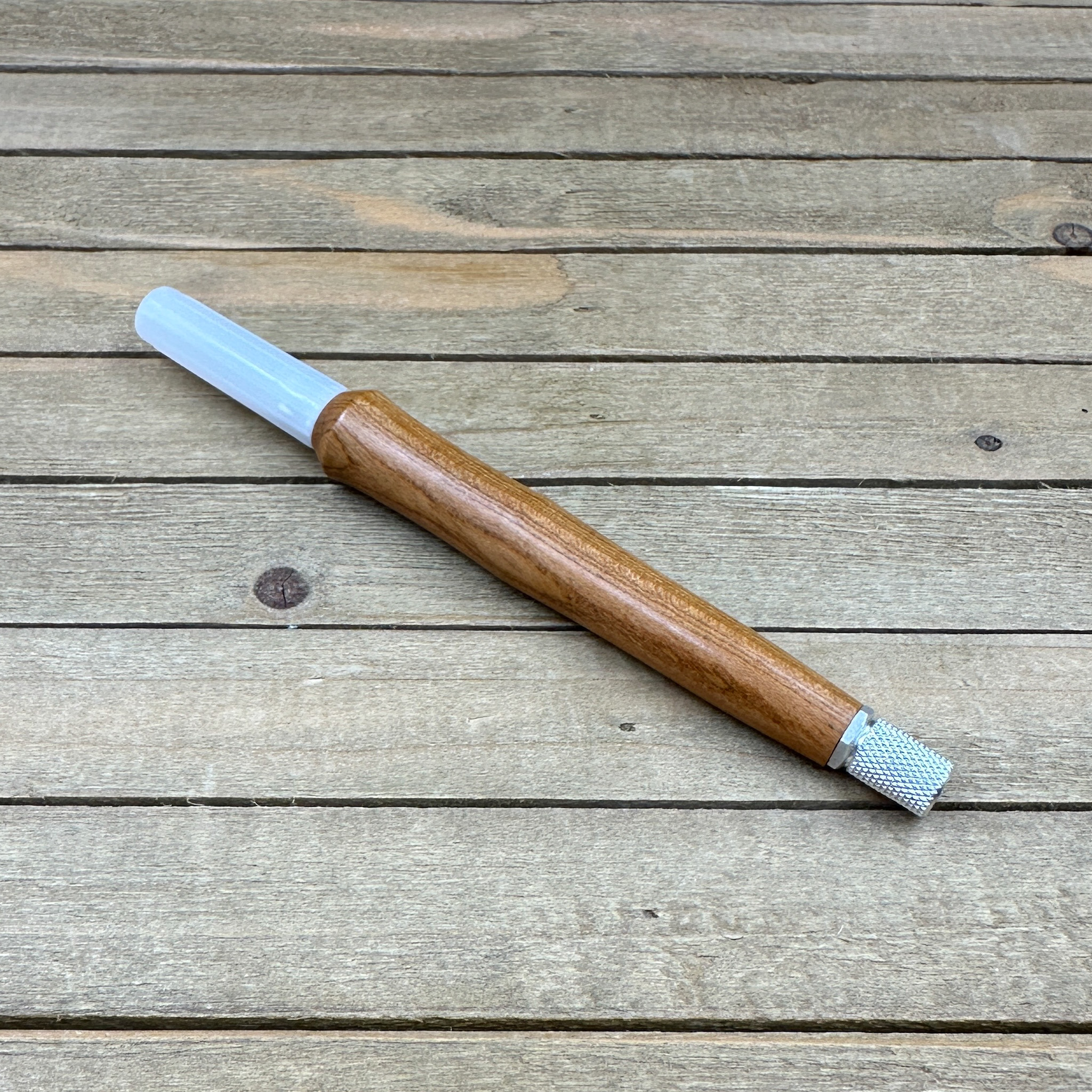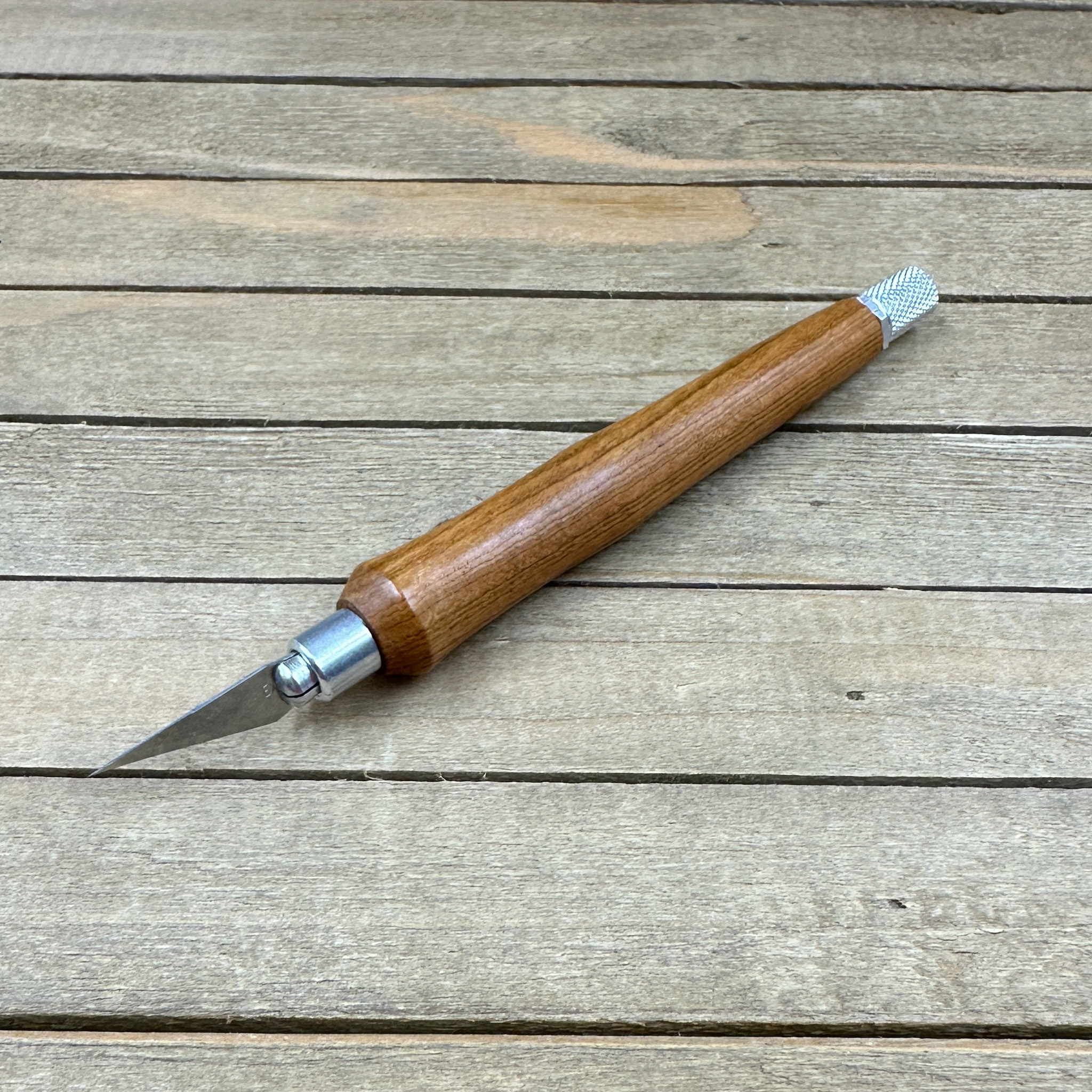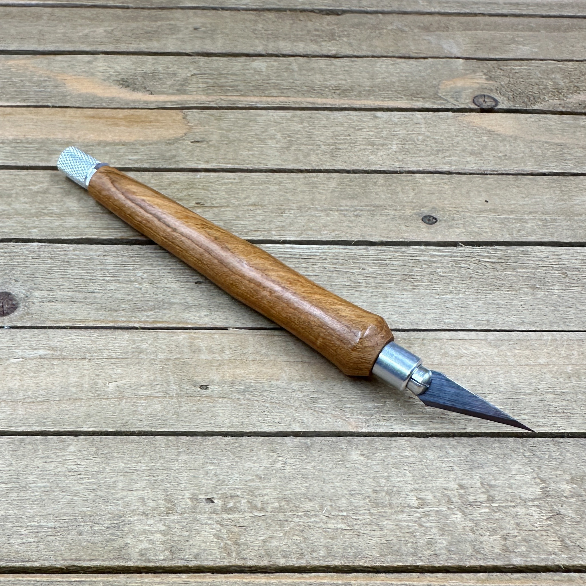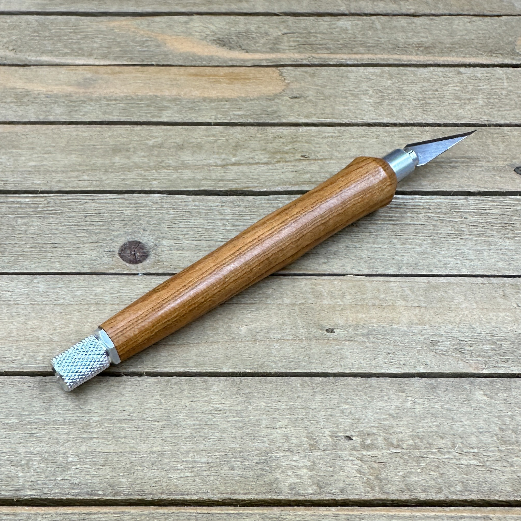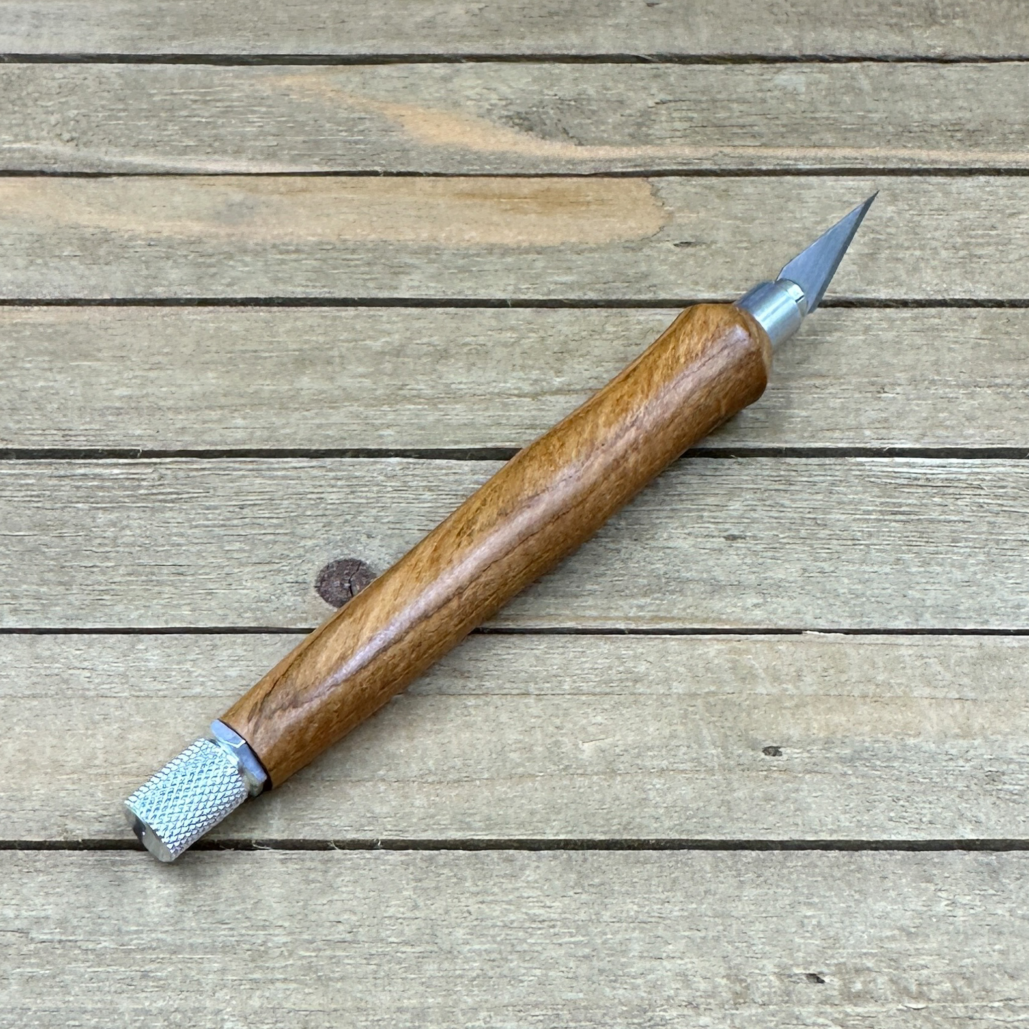 This custom handmade hobby knife, like all my other hobby knives, was personally handcrafted by me in my woodshop. These are not mass produced marking knives and each one is handcrafted by myself so you are getting a craftsman's touch and the love of their craft with each knife. Each hobby knife I craft has subtle differences making it a truly one of a kind. First, I select a piece of Bradford pear, cut it down to size to get it ready to turn on my wood lathe. Second, the newly formed blank is drilled out to fit the aluminum components and to prep it for turning. Third, it is meticulously turned down with my lathe to fit the hobby making knife components taking proper care that it transitions to the hardware perfectly. Finally, a walnut oil and wax finish is applied in multiple coats which allows you to feel the wood when you use the knife.