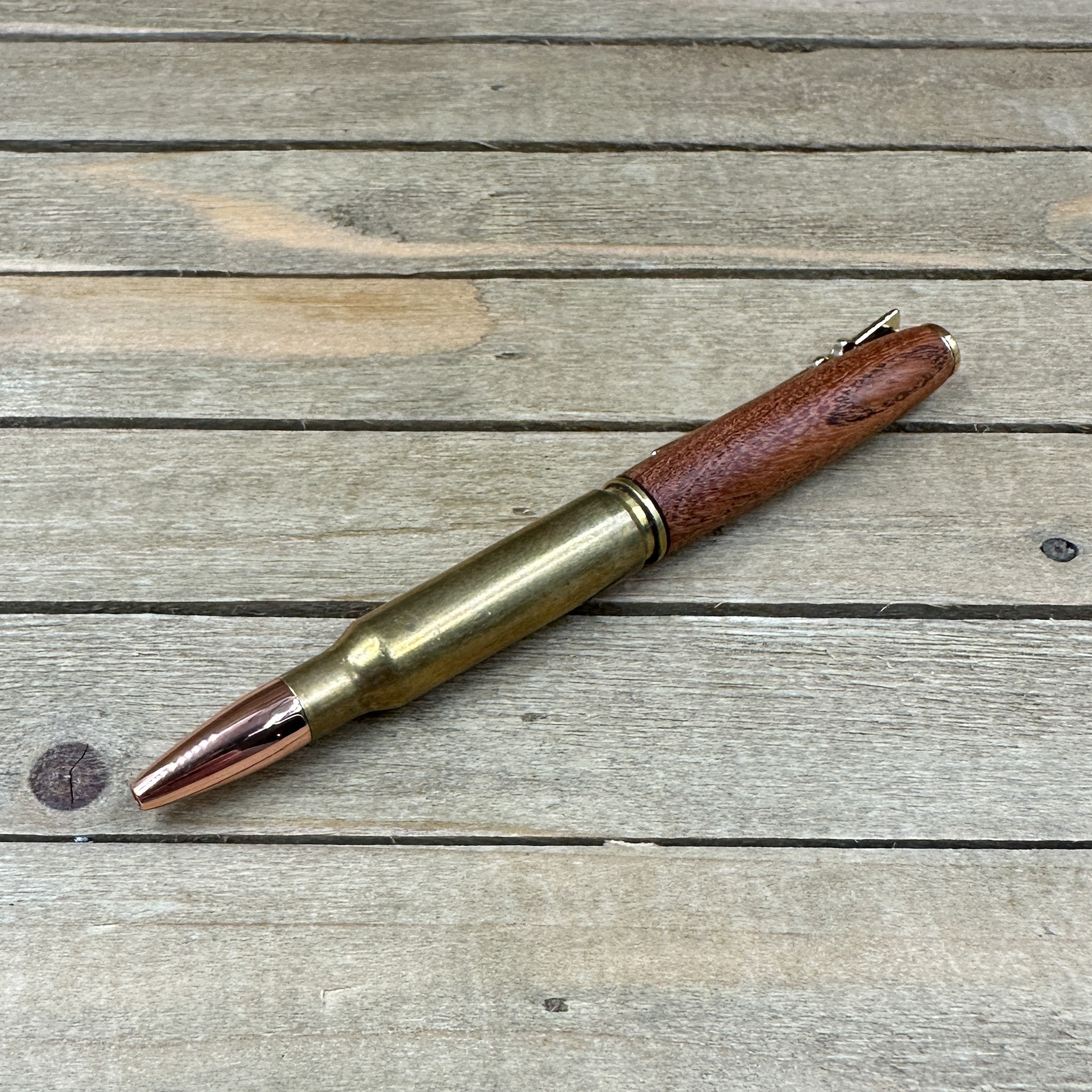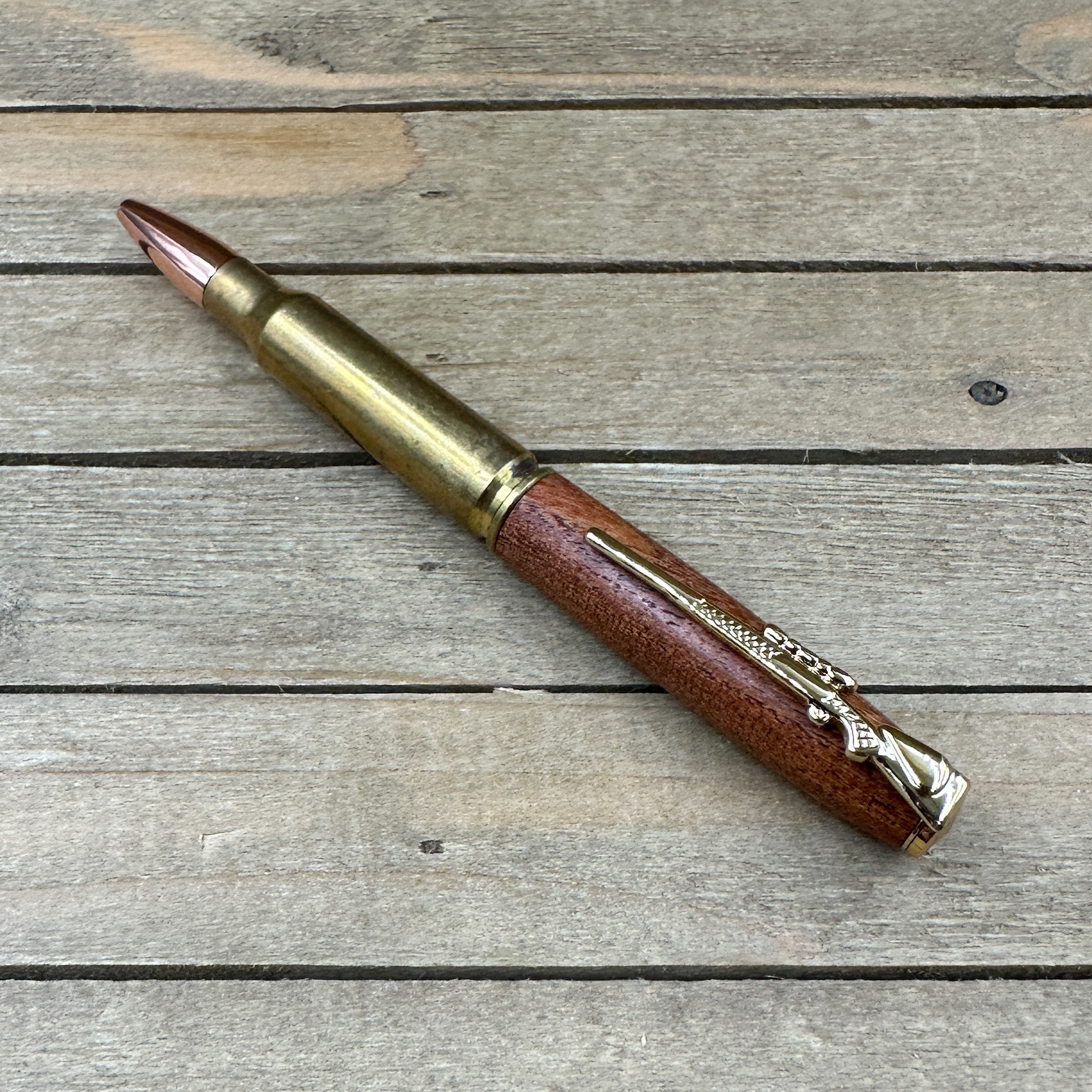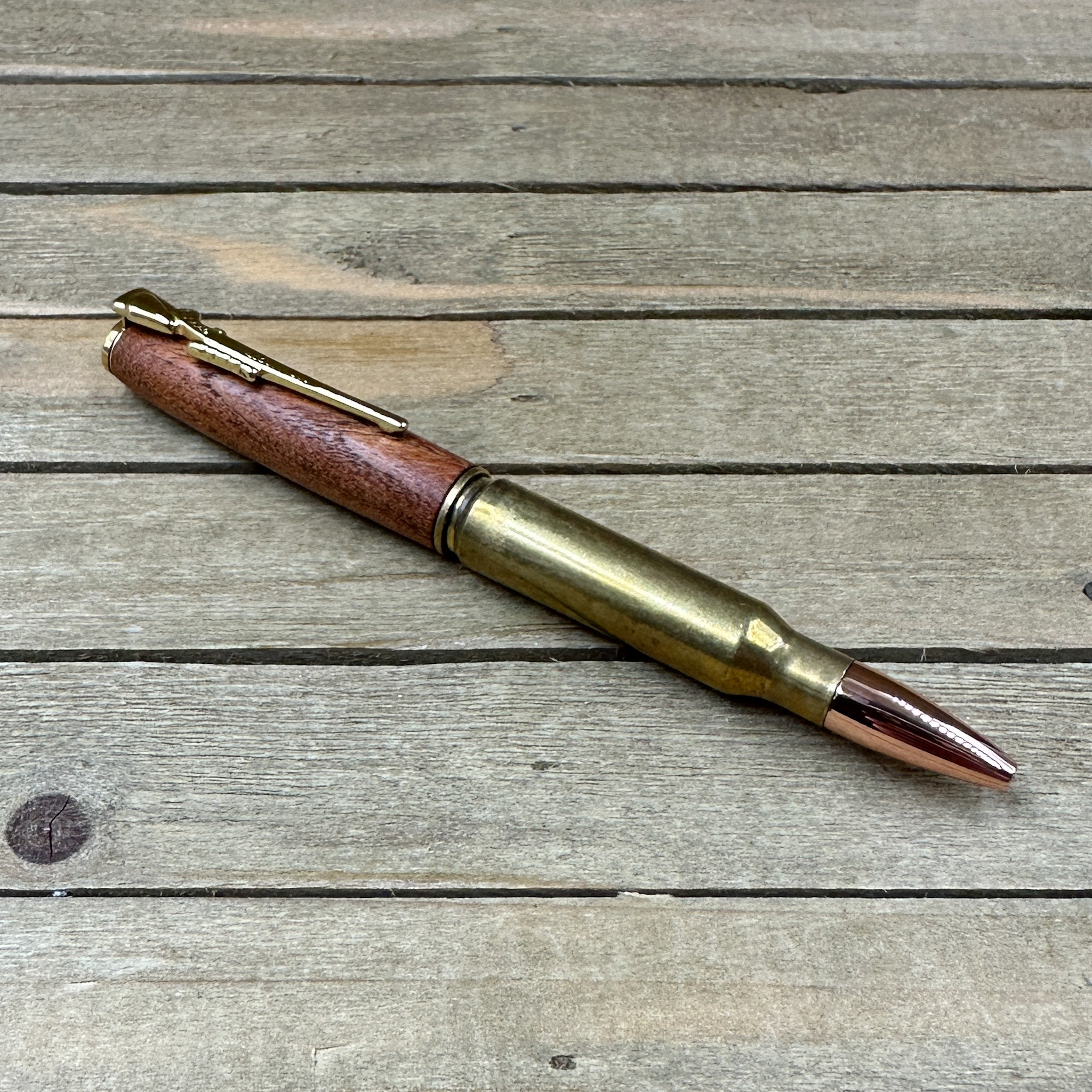 This handcrafted .308 bullet pen combines rugged Western mesquite wood with an authentic brass rifle cartridge design, creating a unique writing instrument that’s both functional and collectible. Each pen is individually turned and finished by hand, highlighting the natural grain and character of Texas mesquite—no two pens are ever alike.