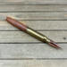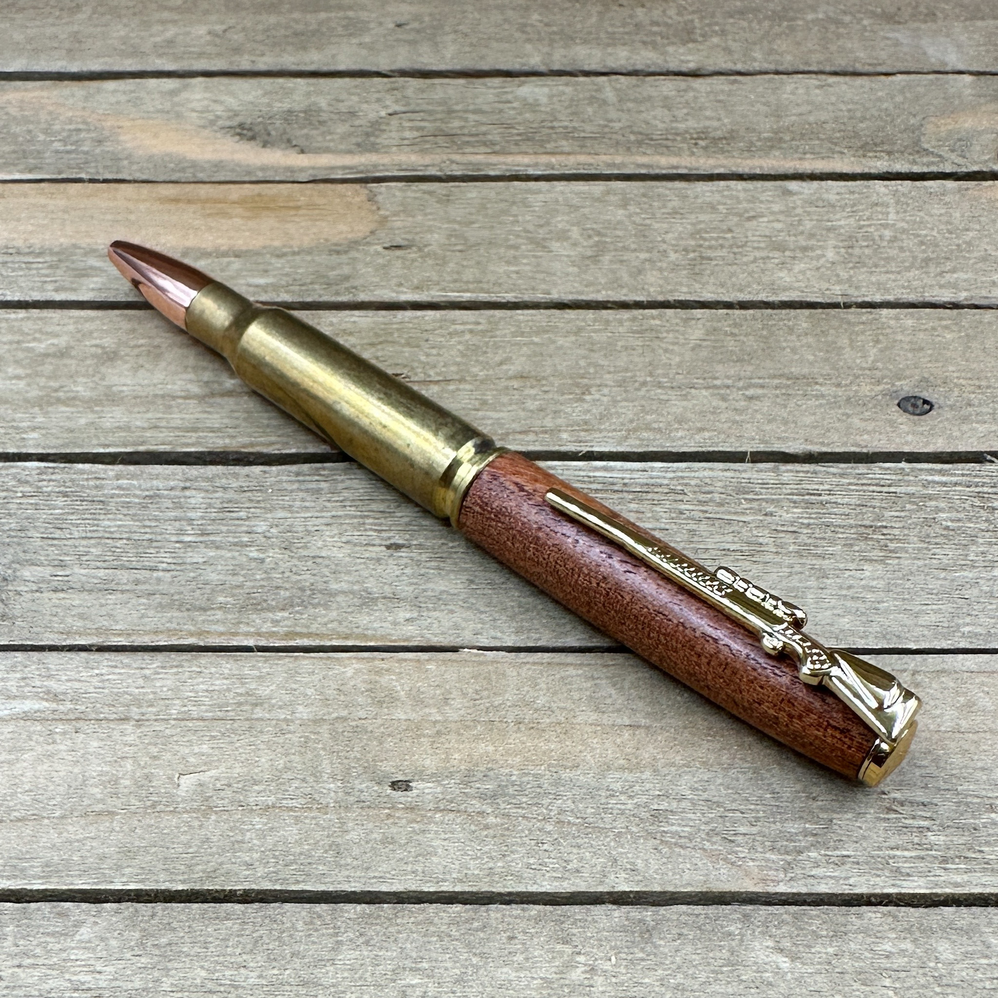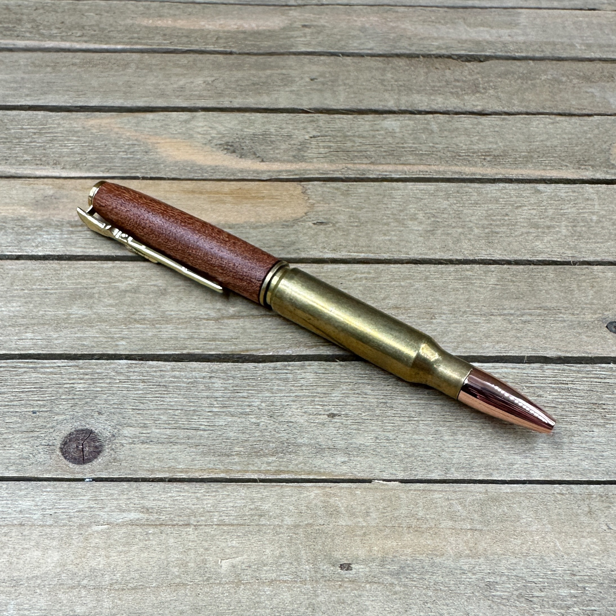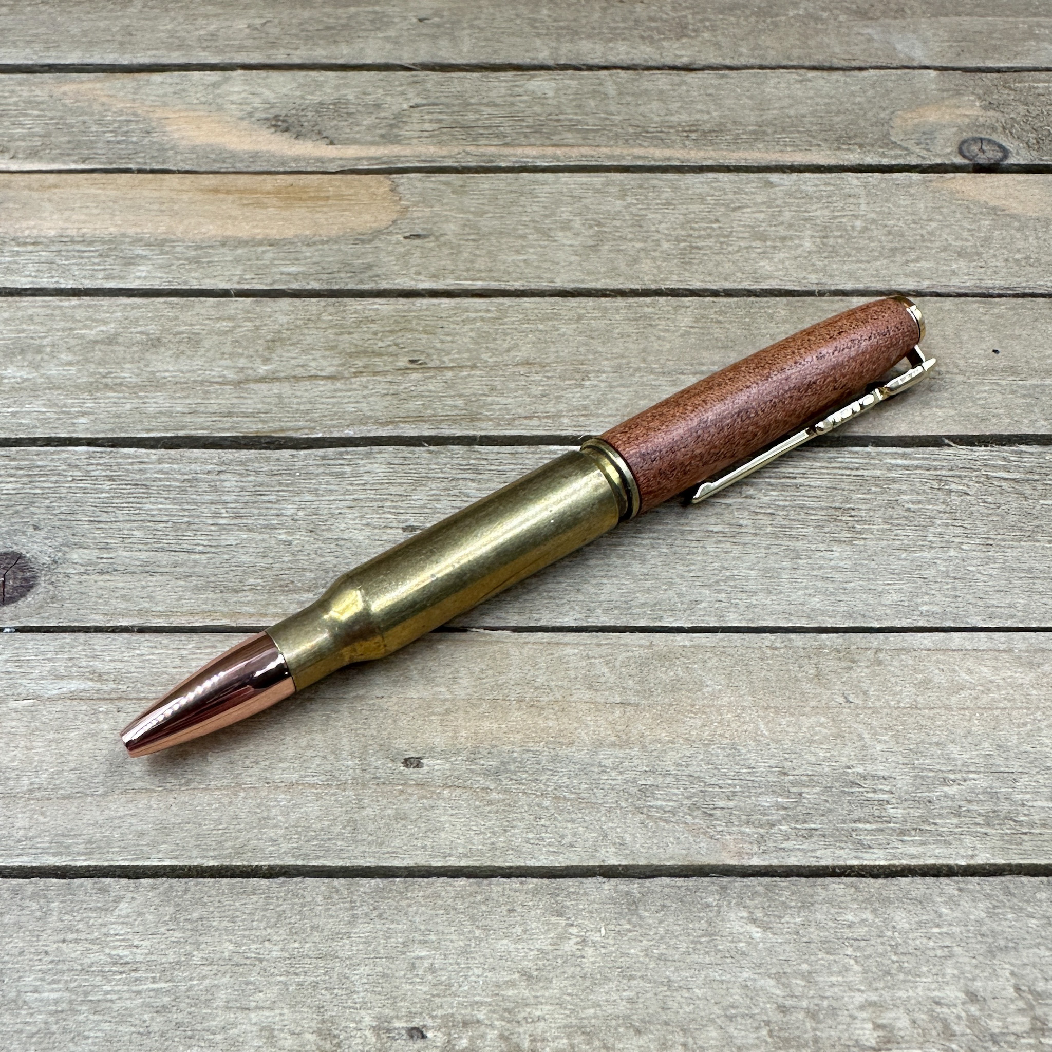 This handcrafted .308 bullet pen combines rugged Western mesquite wood with an authentic brass rifle cartridge design, creating a unique writing instrument that’s both functional and collectible. Each pen is individually turned and finished by hand, highlighting the natural grain and character of Texas mesquite—no two pens are ever alike.