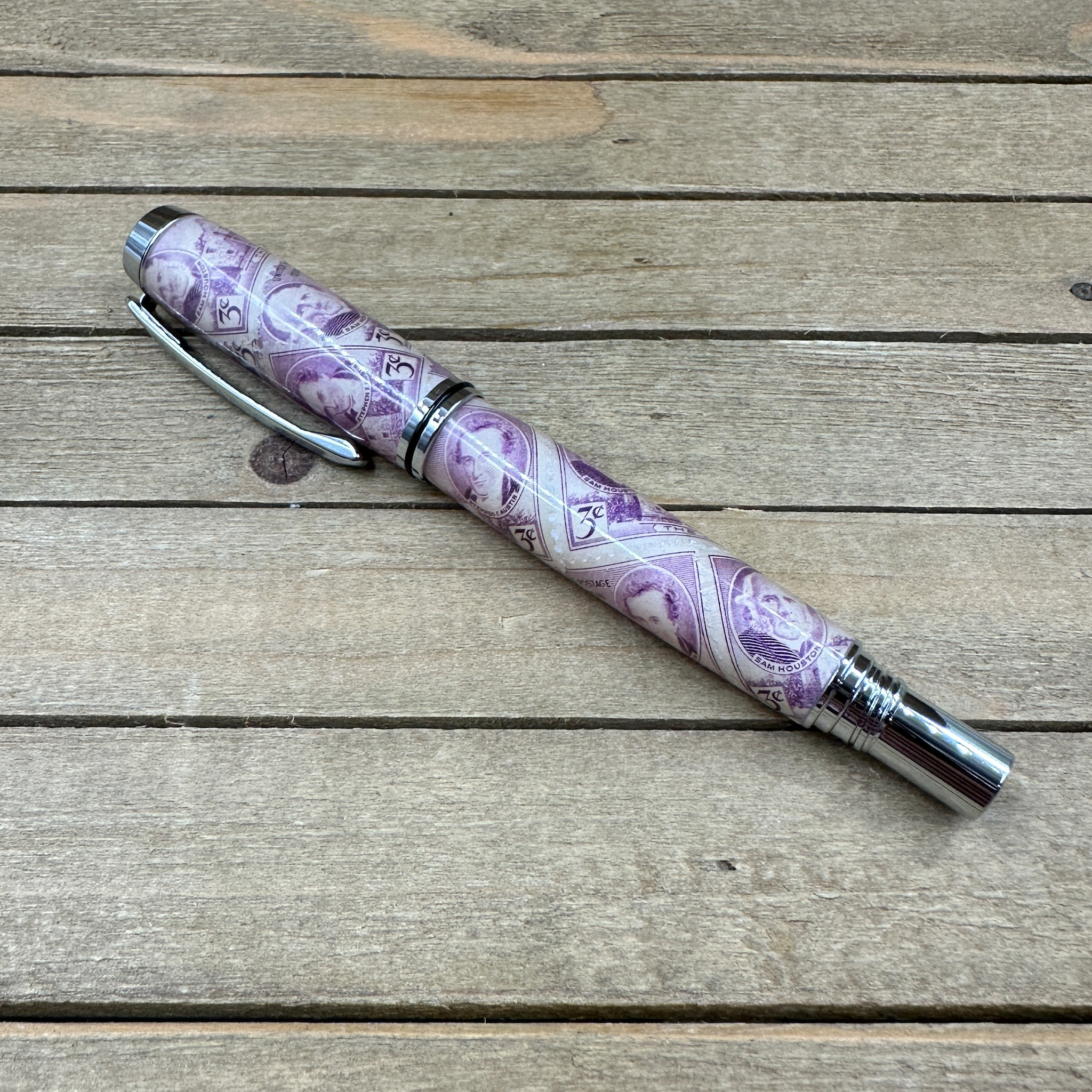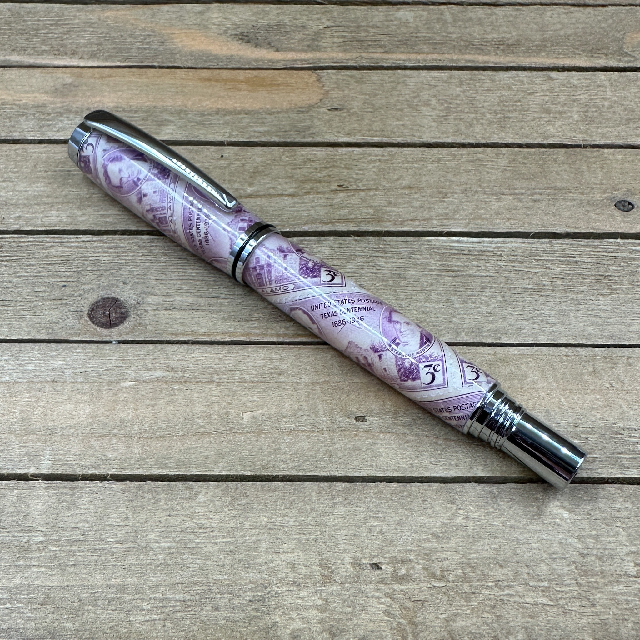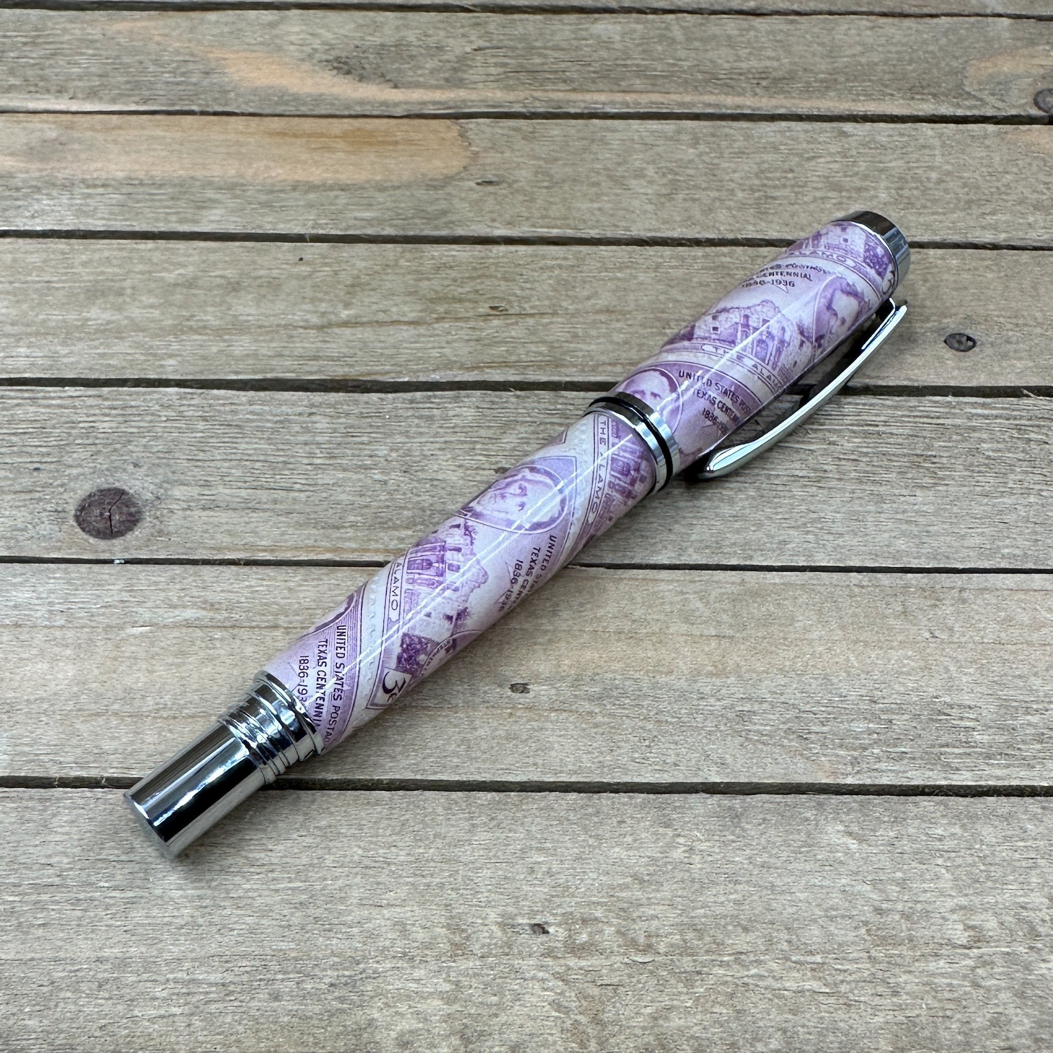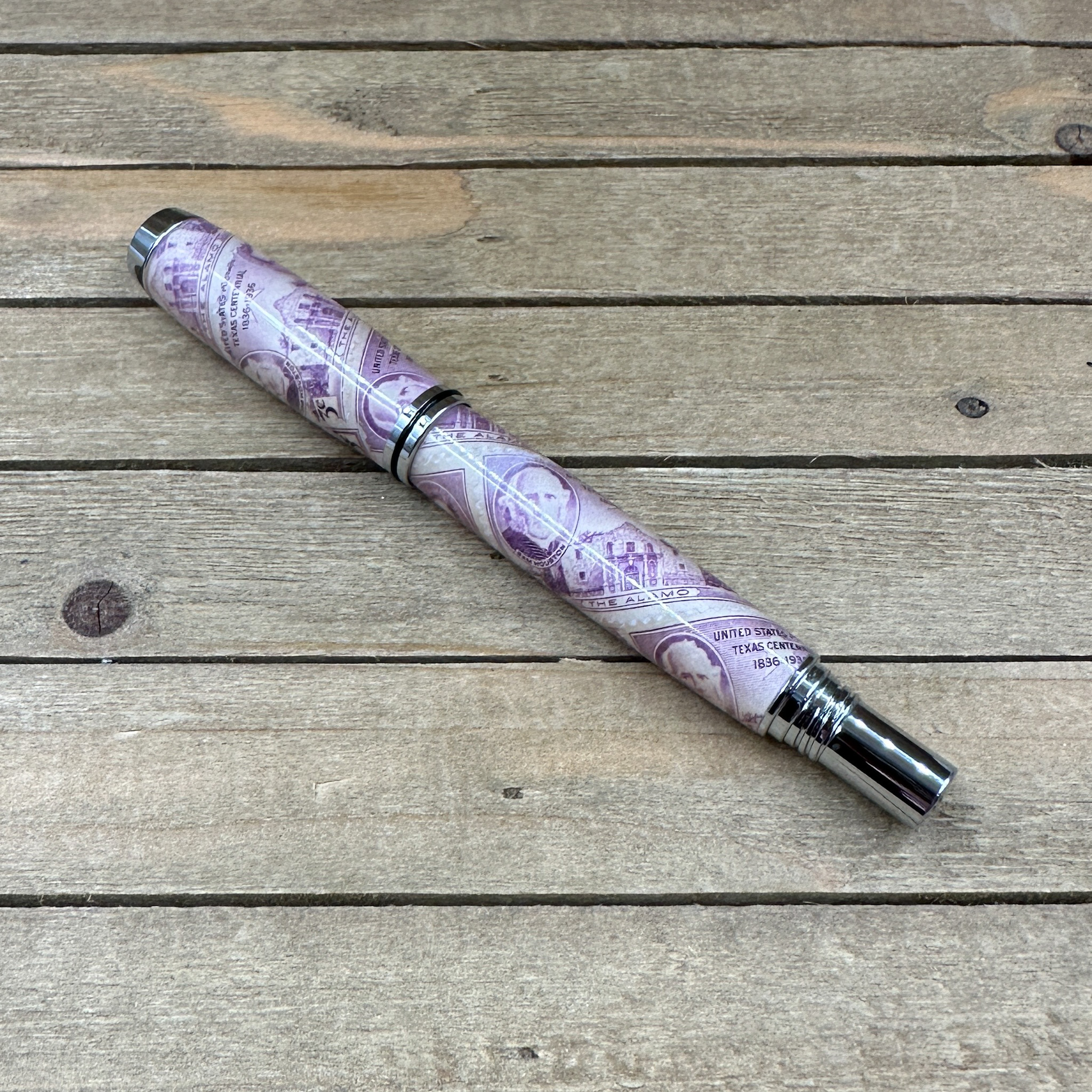 This handcrafted capped rollerball pen features authentic "Texas Centennial 3c" commemorative postage stamps, preserved in clear epoxy resin and paired with sleek polished chrome hardware for a timeless, museum-quality finish. Each pen is individually turned and polished by hand, showcasing iconic Texas history in a functional work of art.