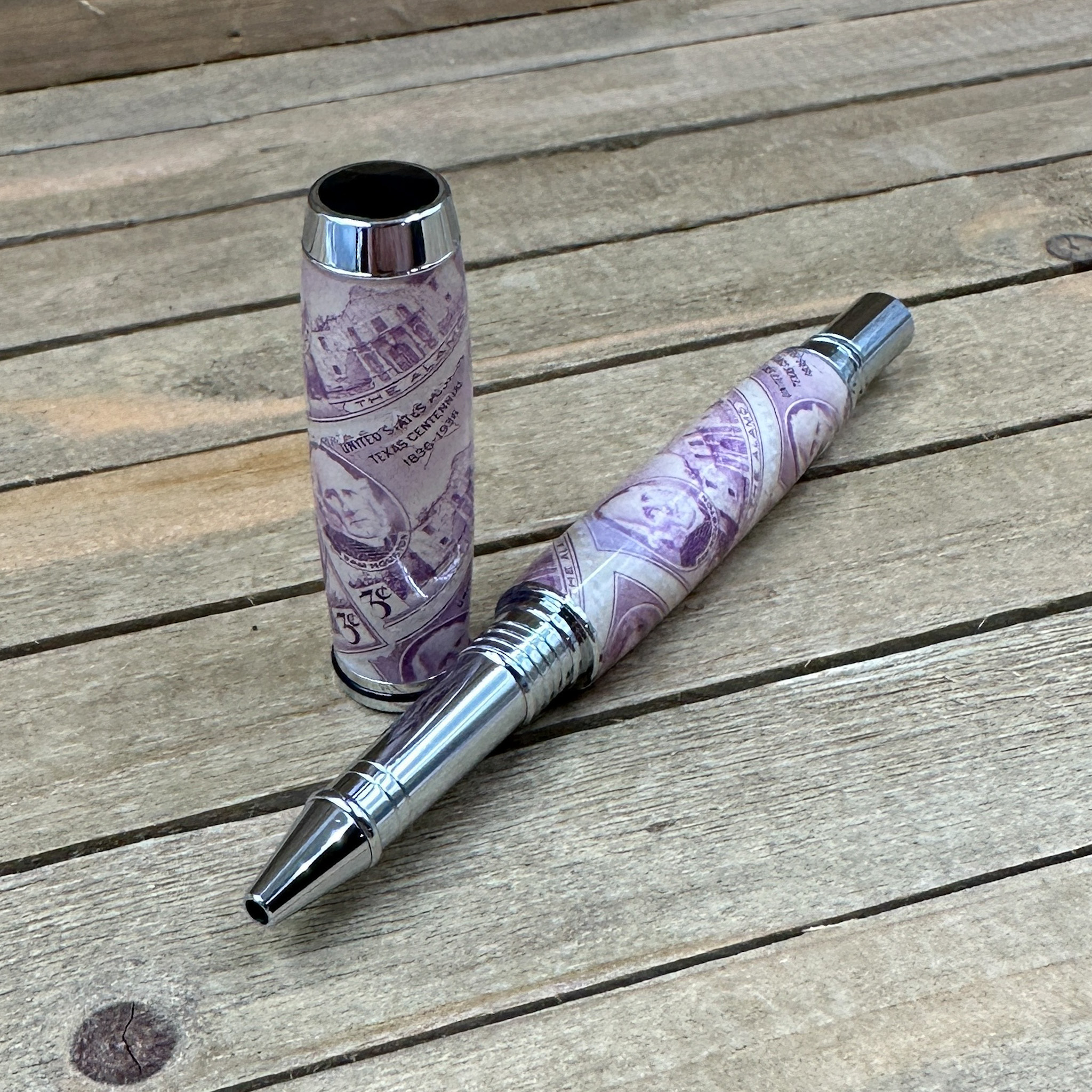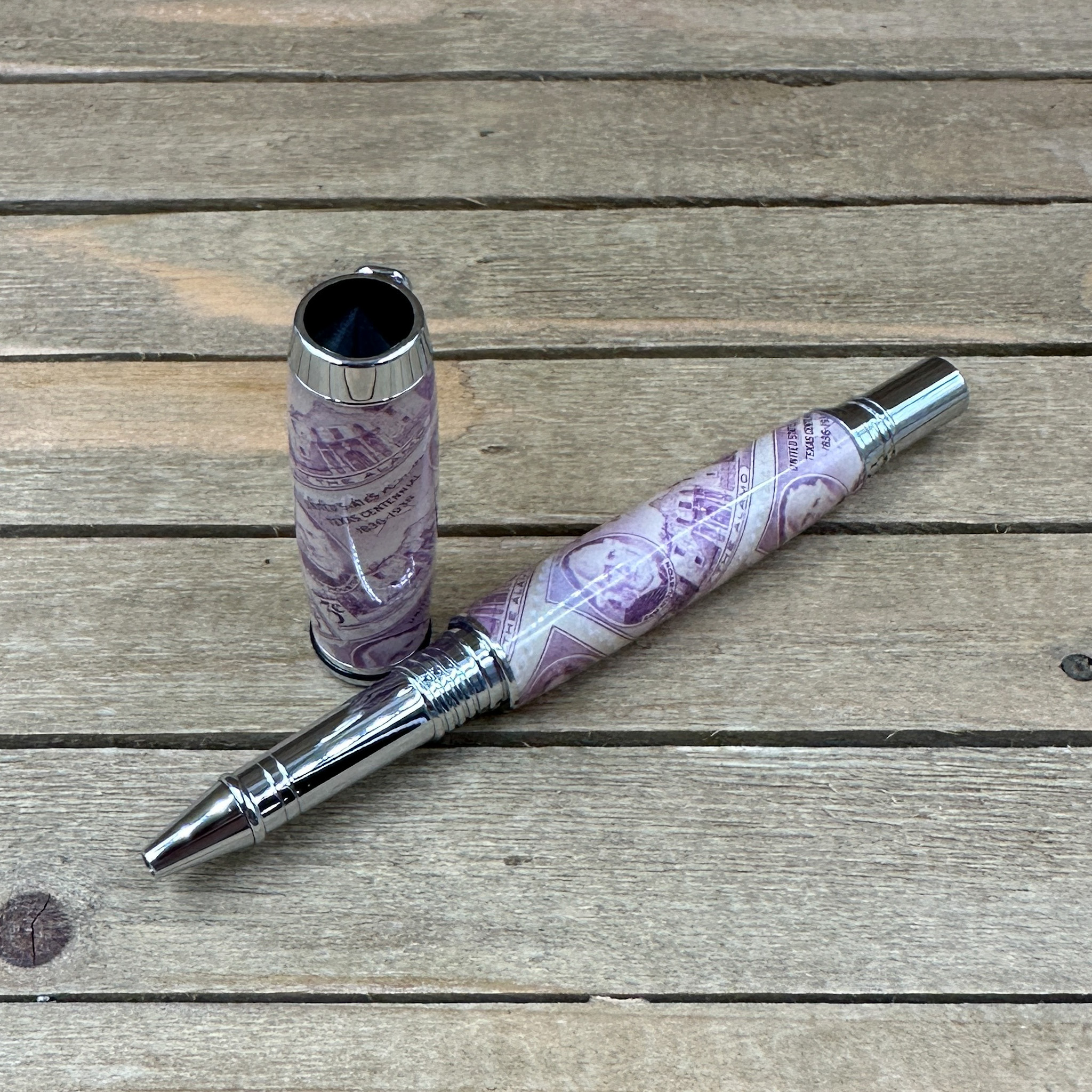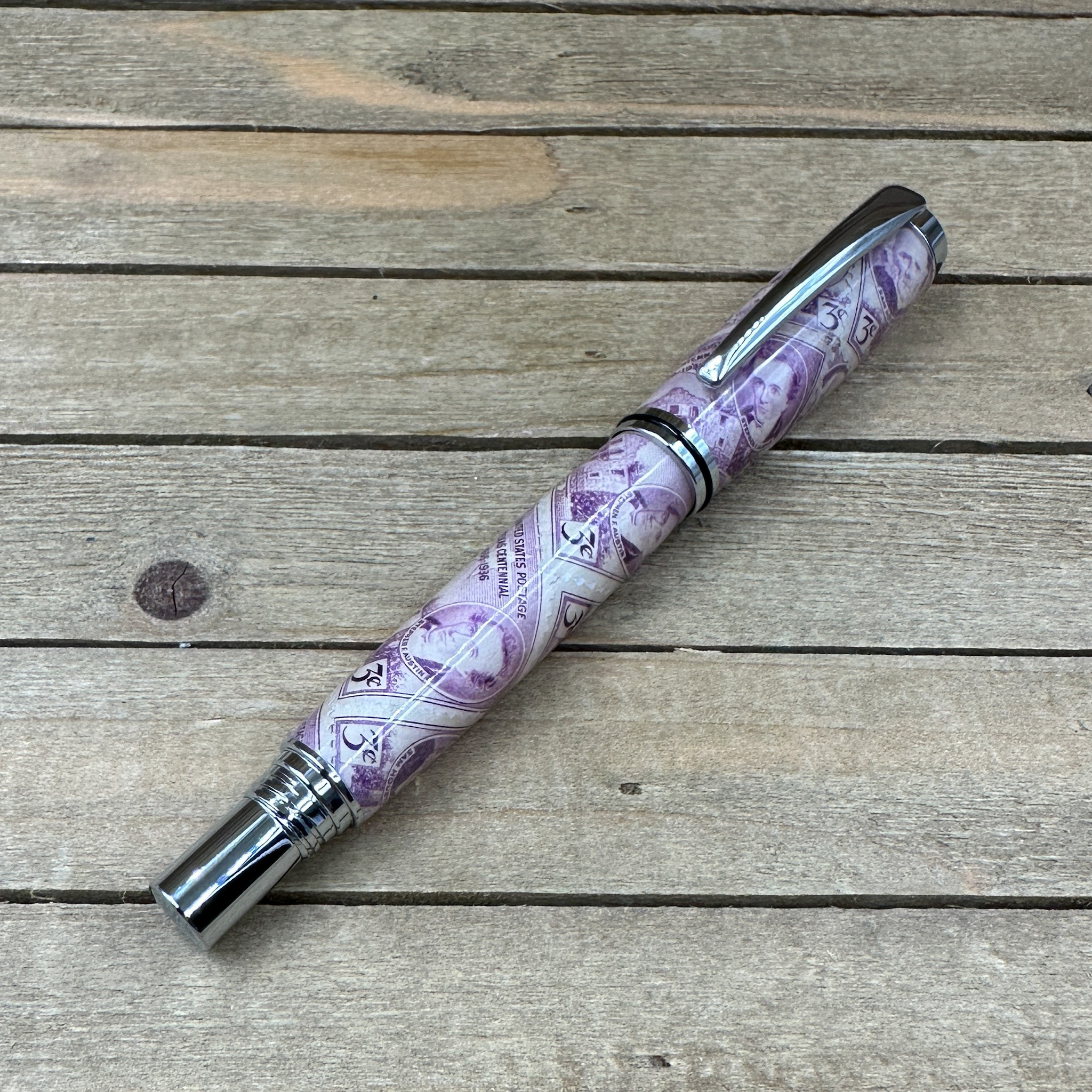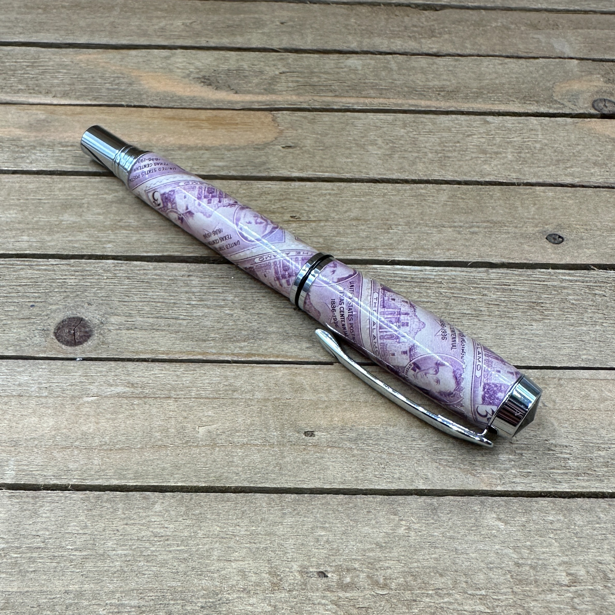 This handcrafted capped rollerball pen features authentic "Texas Centennial 3c" commemorative postage stamps, preserved in clear epoxy resin and paired with sleek polished chrome hardware for a timeless, museum-quality finish. Each pen is individually turned and polished by hand, showcasing iconic Texas history in a functional work of art.