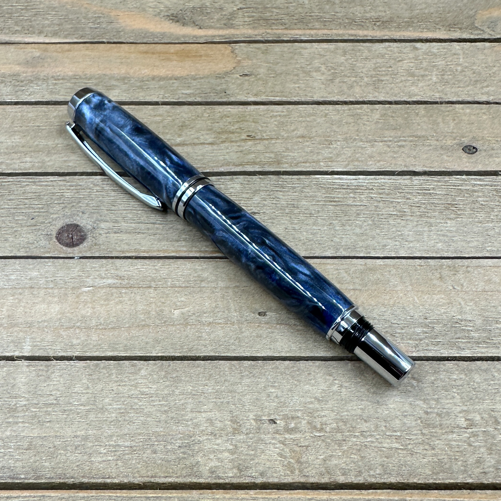 The body of this pen is crafted from a unique, deep-pour resin blend featuring deep navy blue swirling with accents of storm gray. The distinctive, shimmering pattern ensures that no two pens are exactly alike—making this a truly one-of-a-kind accessory for your desk or pocket.
