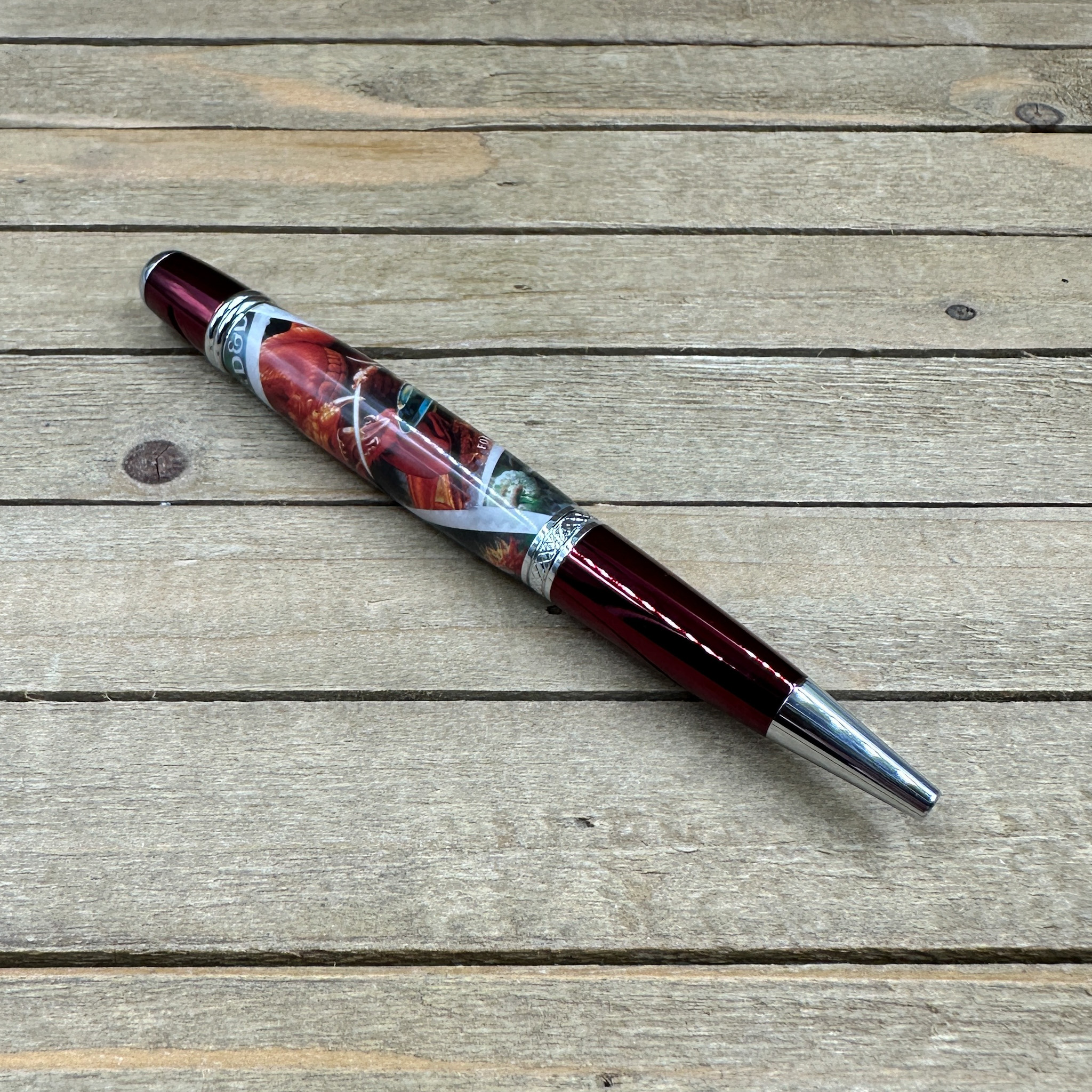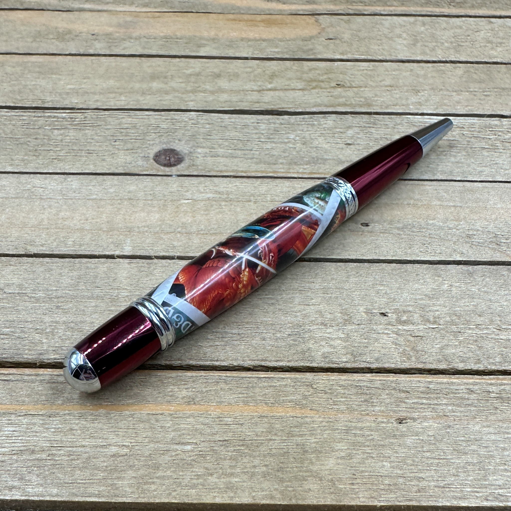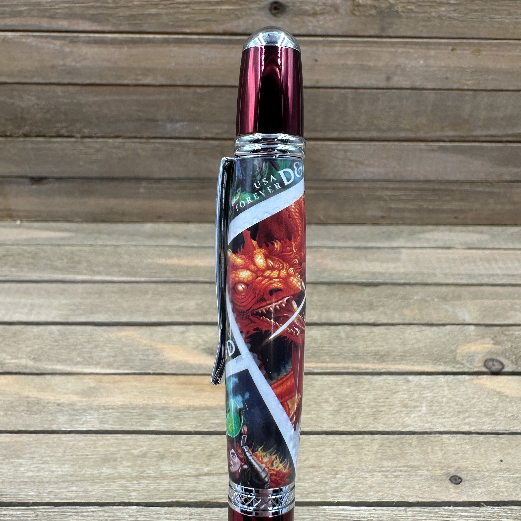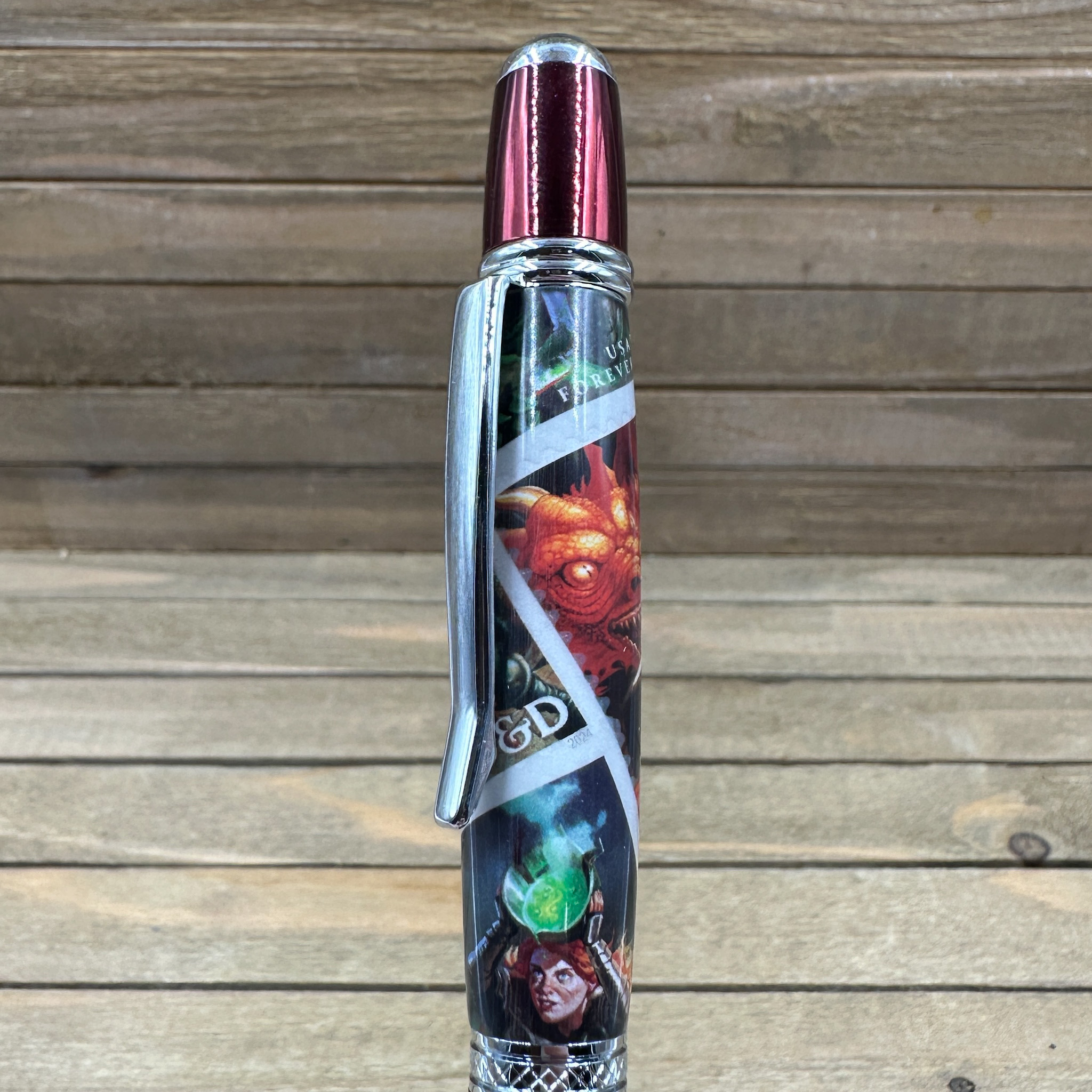 Bring your love of adventure to the tabletop — and your desk. This handcrafted Sierra-style ballpoint pen features authentic DnD postage stamps, carefully cast in crystal-clear resin for a stunning and durable finish. The iconic D&D imagery is permanently preserved within the pen body, making each piece a unique collectible that celebrates imagination and storytelling.