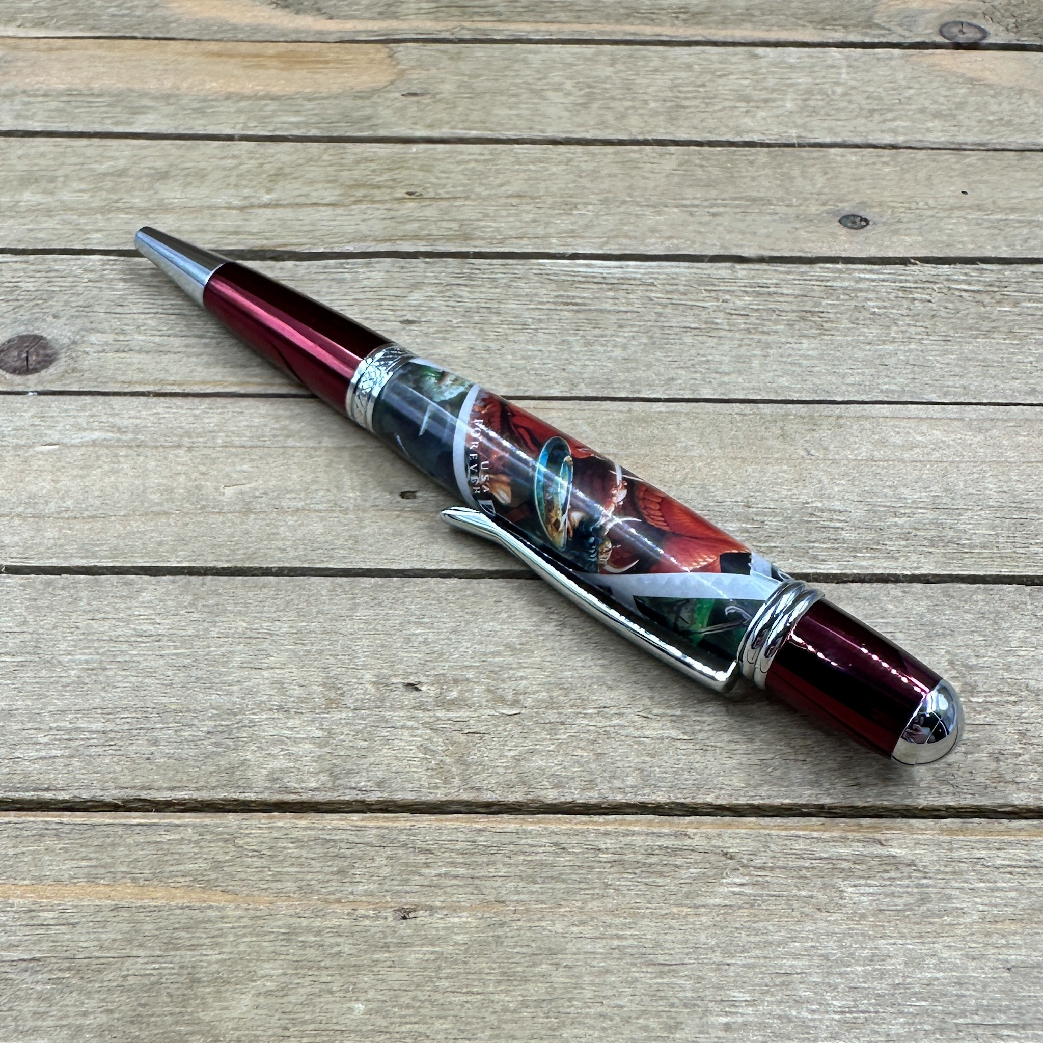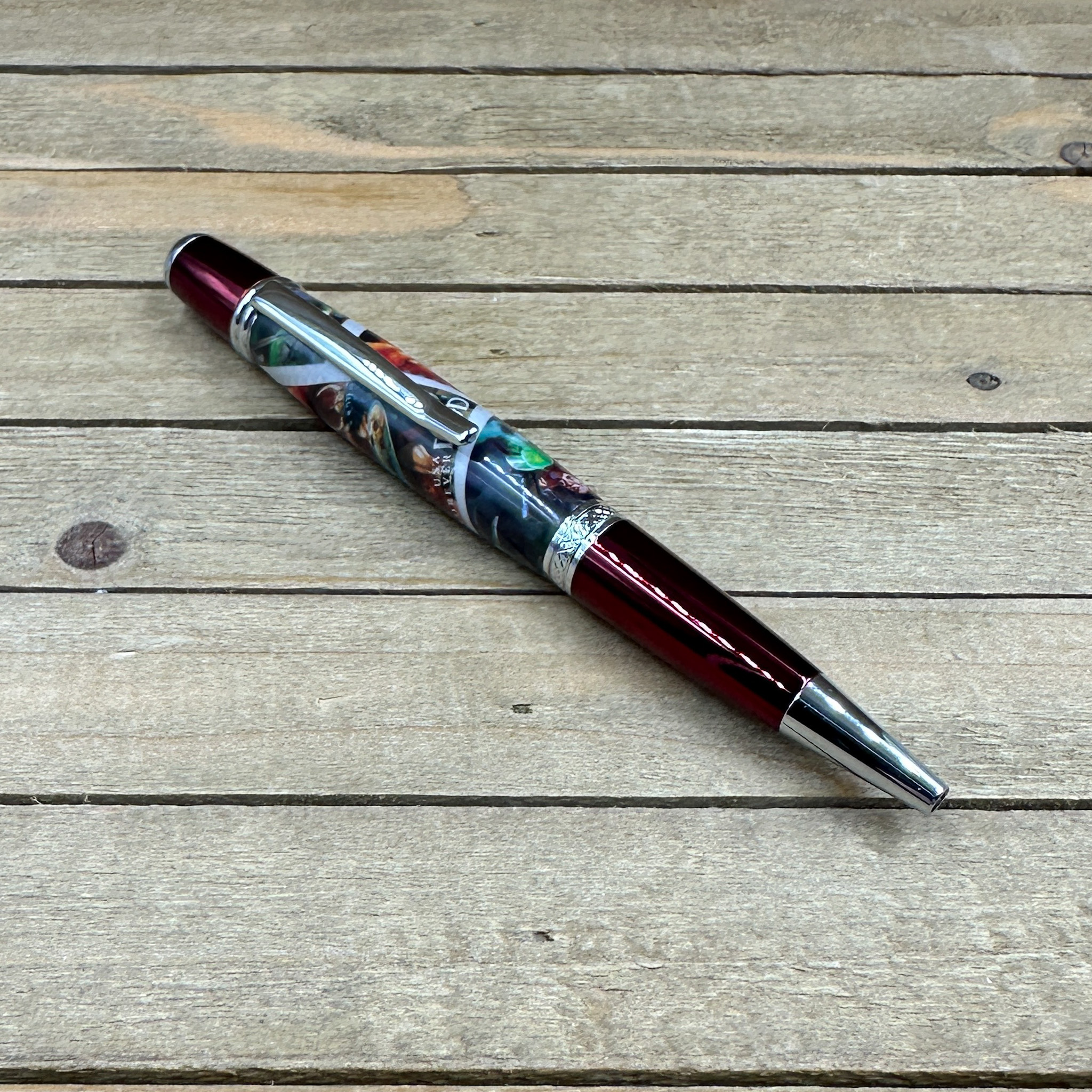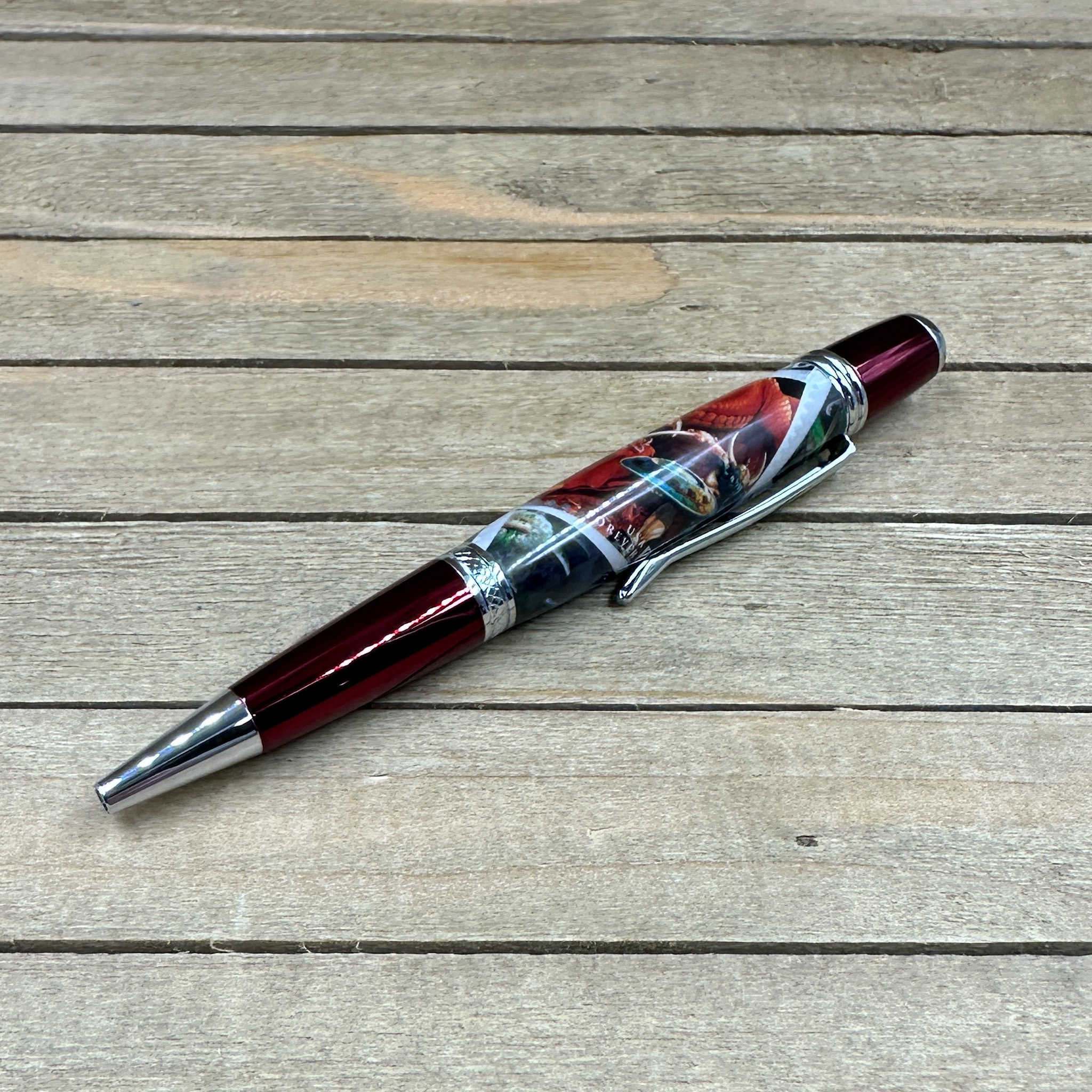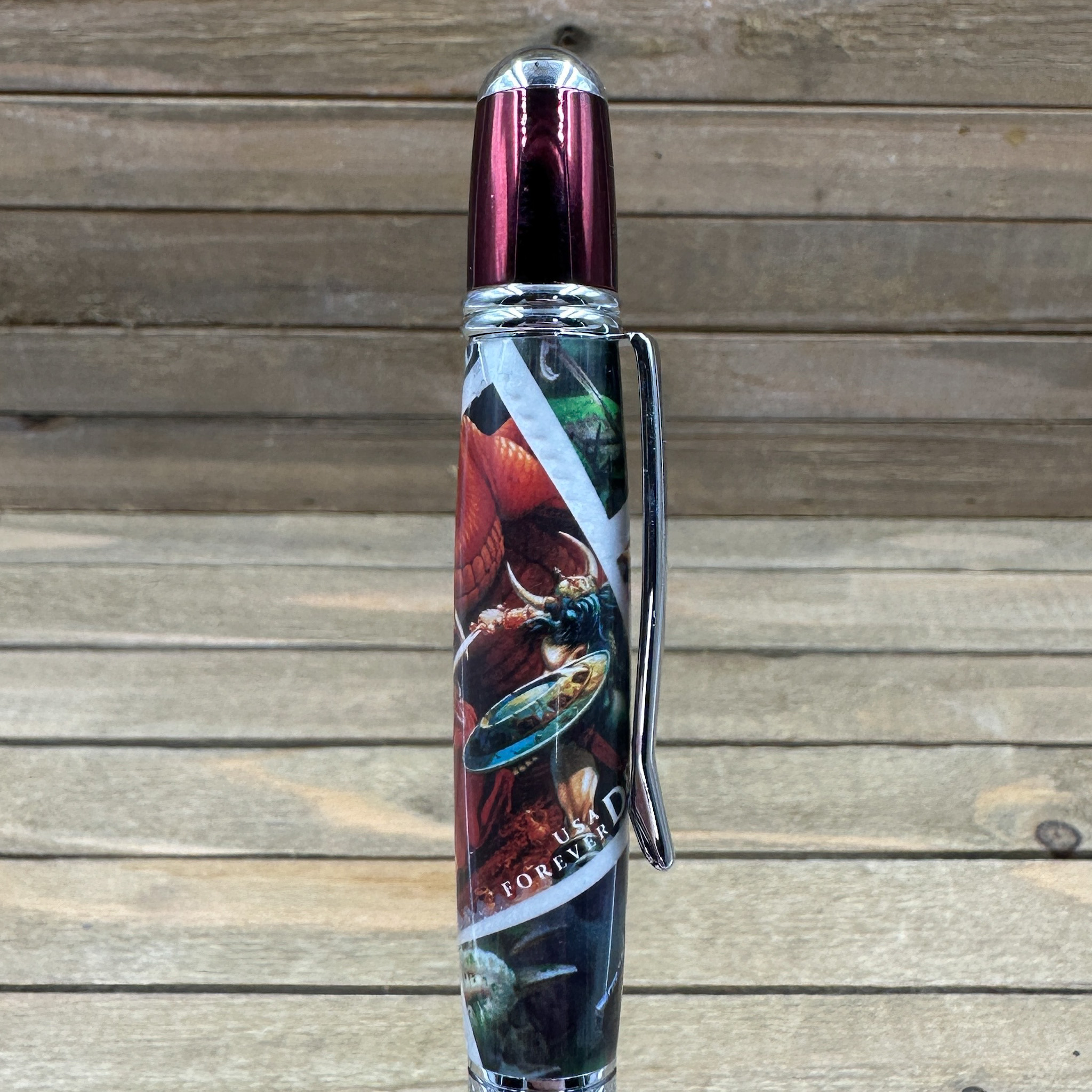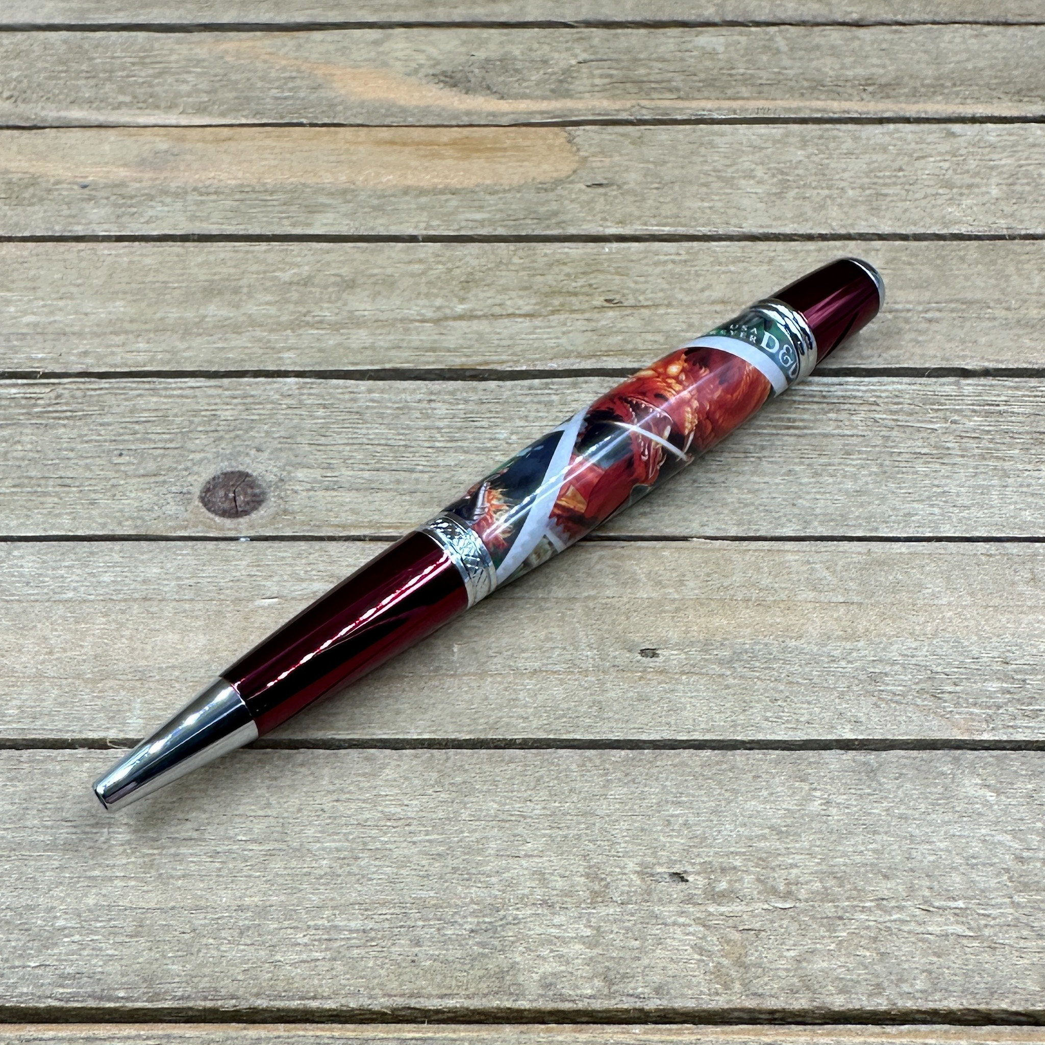 Bring your love of adventure to the tabletop — and your desk. This handcrafted Sierra-style ballpoint pen features authentic DnD postage stamps, carefully cast in crystal-clear resin for a stunning and durable finish. The iconic D&D imagery is permanently preserved within the pen body, making each piece a unique collectible that celebrates imagination and storytelling.