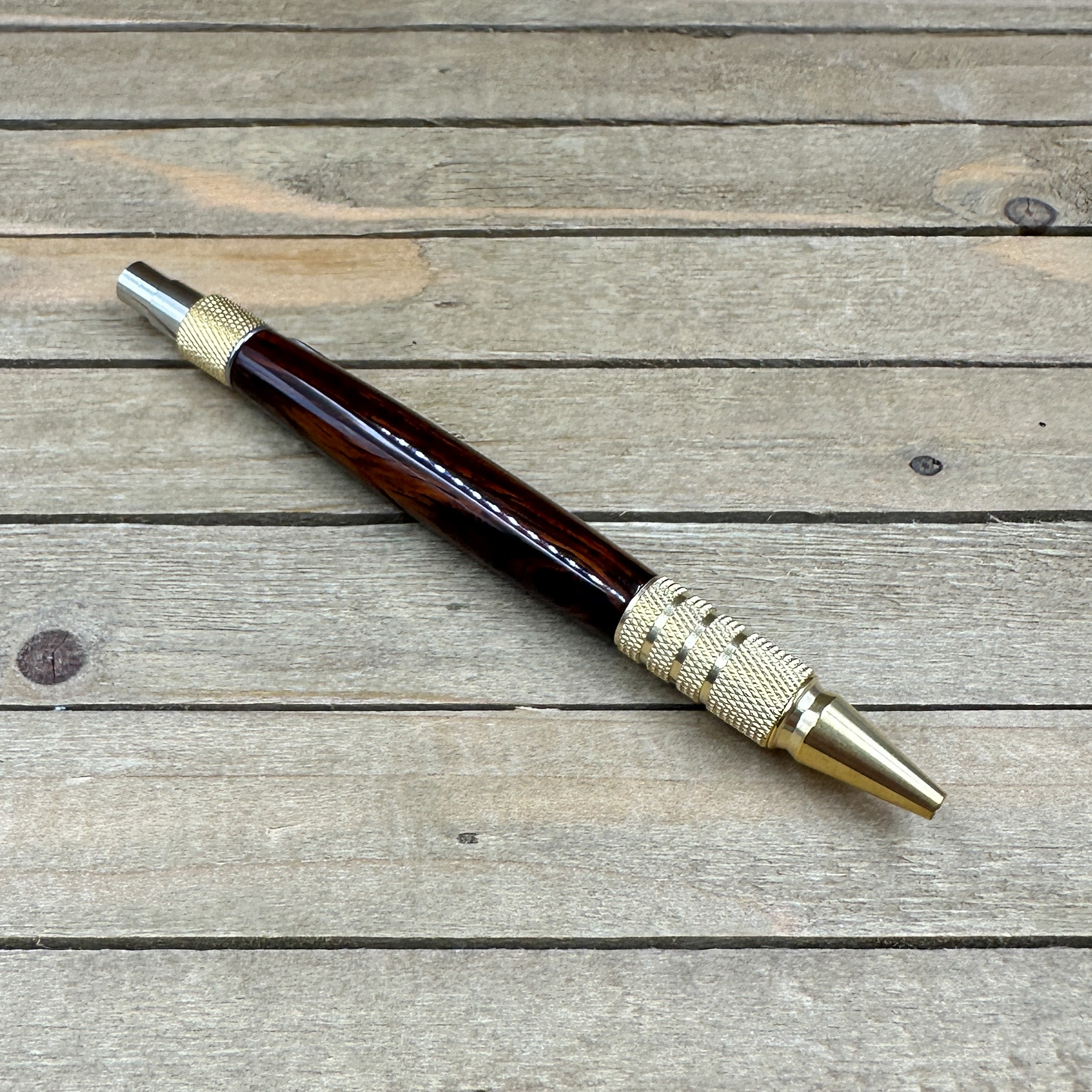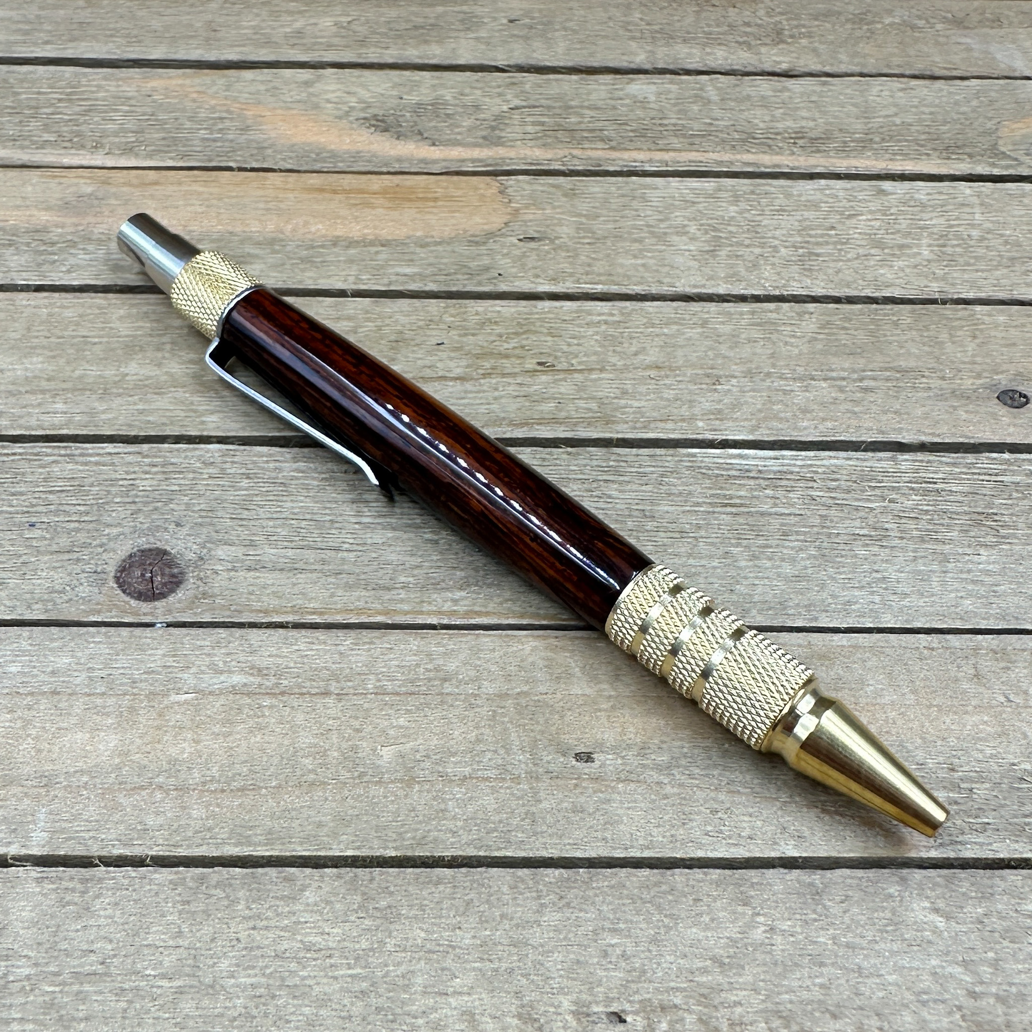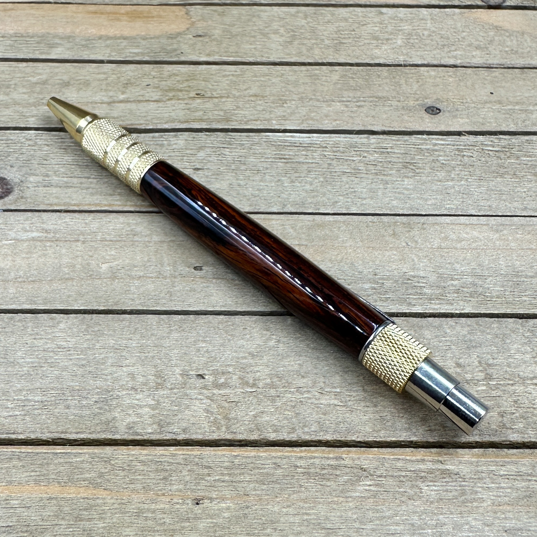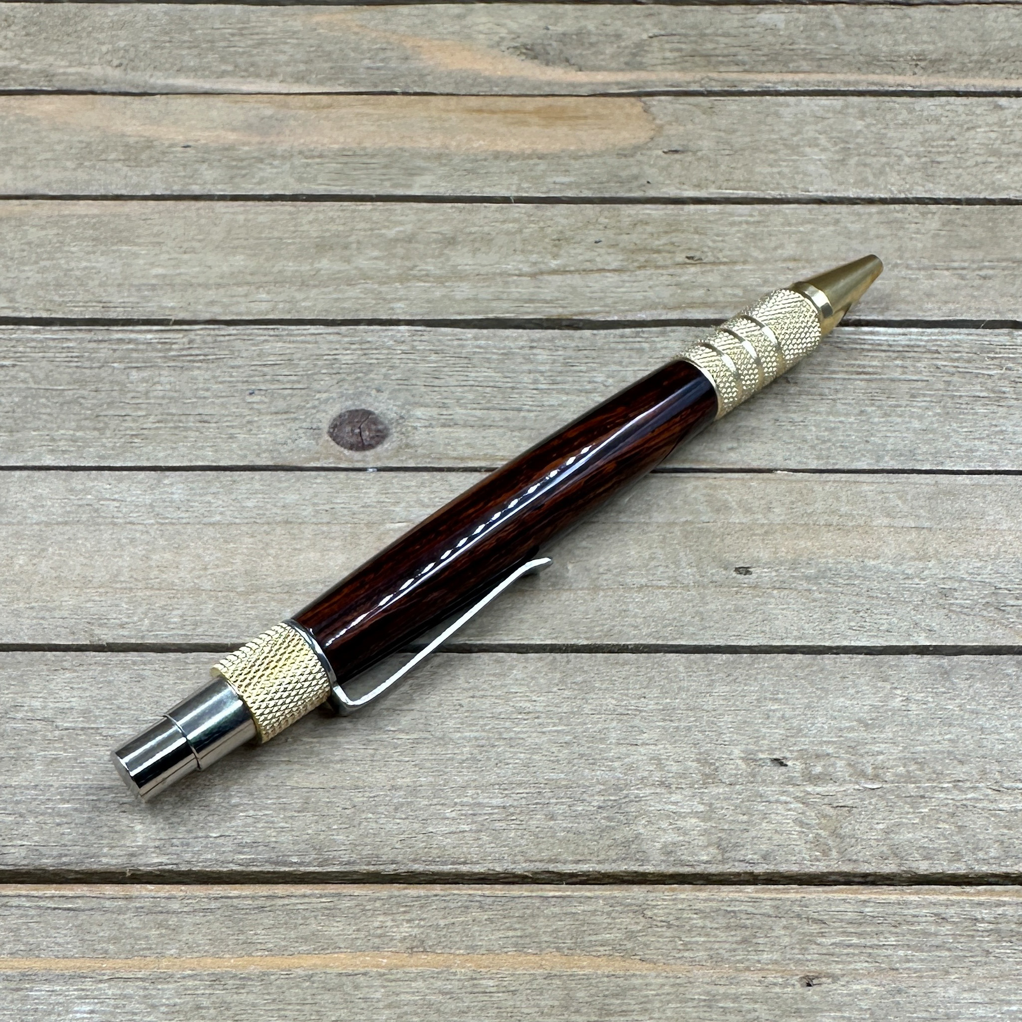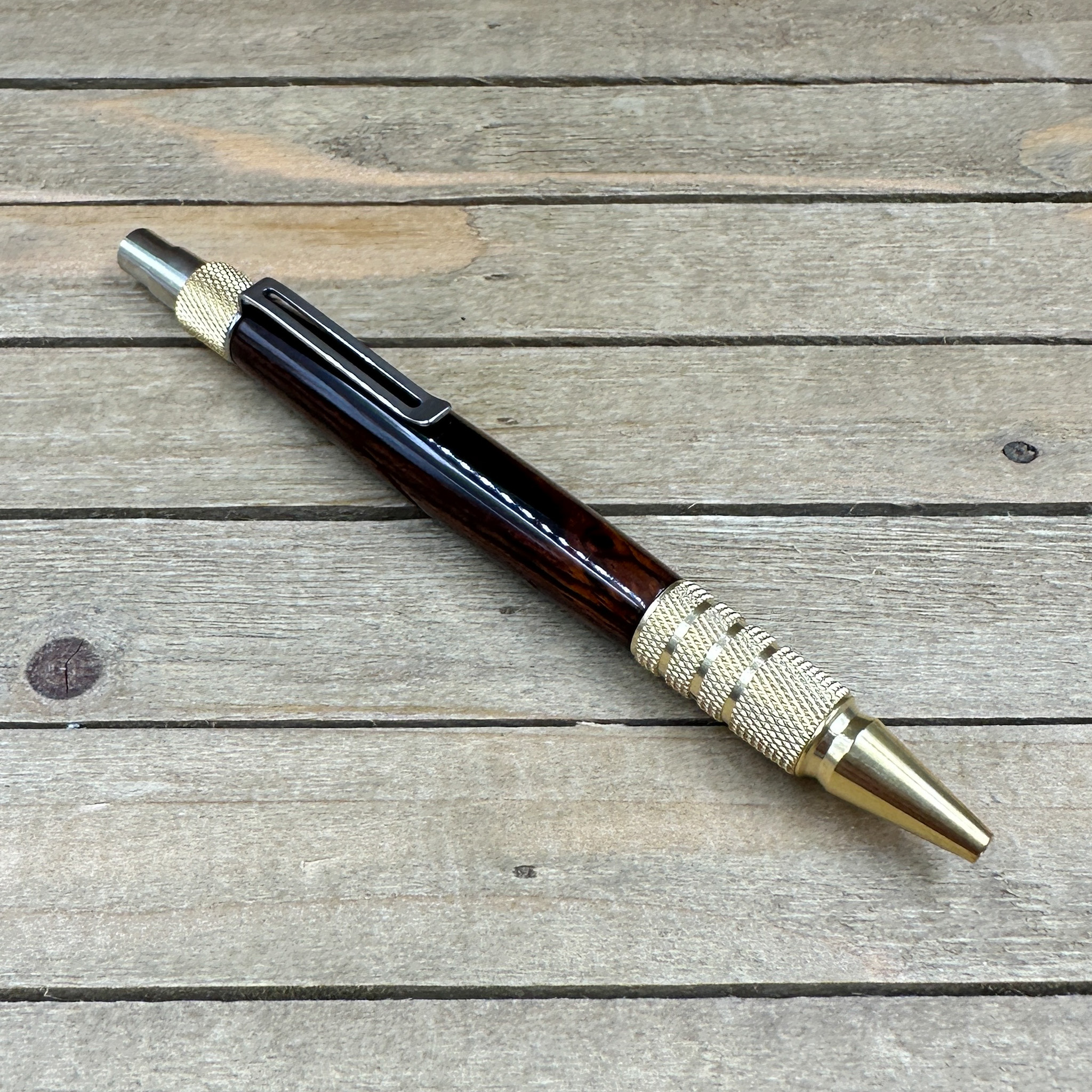 Built for daily use, crafted for a lifetime. This handcrafted everyday carry click pen features richly grained Cocobolo wood, known for its deep reddish-brown hues and striking natural patterns. Finished to a glossy polish and paired with durable brass hardware, this pen combines warmth, balance, and rugged elegance.