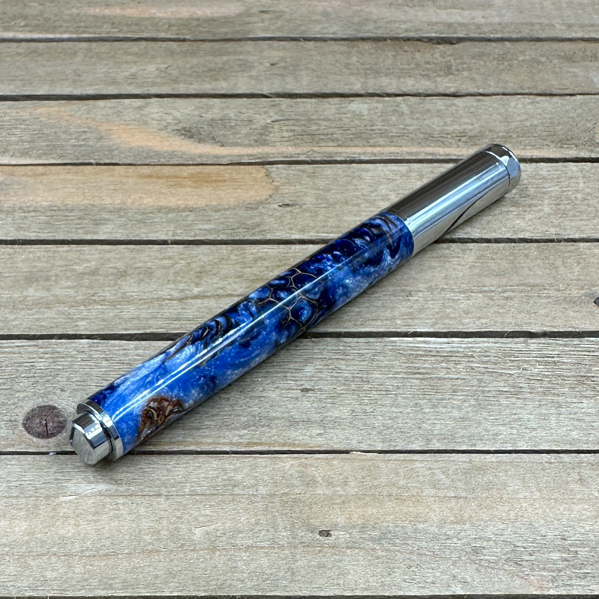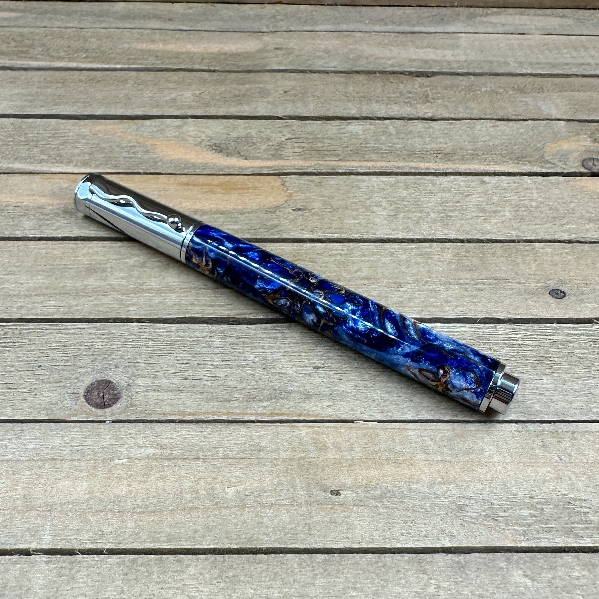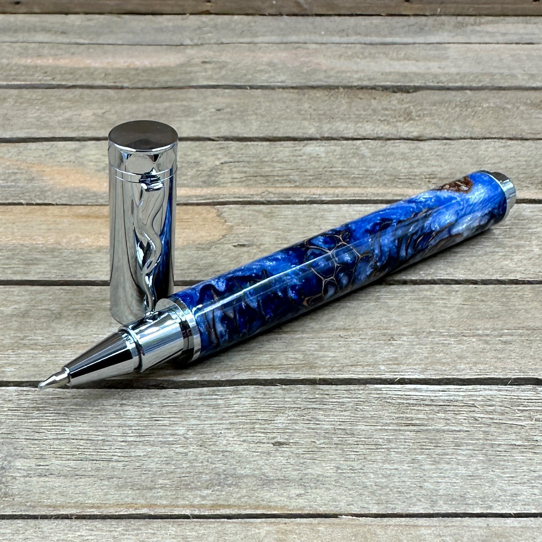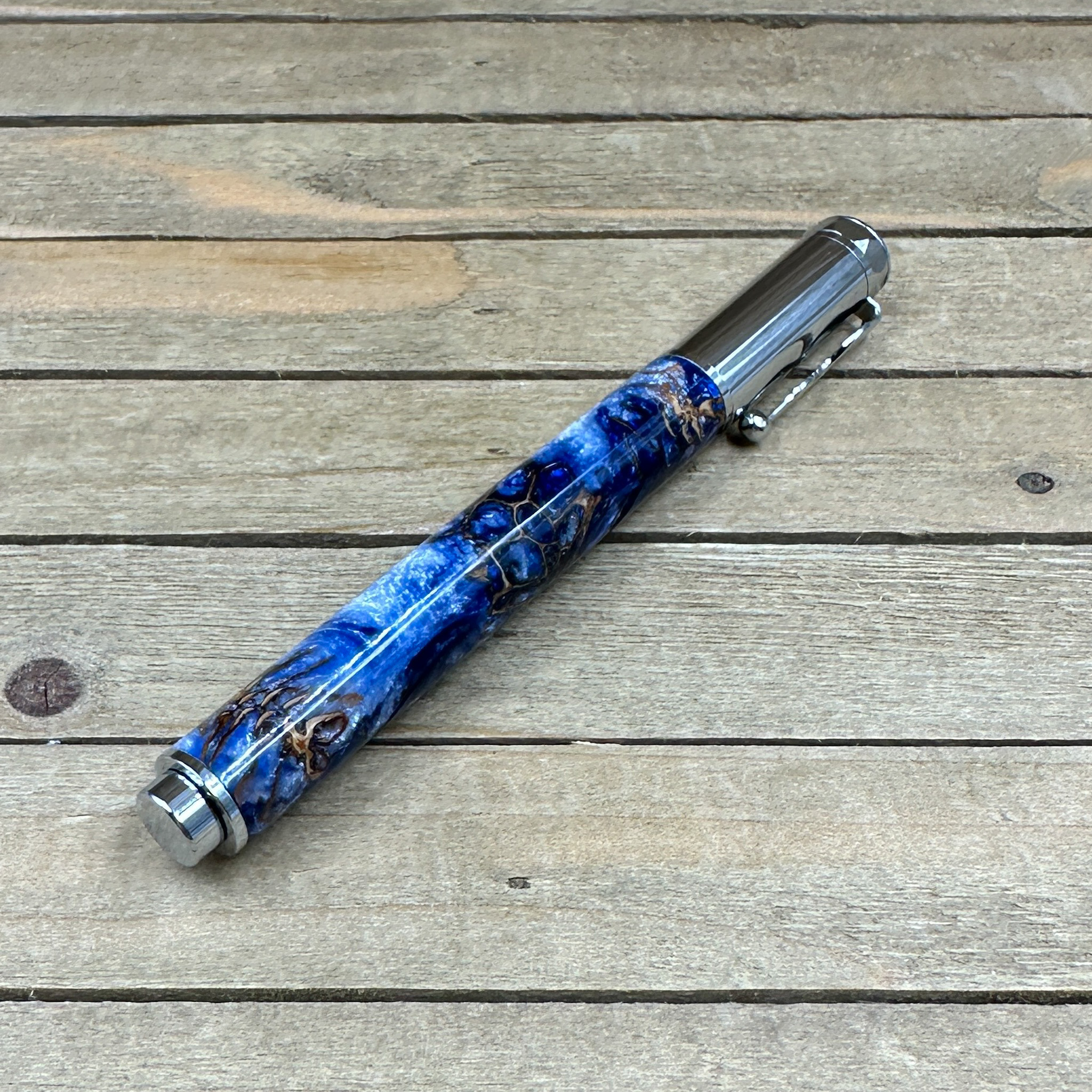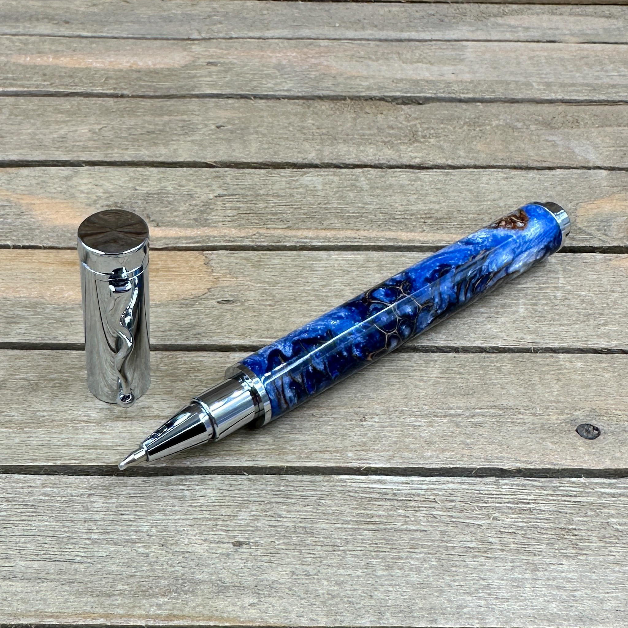 Bring nature and elegance together with this stunning handcrafted rollerball pen, made from blue and silver resin infused with real sweet gumball seed pods and pinecones. Each piece of natural material is carefully cast in high-quality resin, creating a unique, organic texture that shimmers with depth and character.