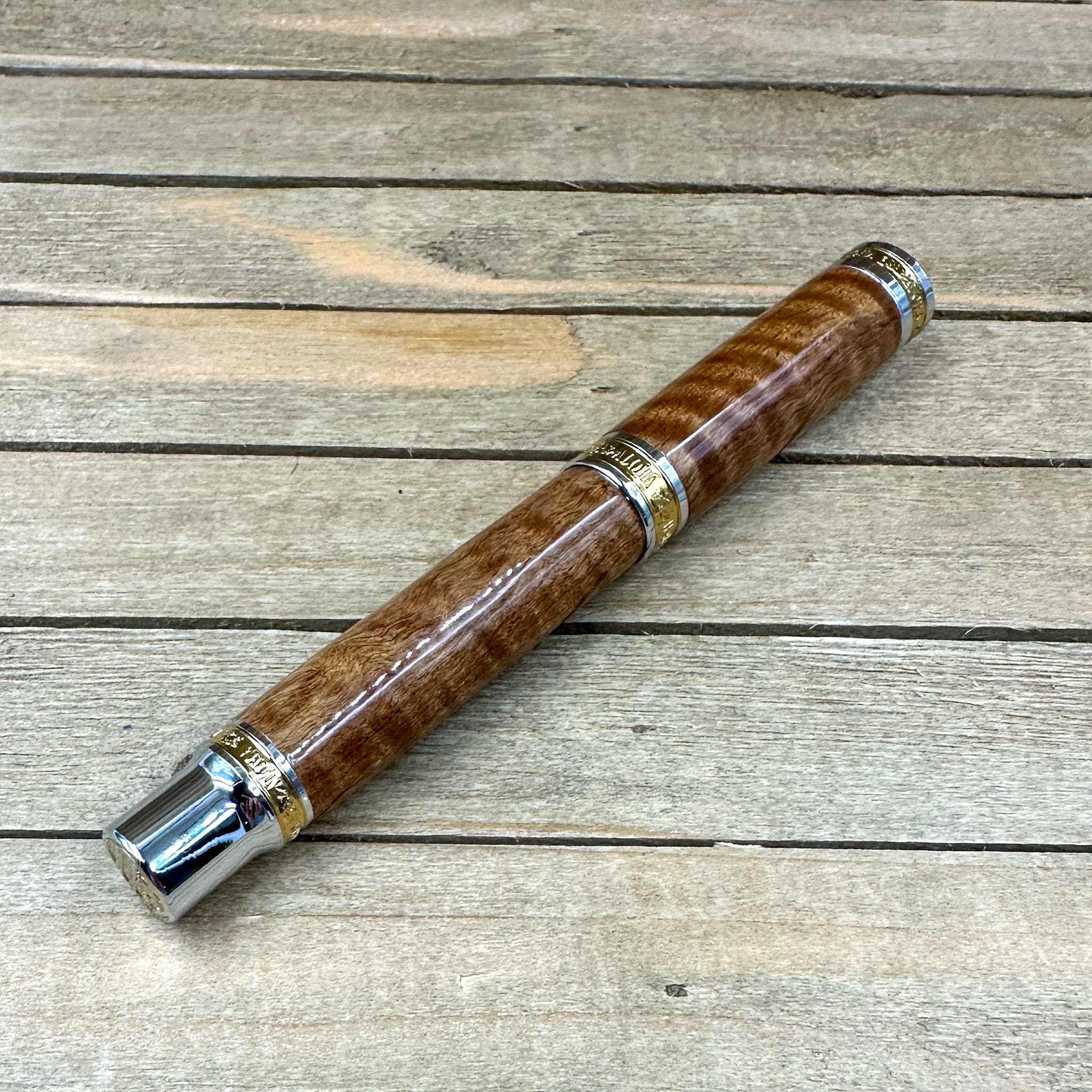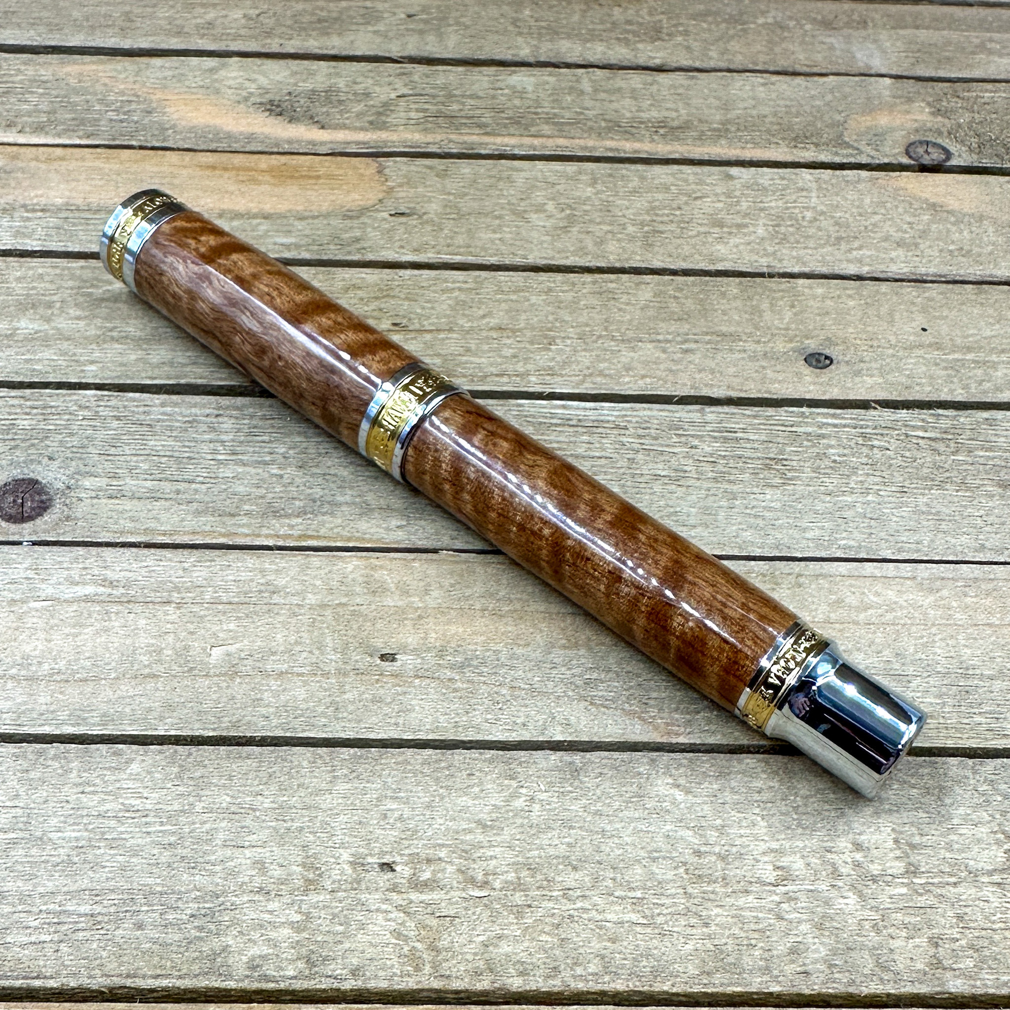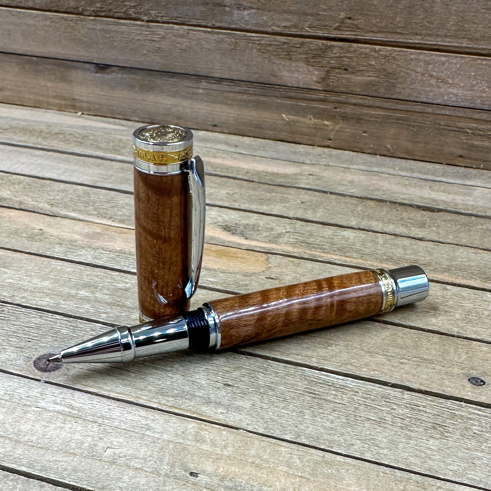 This handcrafted large capped rollerball pen features stunning curly satinwood, accented with a Hawaiian-inspired theme and finished with sleek polished chrome hardware for a bold, elegant look. The shimmering curl and golden tones of satinwood create a warm, tropical feel, making this pen a true statement piece. The center band features "Aloha" script while the cap features the breathtaking Diamondhead View. The bottom of the pen features the Hawaiian flag.