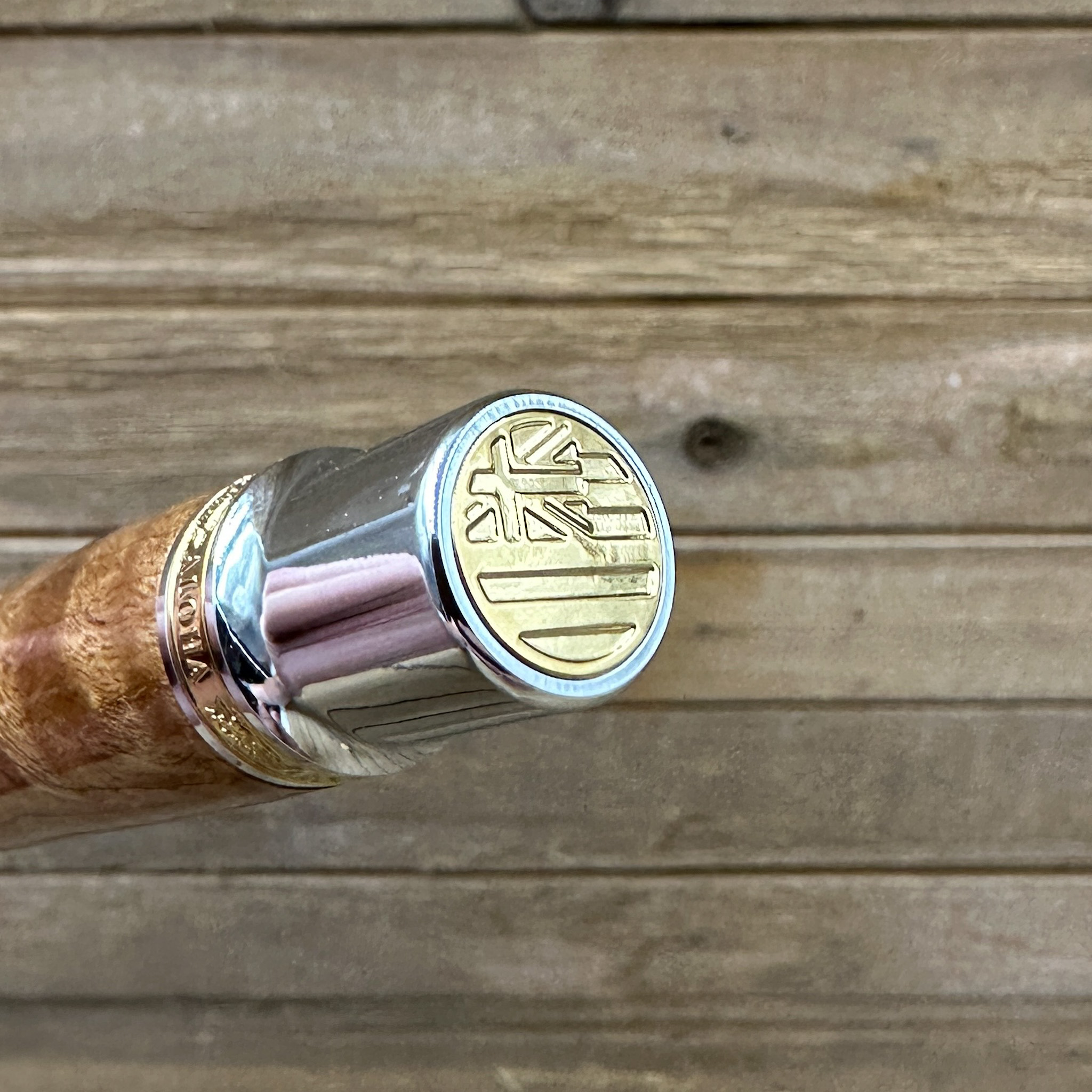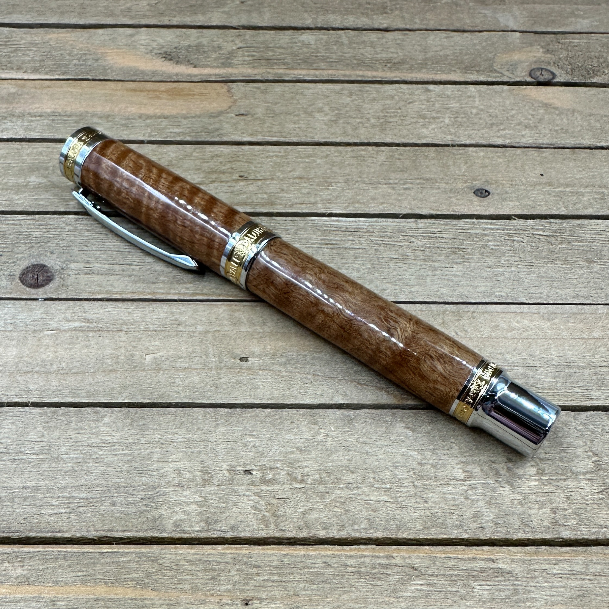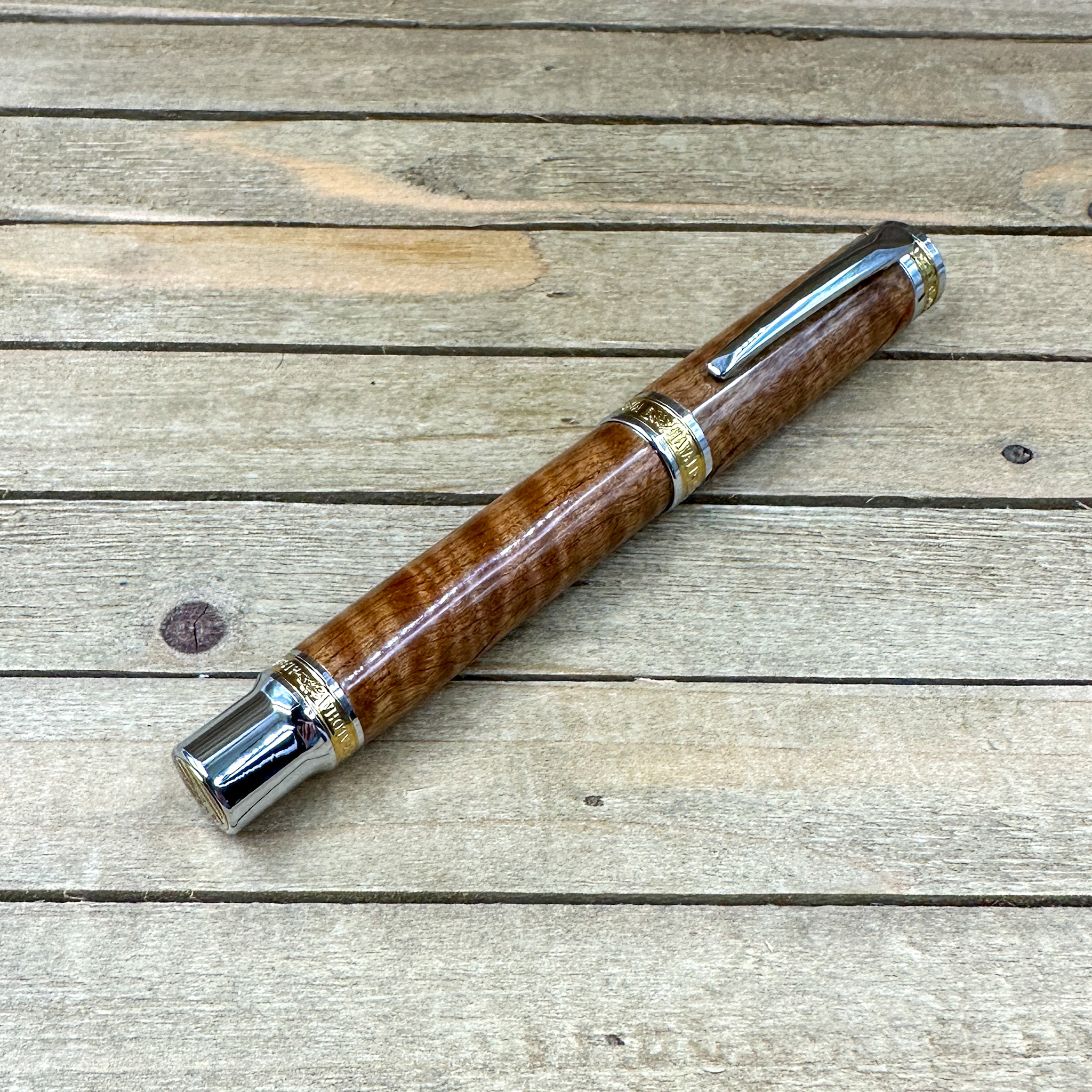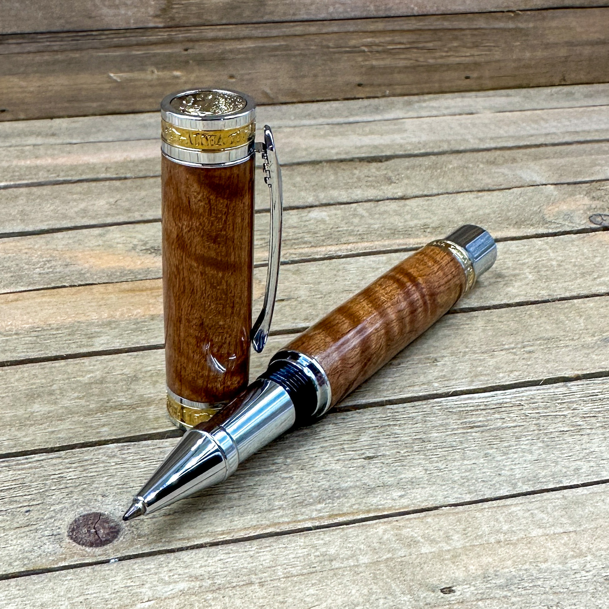 This handcrafted large capped rollerball pen features stunning curly satinwood, accented with a Hawaiian-inspired theme and finished with sleek polished chrome hardware for a bold, elegant look. The shimmering curl and golden tones of satinwood create a warm, tropical feel, making this pen a true statement piece. The center band features "Aloha" script while the cap features the breathtaking Diamondhead View. The bottom of the pen features the Hawaiian flag.