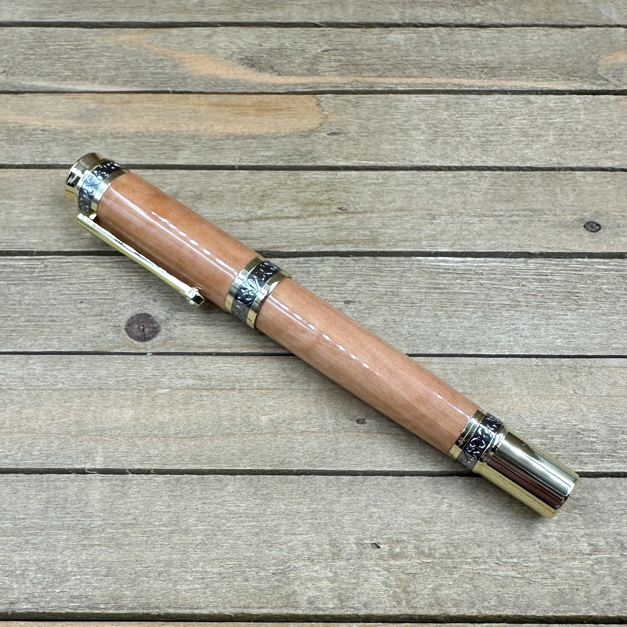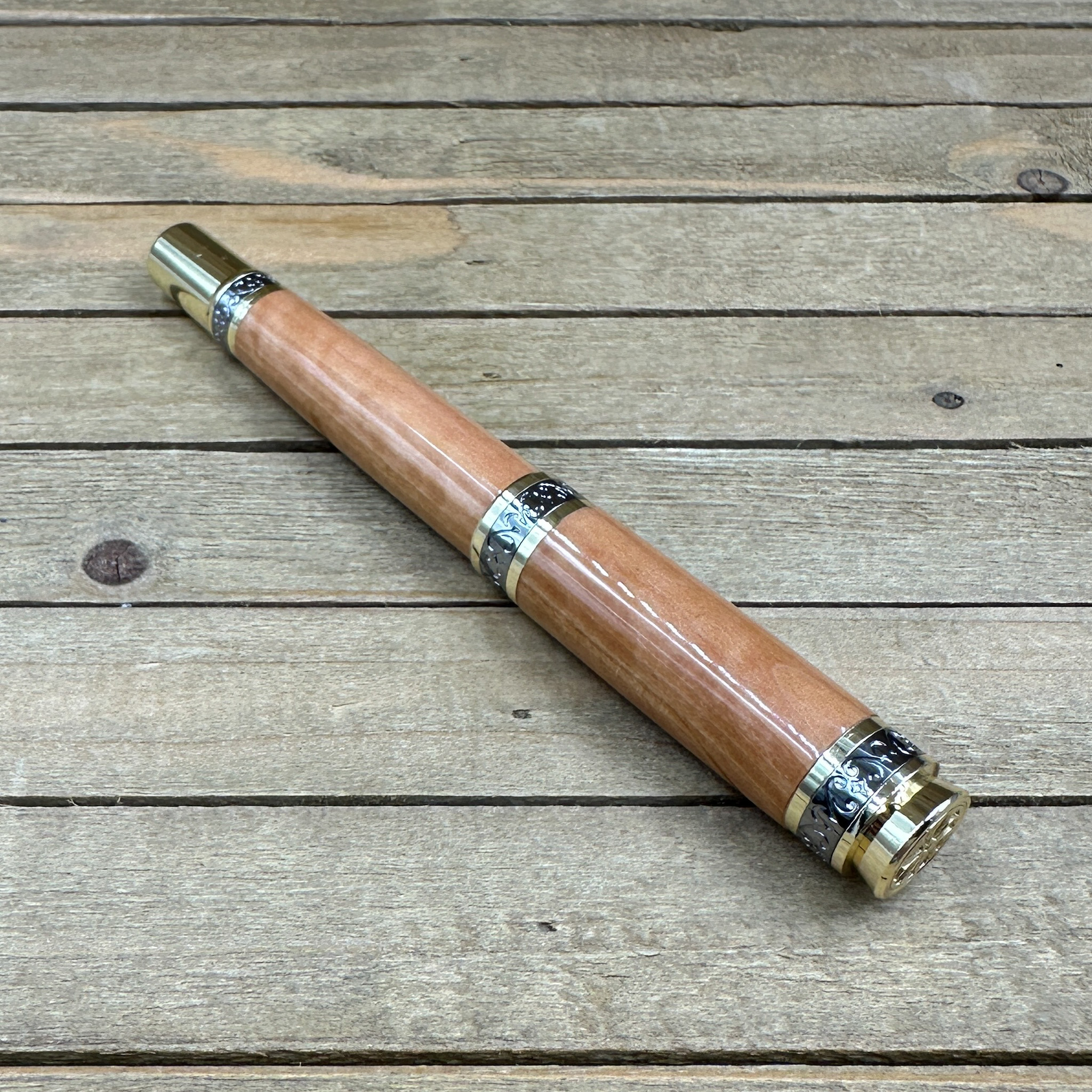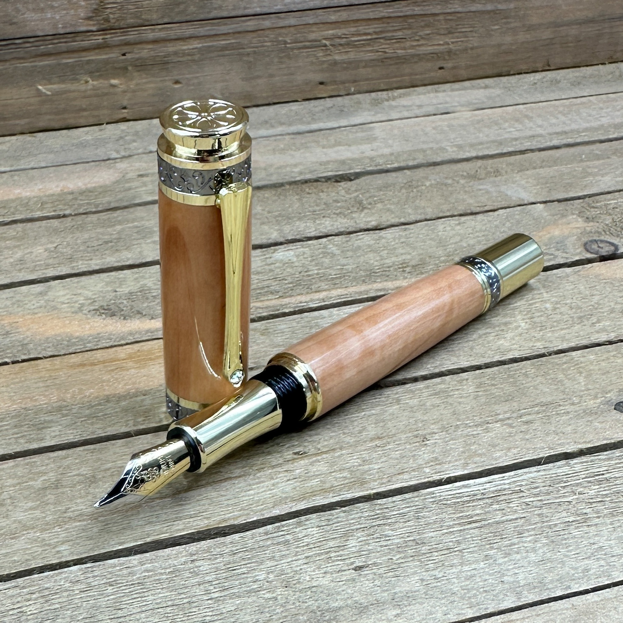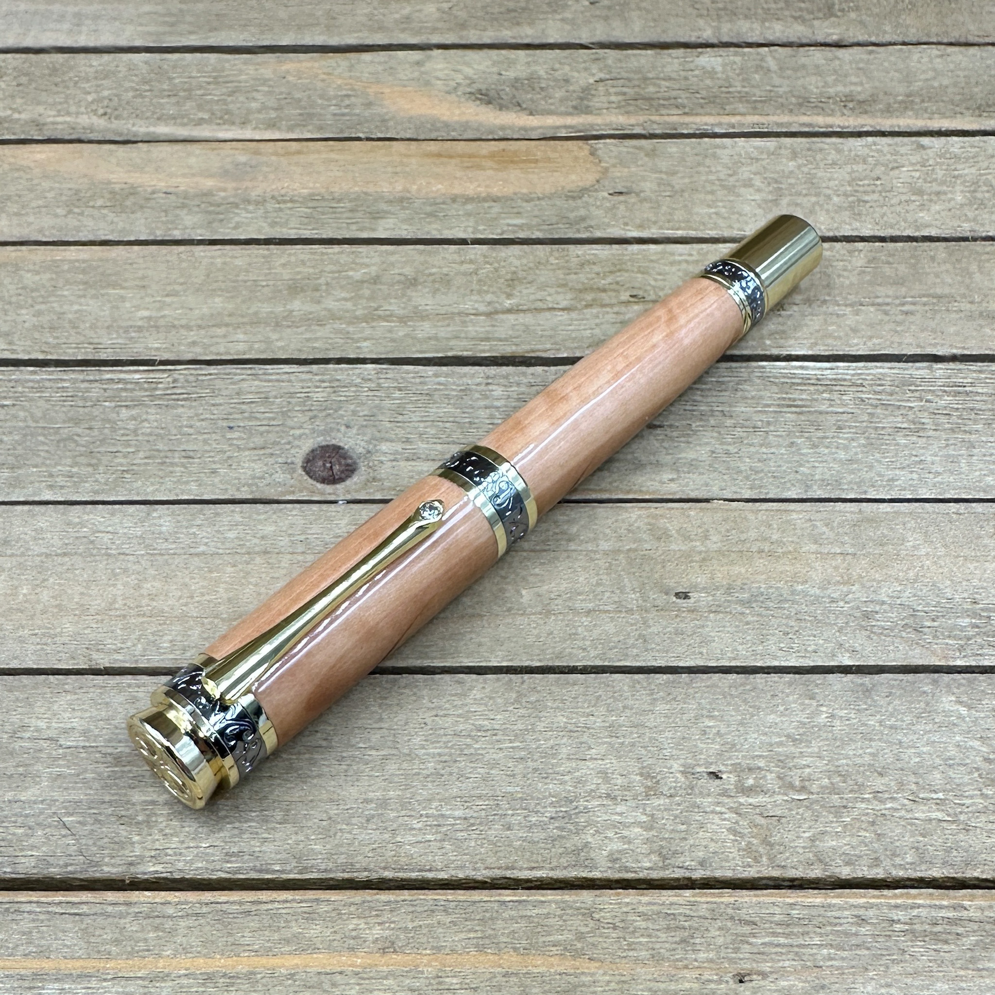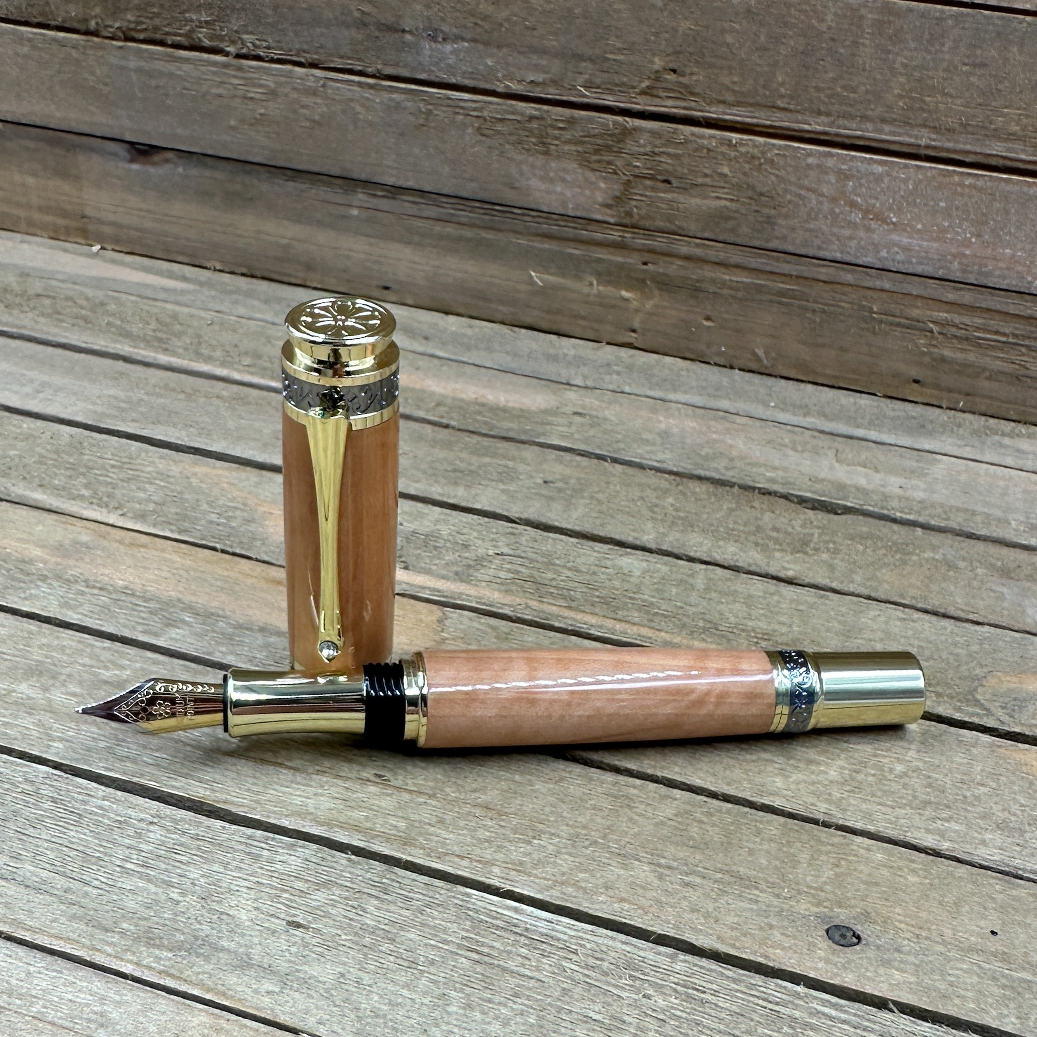 An heirloom in your hand. This Majestic Style Fountain Pen is handcrafted from curly Bradford Pear wood, a beautifully figured hardwood with flowing grain and golden highlights. Each piece is individually turned, polished, and finished to a brilliant shine — bringing out the natural curl that makes every pen unique.