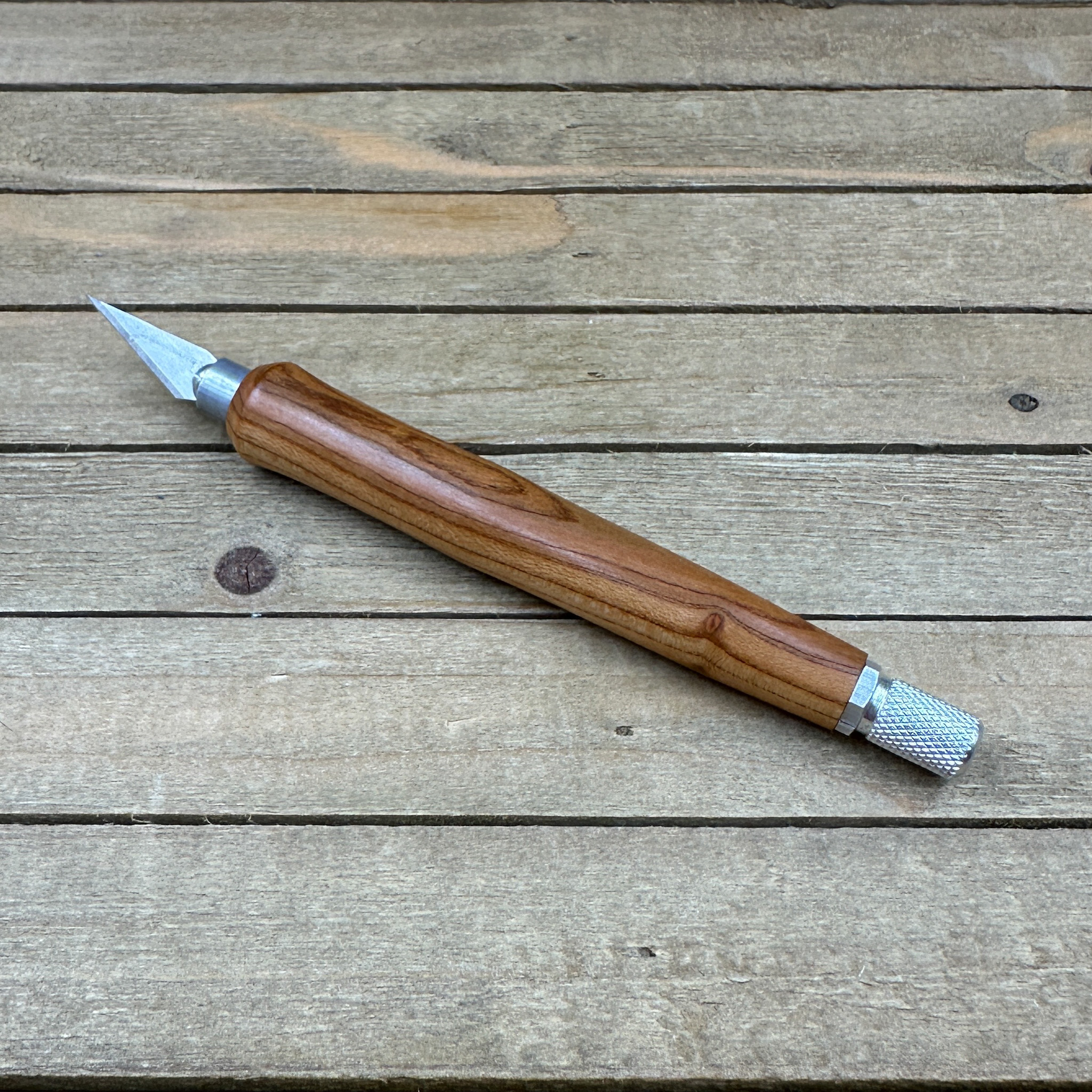 This custom handmade hobby knife, like all my other hobby knives, was personally handcrafted by me in my woodshop. These are not mass produced marking knives and each one is handcrafted by myself so you are getting a craftsman's touch and the love of their craft with each knife. Each hobby knife I craft has subtle differences making it a truly one of a kind. First, I select a piece of Bradford pear, cut it down to size to get it ready to turn on my wood lathe. Second, the newly formed blank is drilled out to fit the aluminum components and to prep it for turning. Third, it is meticulously turned down with my lathe to fit the hobby making knife components taking proper care that it transitions to the hardware perfectly. Finally, a walnut oil and wax finish is applied in multiple coats which allows you to feel the wood when you use the knife.