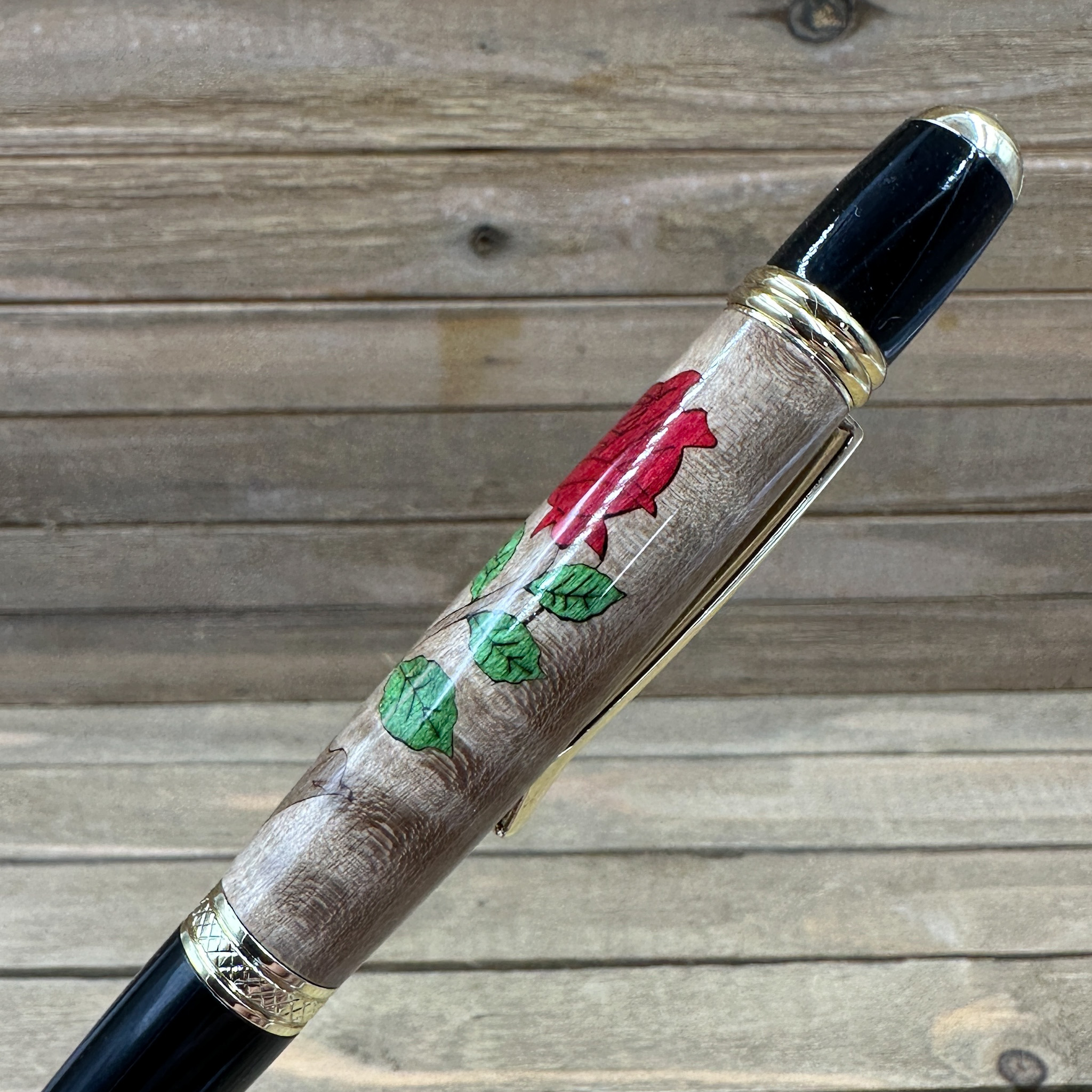 A true work of art in your hand. This handcrafted laser inlay pen features a stunning red rose design, meticulously cut and inlaid from fine woods and colored veneers. Each petal and leaf is individually set into the barrel, creating a detailed floral motif that celebrates beauty, craftsmanship, and timeless romance. This Sierra style pen is made with gold plated components with black chrome accents.