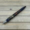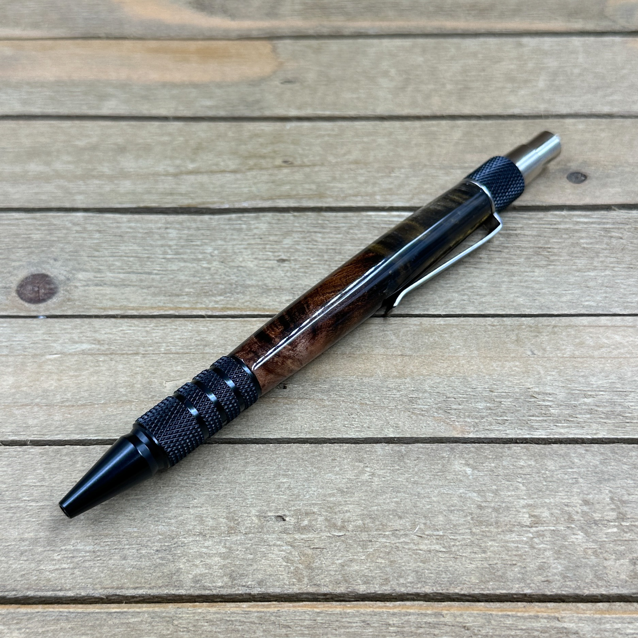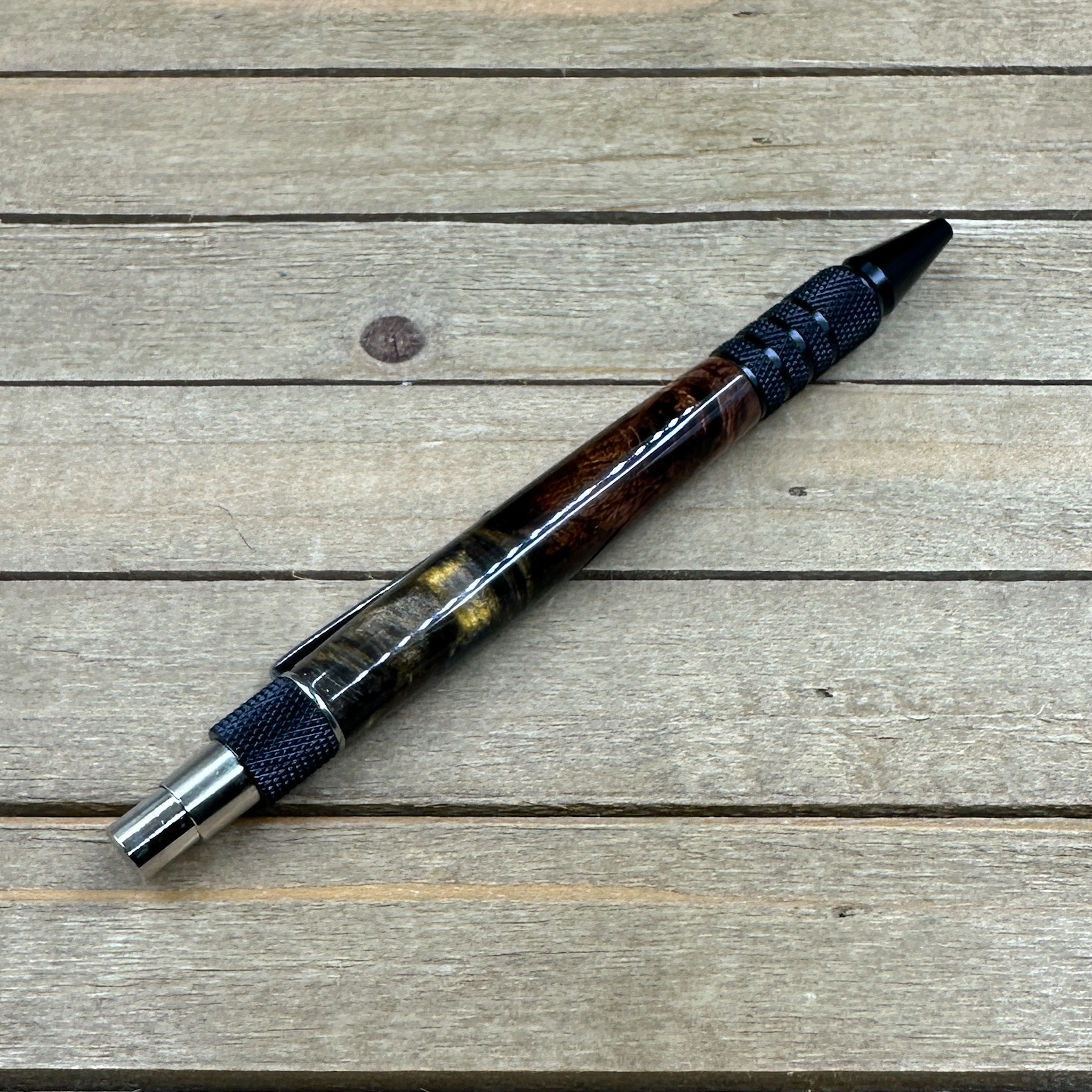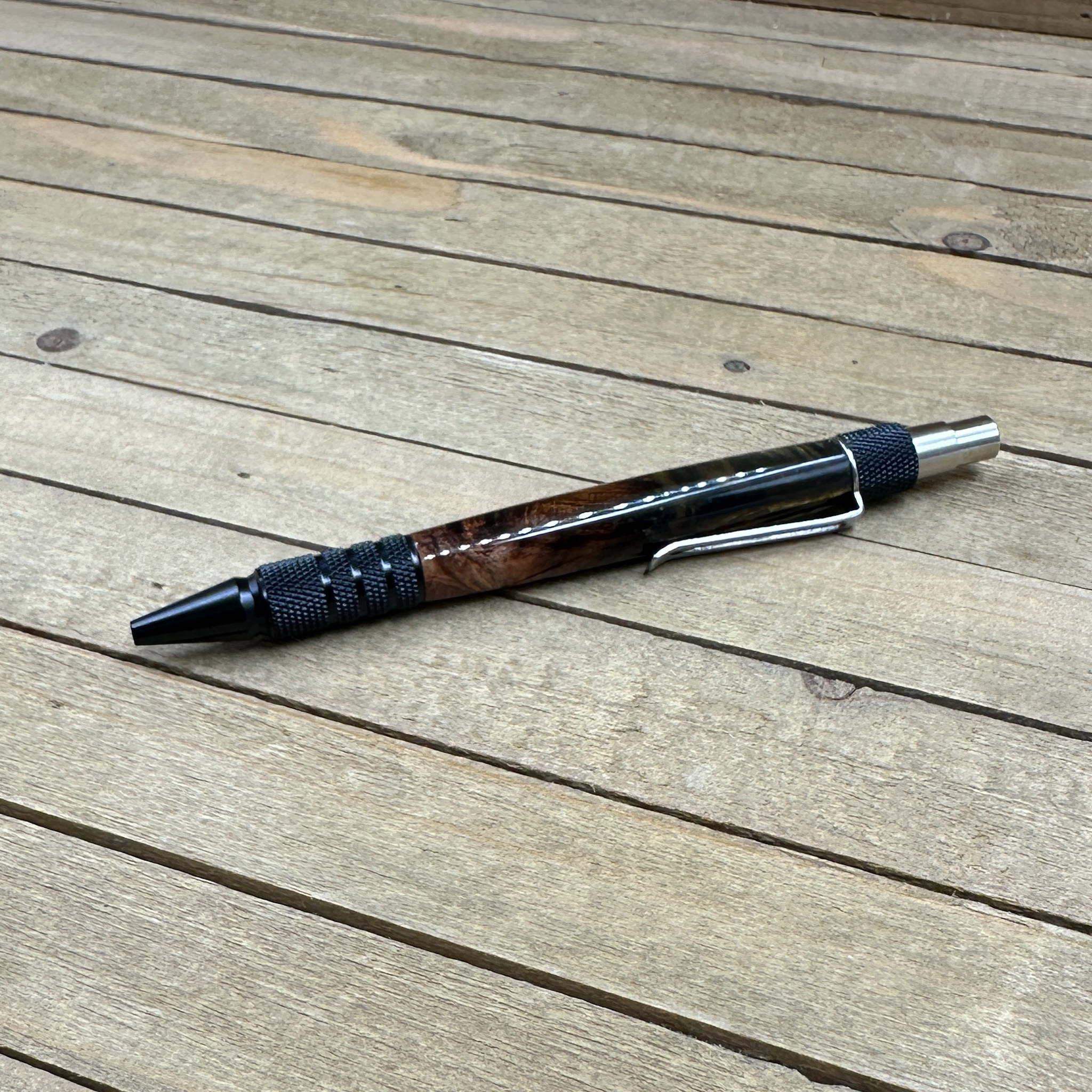 This custom handmade pen, like all my other pens, was personally handcrafted by me in my woodshop. These are not mass produced pens and each one is handcrafted by myself so you are getting a craftsman's touch and the love of their craft with each pen. Each pen I craft has subtle differences making it a truly one of a kind pen. First, a piece of mesquite cutoff which was bound for the burn pile is selected and cast with black and gold resin. Second, I drill the blank to prep it for turning. Third, it is meticulously turned down with my lathe to fit the Duraclick EDC pen components taking proper care that it transitions to the pen hardware perfectly. Finally, the gloss finish is applied and wet sanded to a glass look. This pen has already been produced by me so you know you will be getting the pen pictured in the listing. This eliminates the guess work on how it will look like once made and my pens are ready to ship without long waiting times.