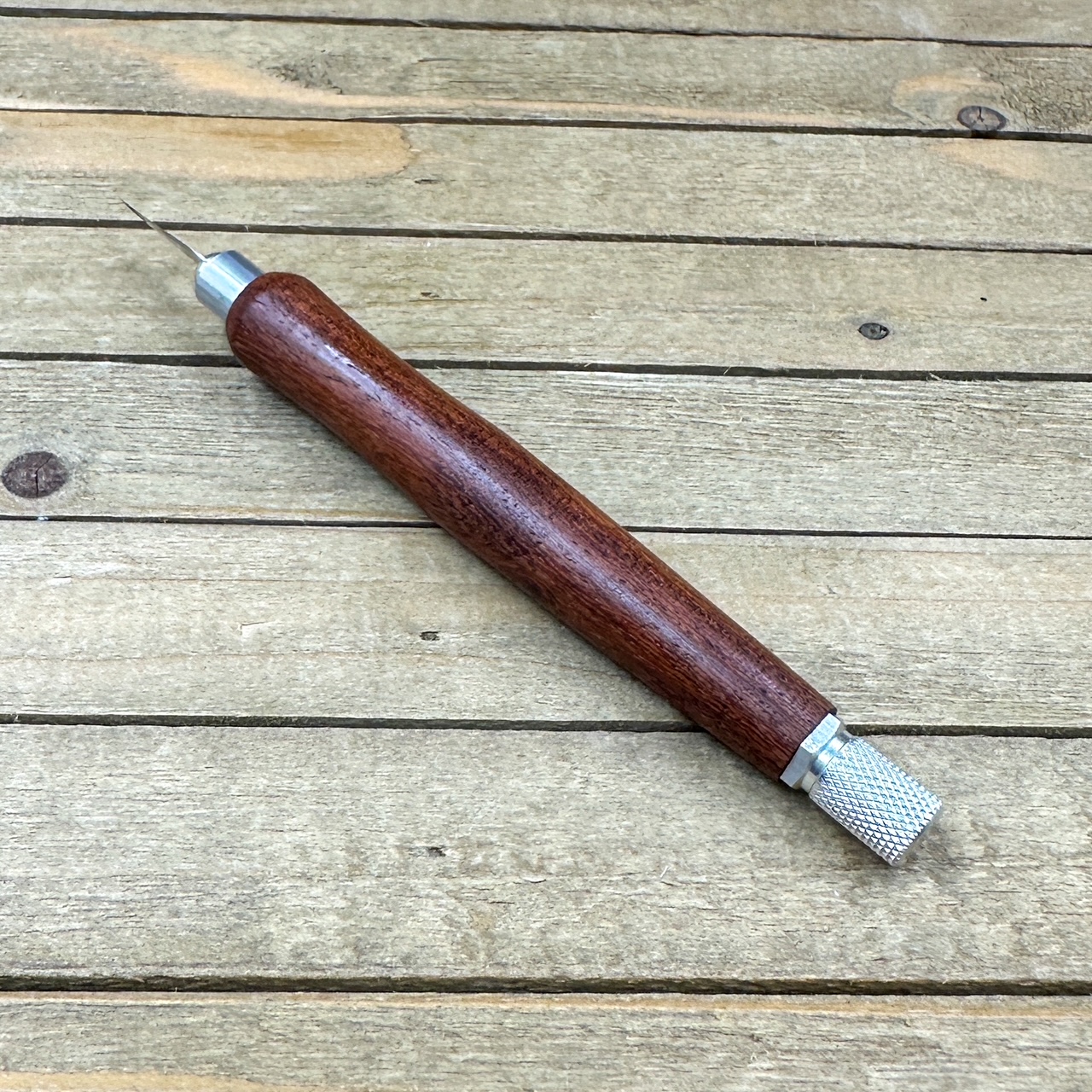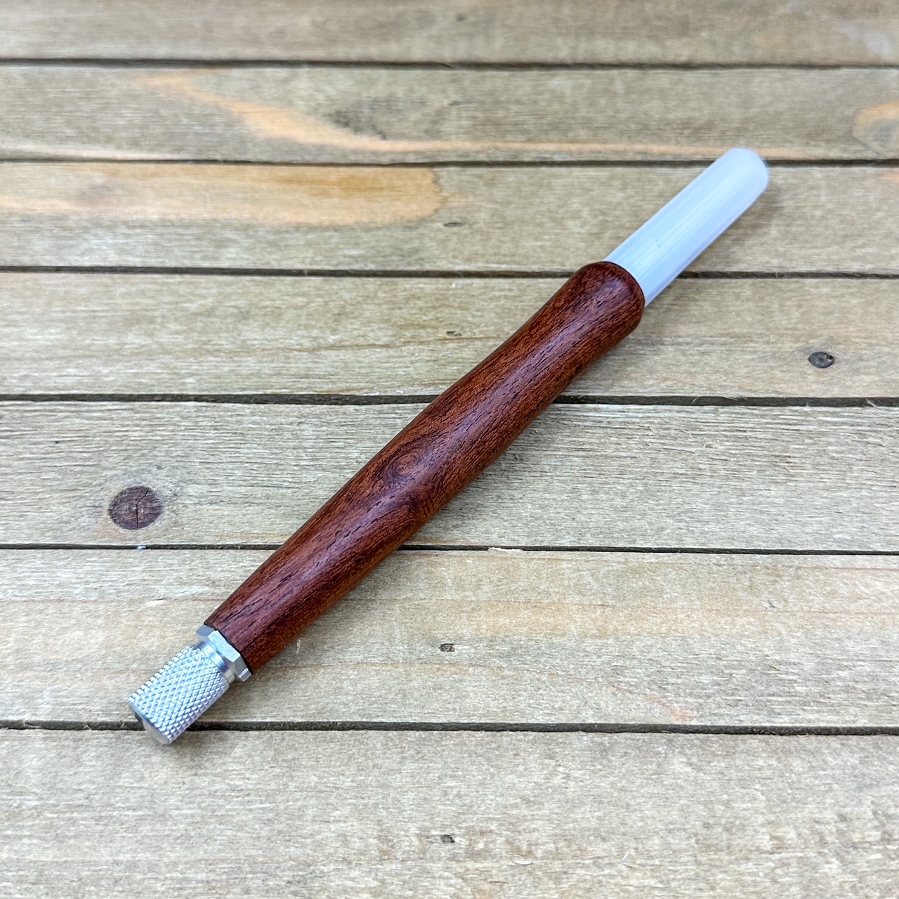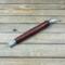 -hand turned handle in Texas Screwbean Mesquite wood with machined aluminum metal components