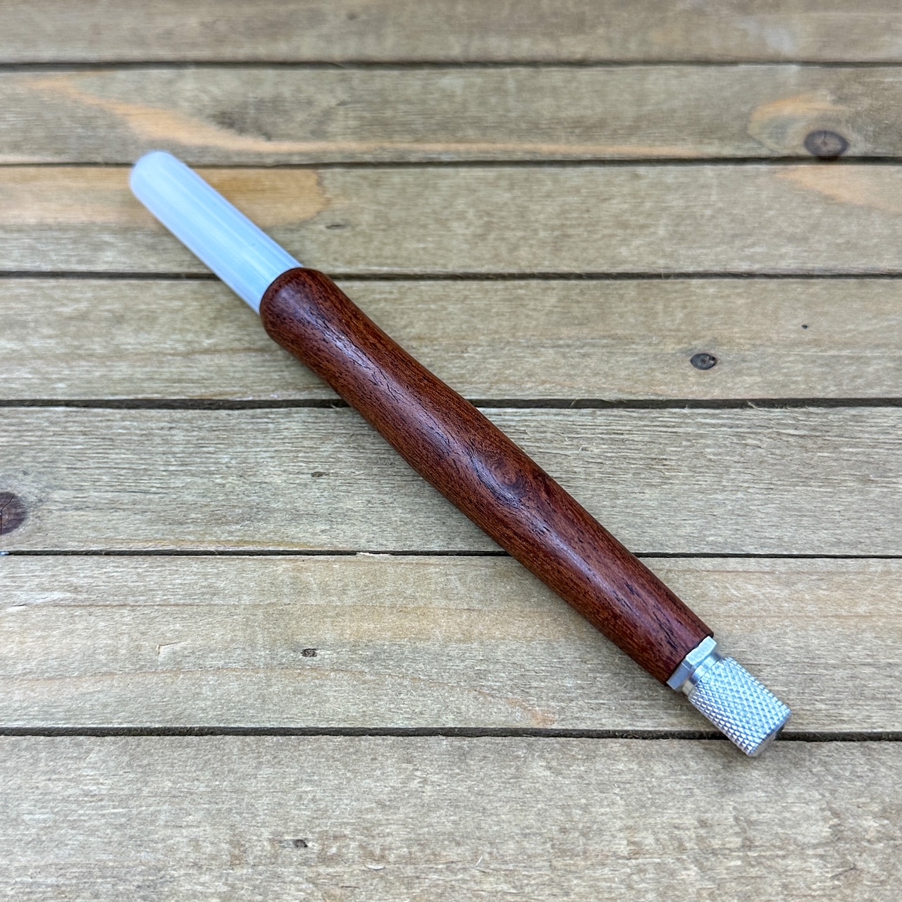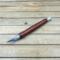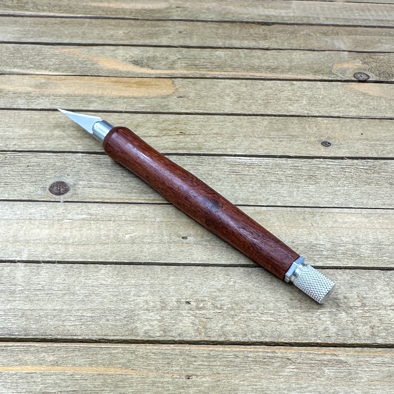 This custom handmade hobby knife, like all my other hobby knives, was personally handcrafted by me in my woodshop. These are not mass produced marking knives and each one is handcrafted by myself so you are getting a craftsman's touch and the love of their craft with each knife. Each hobby knife I craft has subtle differences making it a truly one of a kind. First, I select a piece of screwbean mesquite, cut it down to size to get it ready to turn on my wood lathe. Second, the newly formed blank is drilled out to fit the aluminum components and to prep it for turning. Third, it is meticulously turned down with my lathe to fit the hobby making knife components taking proper care that it transitions to the hardware perfectly. Finally, a walnut oil and wax finish is applied in multiple coats which allows you to feel the wood when you use the knife.