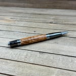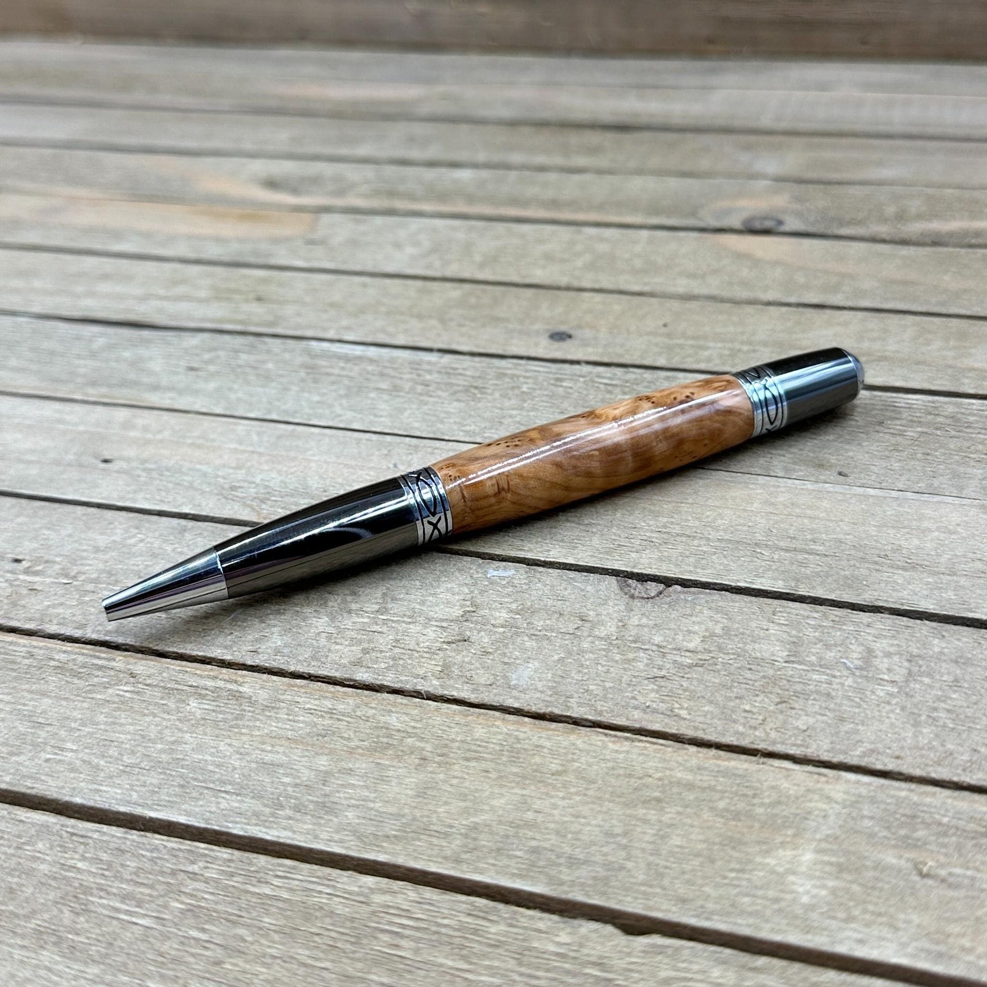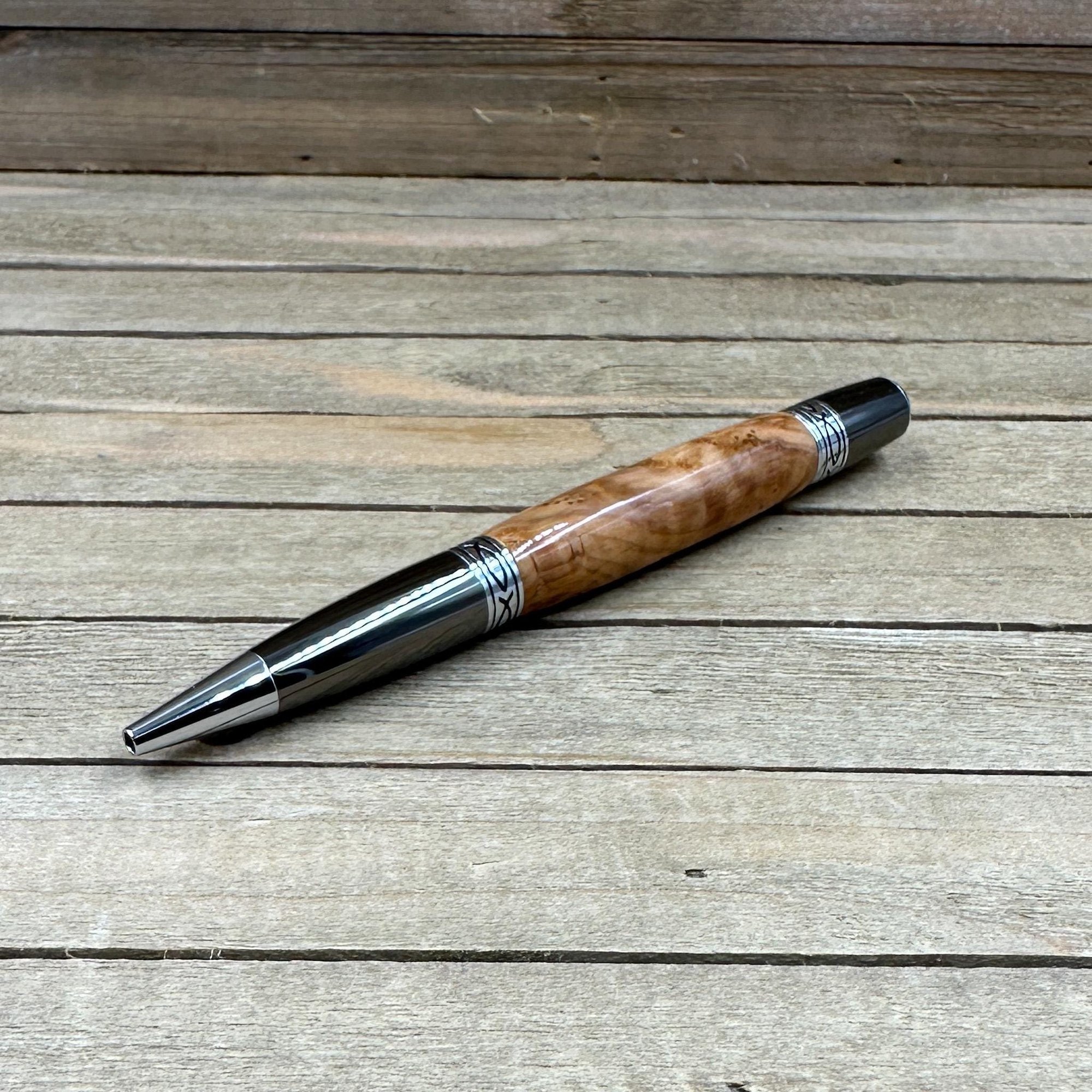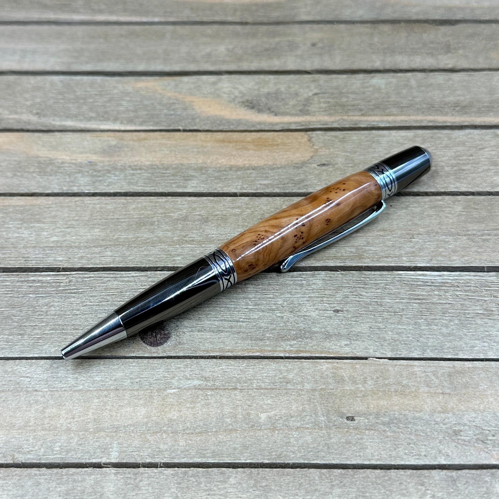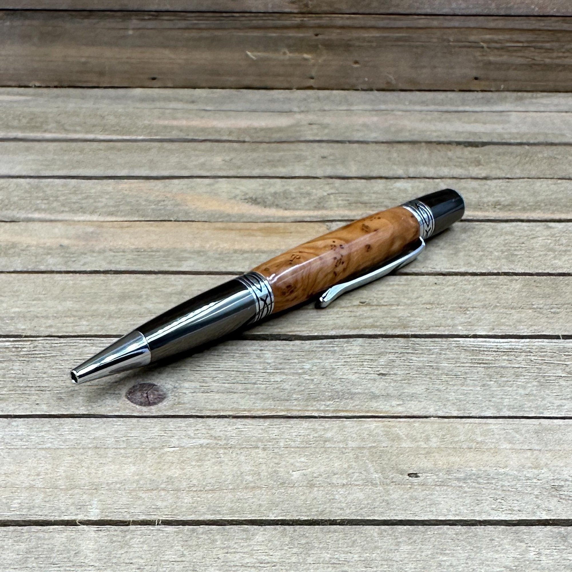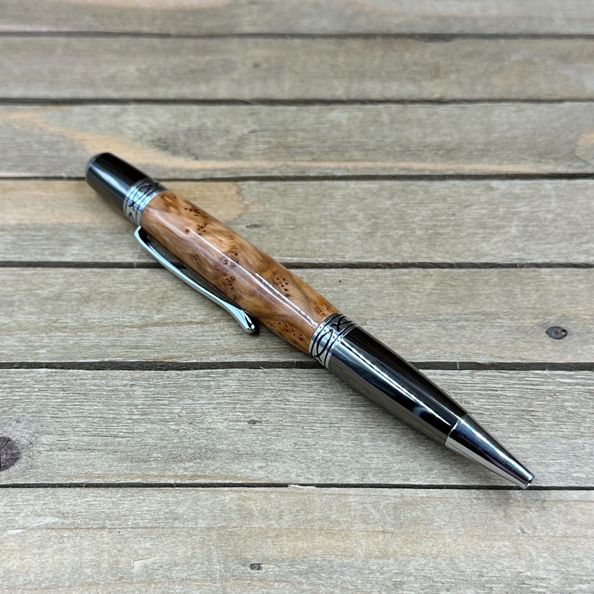 The components are plated in gunmetal with chrome accents. The Sierra style pen is a medium size pen perfect to carry in a purse, wallet, or front pocket. This pen comes with a high quality Schmidt German made Parker style refill which is extended by twisting the nib end of the pen. Refills can be purchased from me or any office supply store. This writing instrument comes in a box ready for presentation. It will also have instructions on how to care for your new custom pen.