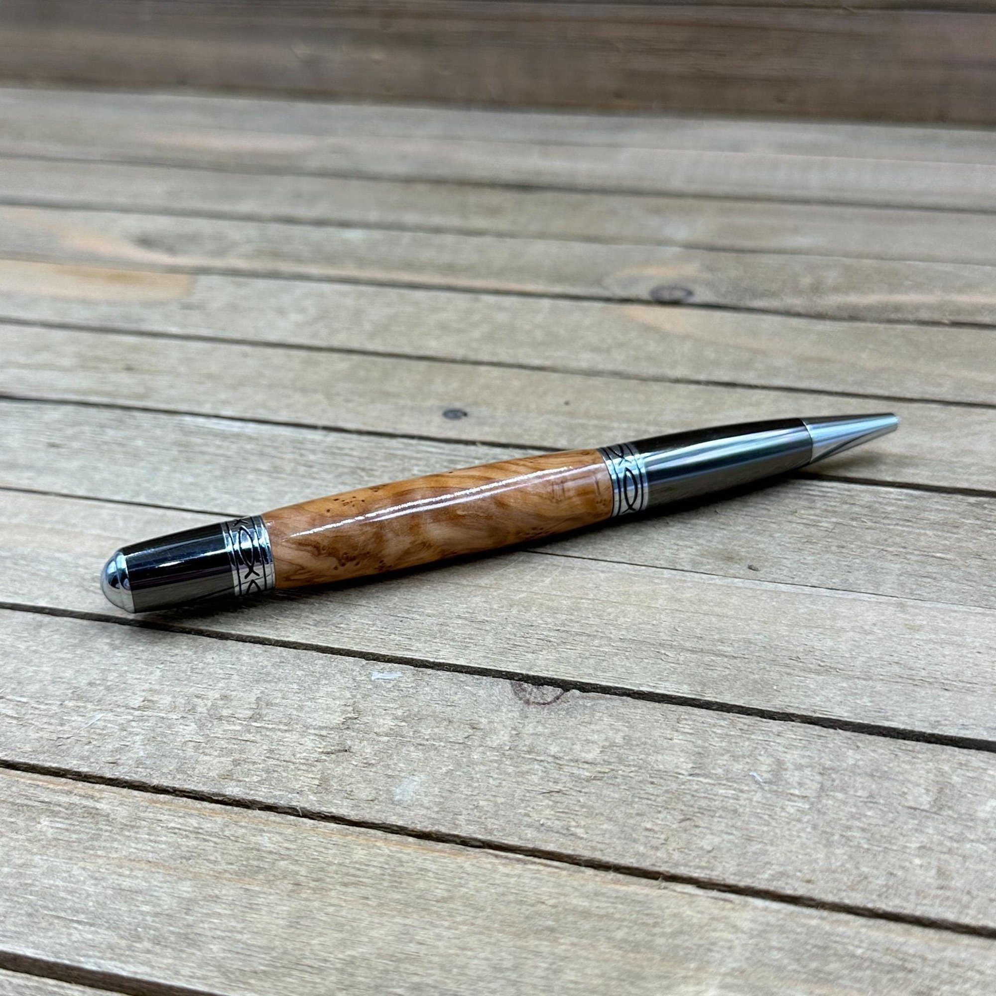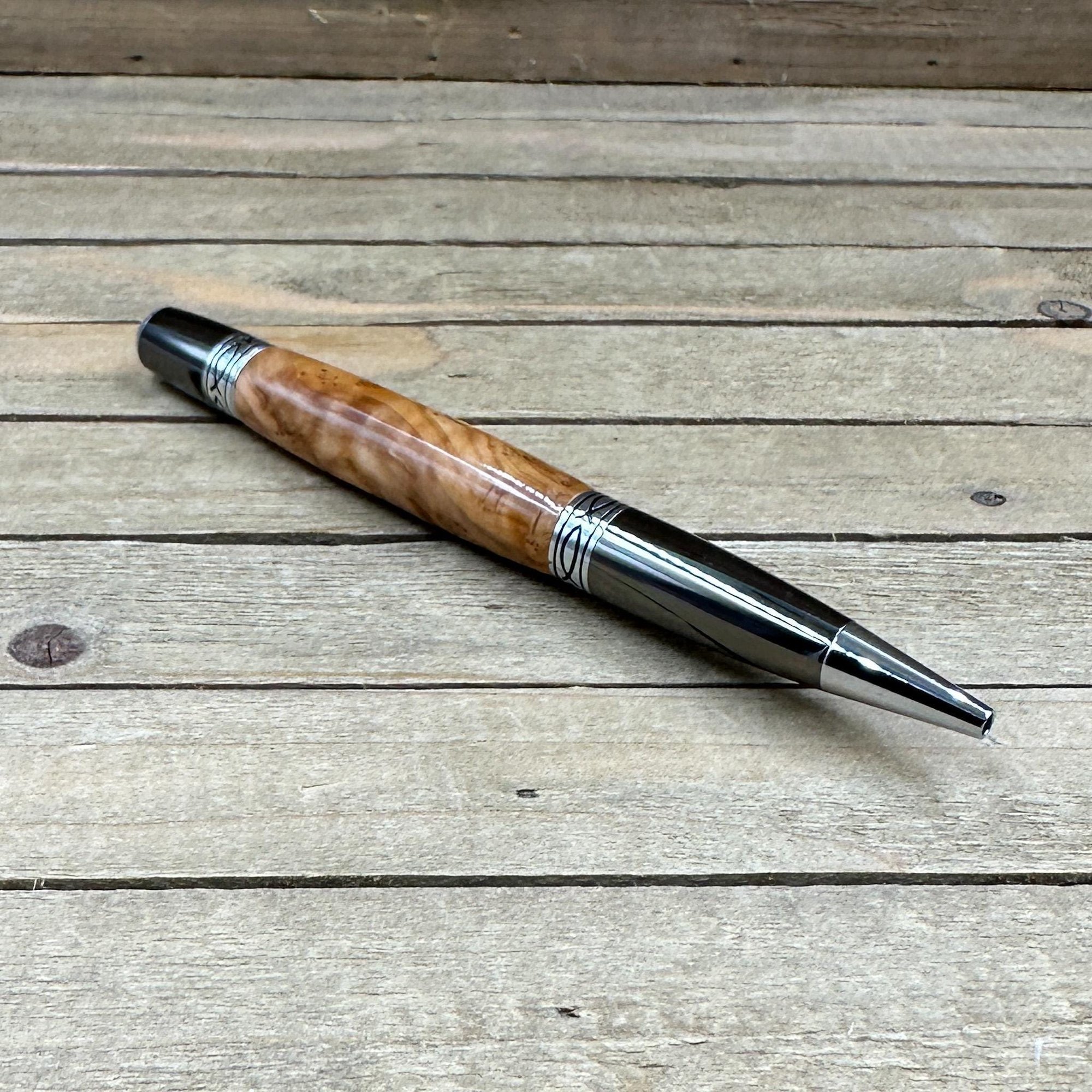 This is a elegant Sierra style pen that features olivewood from the Holy Land. The wood is turned down to fit the components, finish is applied, and then it is buffed out to a high gloss.