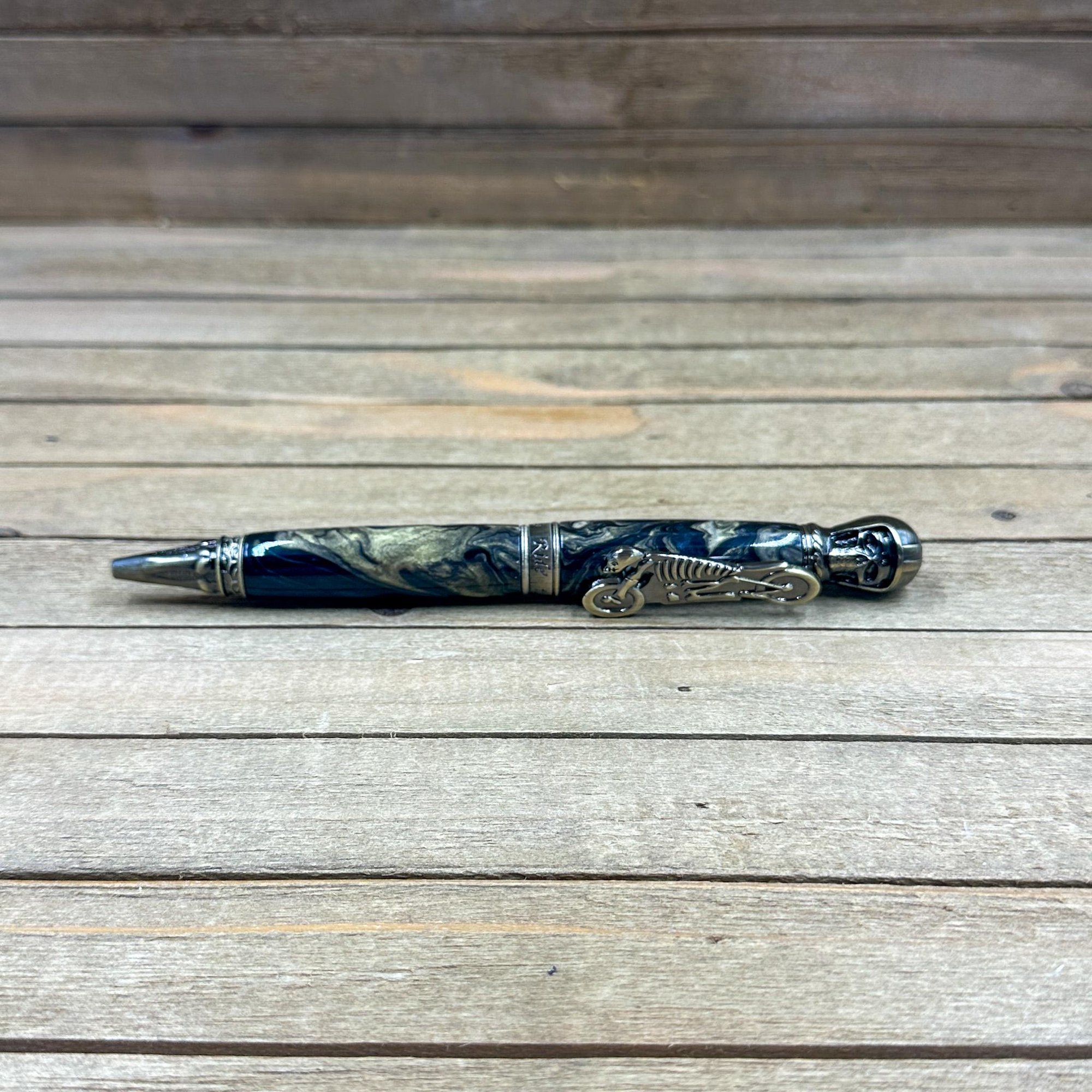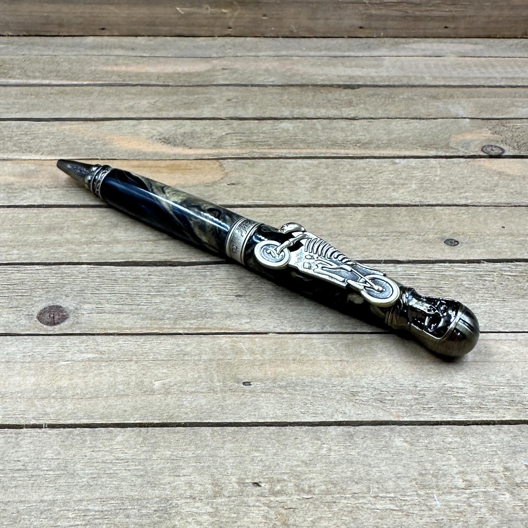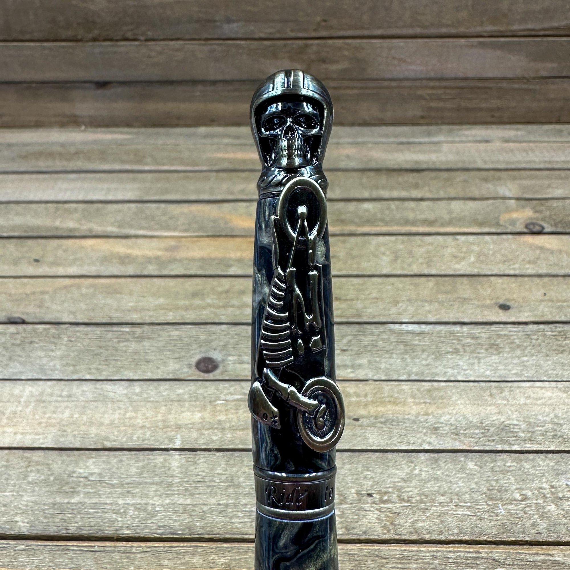 Antique brass plated metal components and hand cast resin with an intricate skull with leather helmet on the finial and chopper skeleton clip. The middle band states "Live to Ride, Ride to Live." This is a larger and heavy pen perfect for larger hands or someone who likes a hefty pen. All my pens come with an upgraded German made Schmidt EasyFlow refill in your choice of black or blue ink.