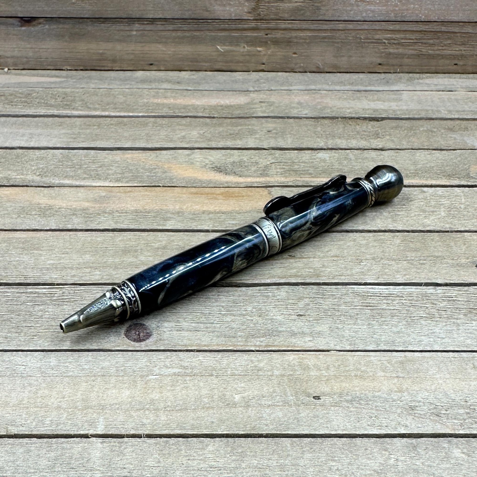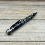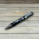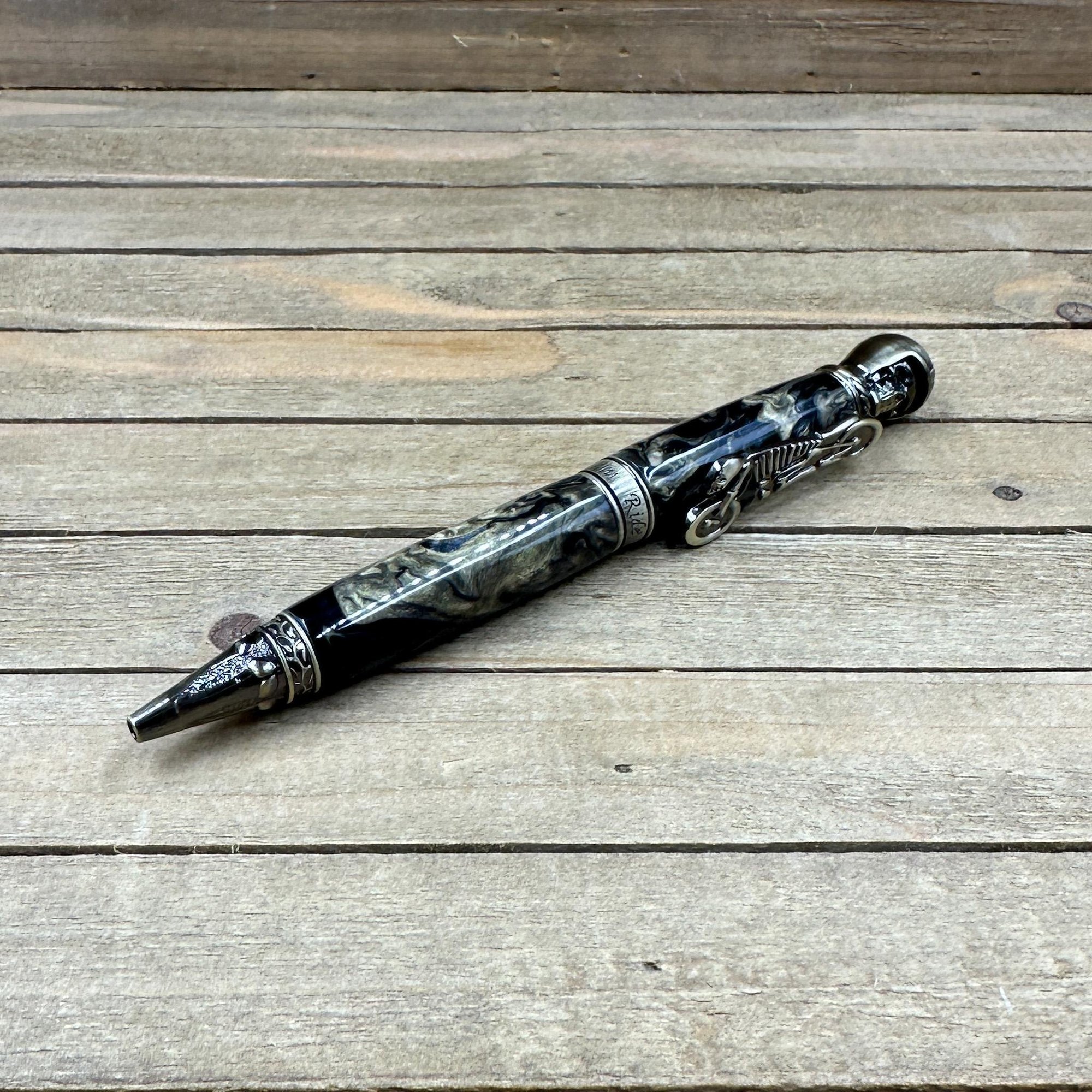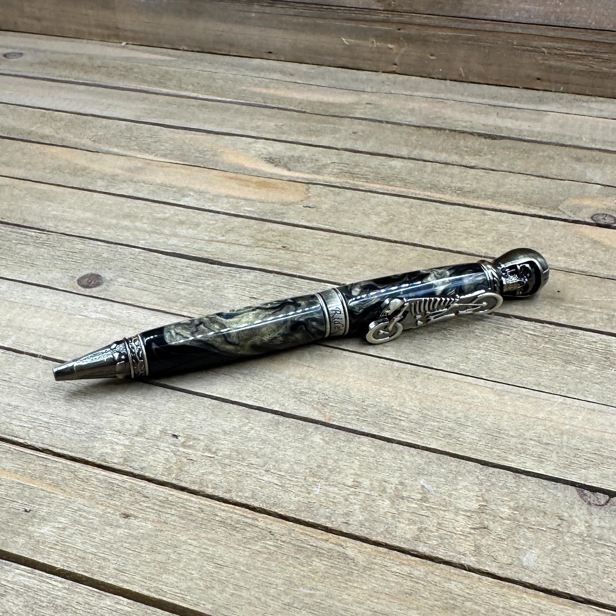 Antique brass plated metal components and hand cast resin with an intricate skull with leather helmet on the finial and chopper skeleton clip. The middle band states "Live to Ride, Ride to Live." This is a larger and heavy pen perfect for larger hands or someone who likes a hefty pen. All my pens come with an upgraded German made Schmidt EasyFlow refill in your choice of black or blue ink.