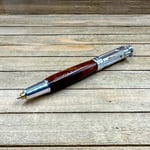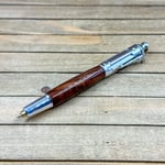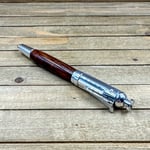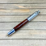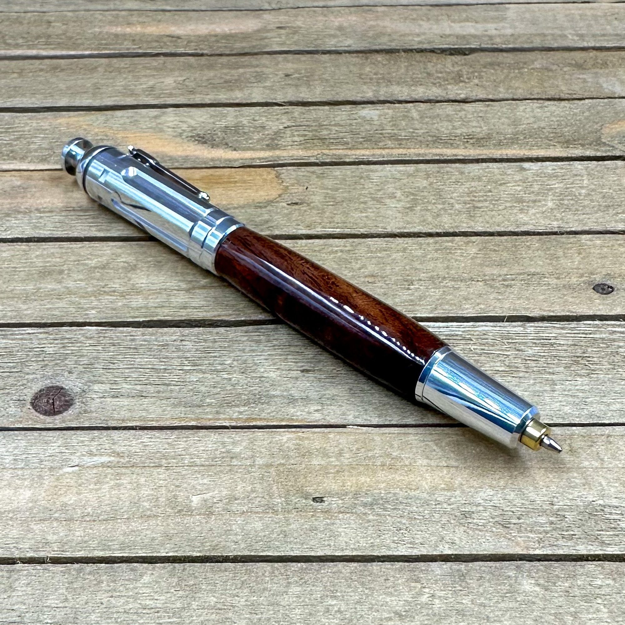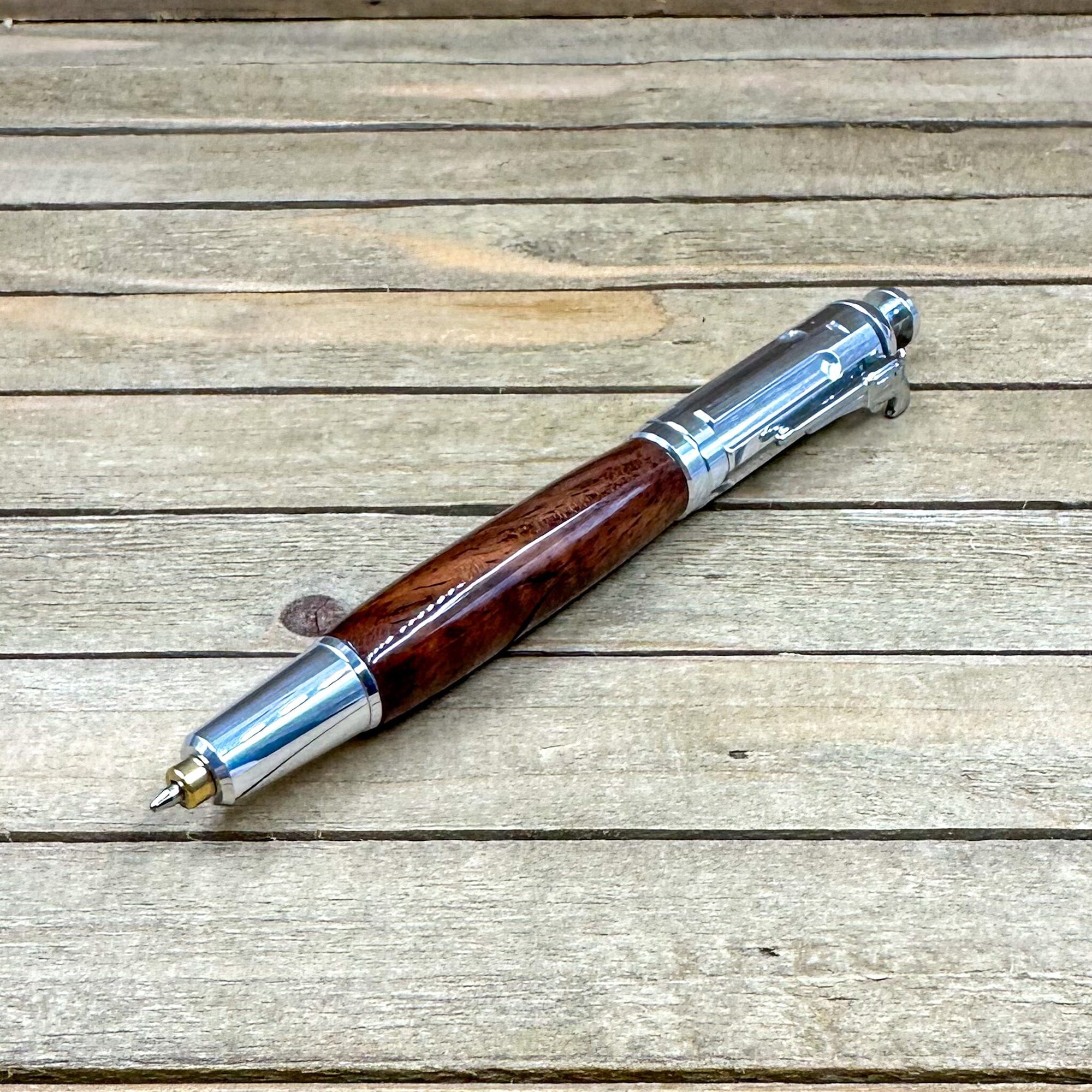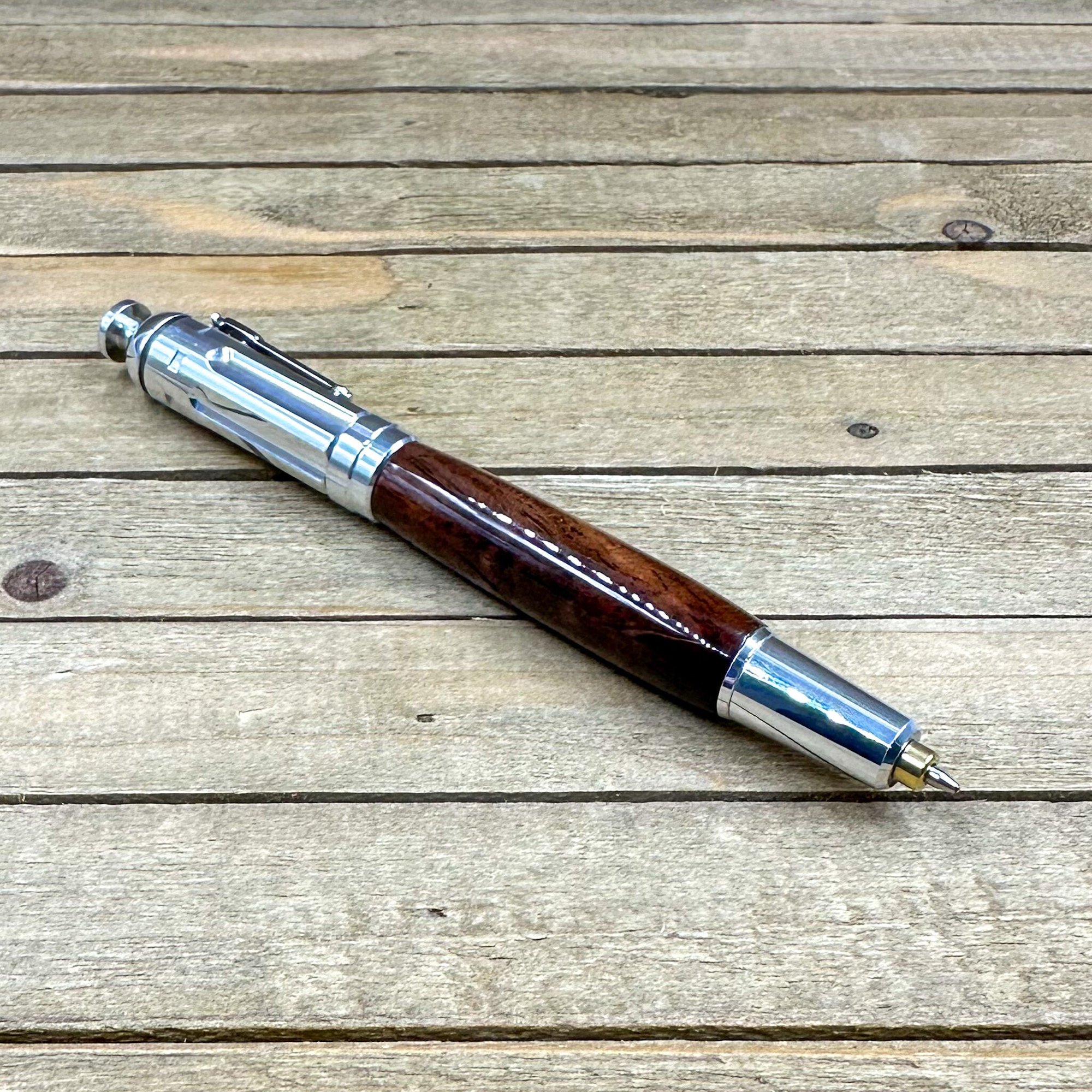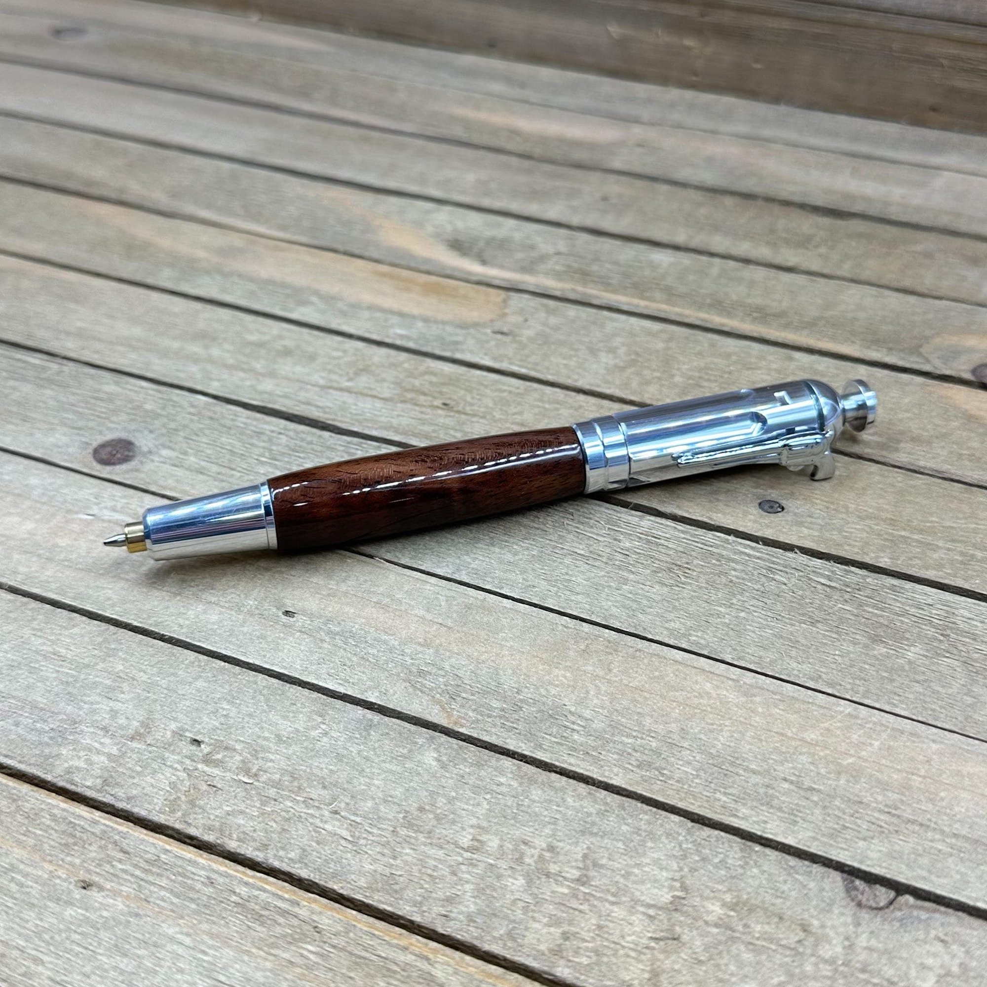 Inspired by the classic Colt Revolver design, this pen will make a great gift for any military, western, or gun aficionado. The form derives from the 6 shooter cylinder on revolving firearm and was paired with a dark black walnut wood to simulate wood grips which really set this pen apart from others. This pen is lightweight and comfortable use which makes it more than just a novelty gift. The pen clip on the top reflects the classic revolver design with cylinder and barrel. To extend the refill just click the plunger like a typical click pen. This pen features a mini cross style refill for smooth writing performance.