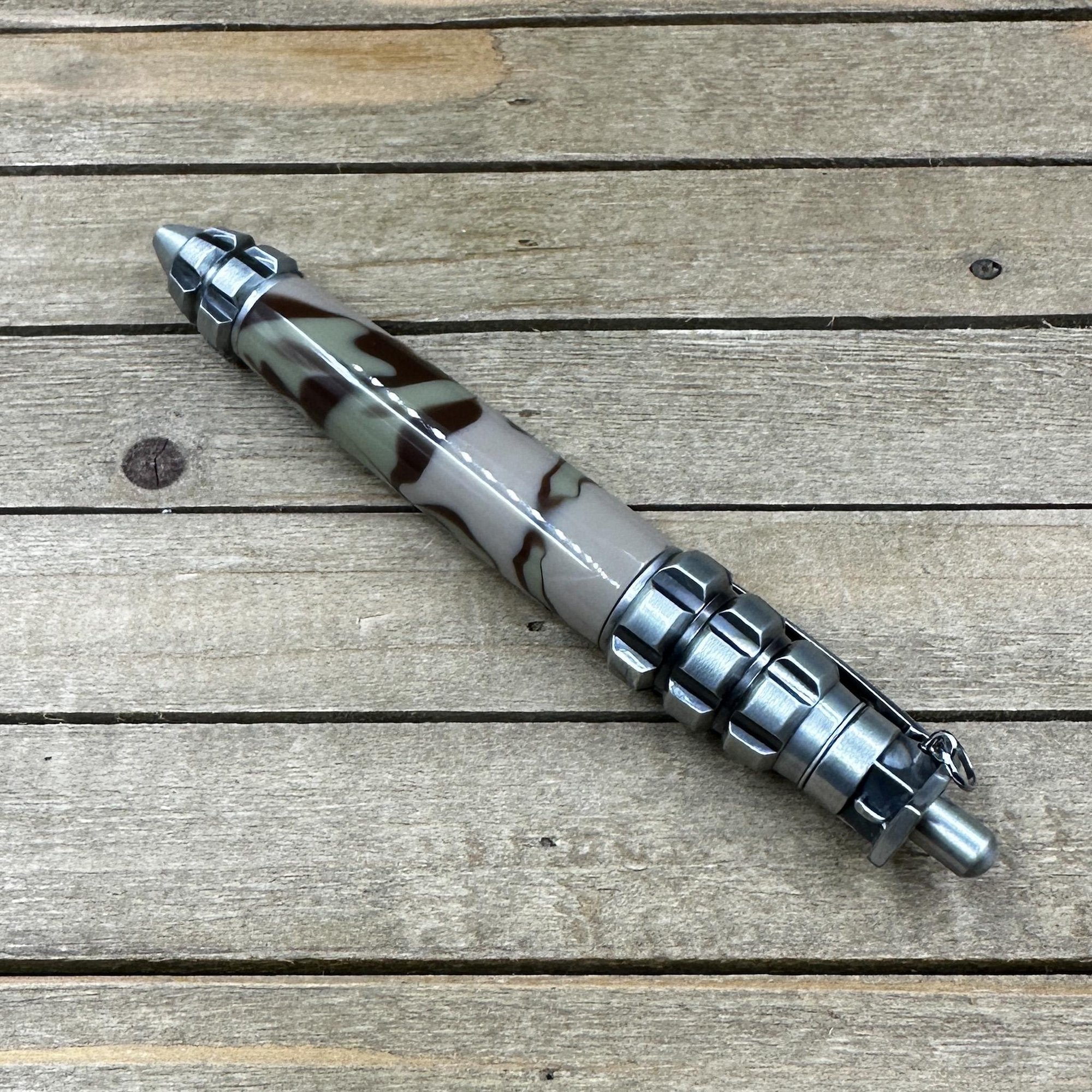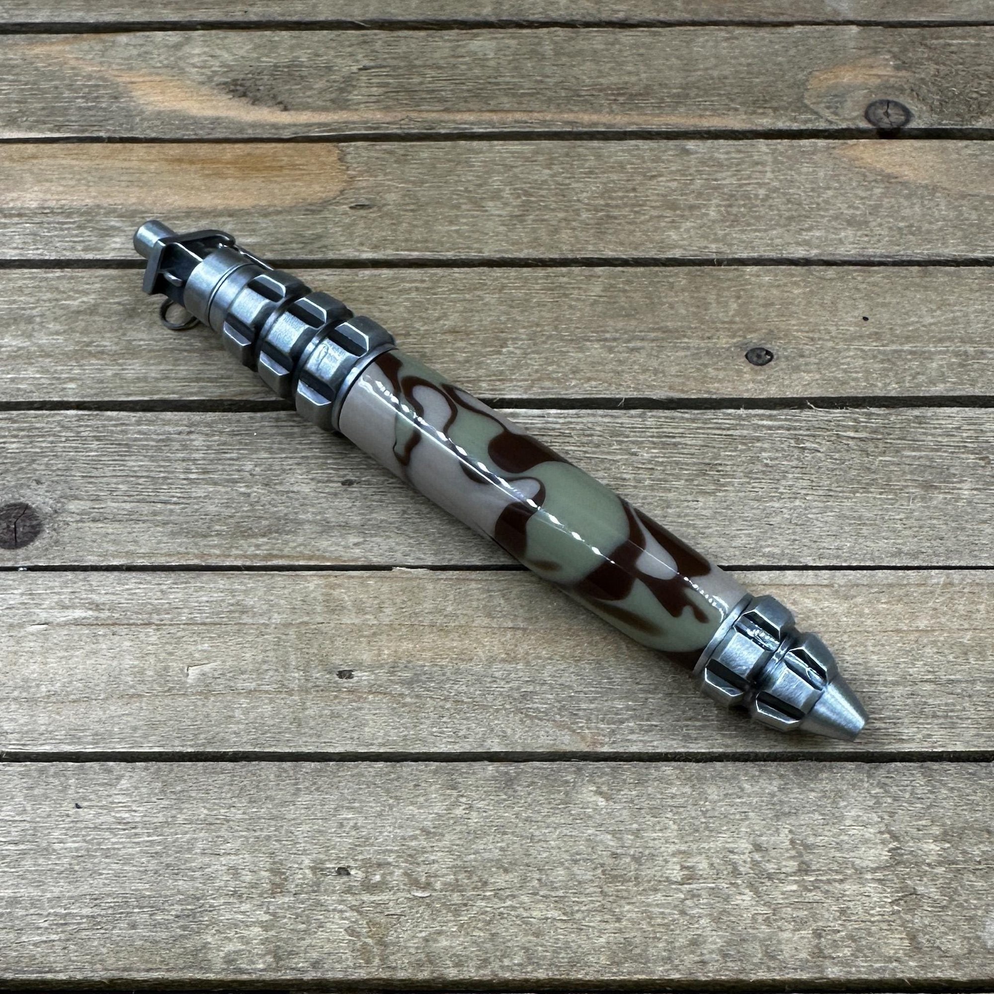 Inspired by the classic Pineapple hand grenade design, this pen will make a great gift for any military aficionado. The form derives from the 48-panel serrated cast-iron shell typical of this classic grenade. In contrast to the heavy iron-structure of the real grenade; the pen body is precisely CNC machined from solid Aluminum. This keeps your pen lightweight (2.2oz) and easy to use while maintaining the round bulky look and feel of its actual grenade inspiration. What looks like a pen clip at the top of the pen actually represents the Grenade safety lever and works to retract the refill rather than act as a working pen clip. That safety lever connects to the top of the pen, or Lug and Fuze, with an authentic looking safety pin and pull ring. To extend the refill just click the plunger like a typical click pen. This pushes out the safety lever clip. To retract, pull the safety lever and watch the pen top explode out of the Lug and Fuze pen end. Features a Parker style refill for smooth writing performance. This grenade pen was fitted with jungle camo acrylic.