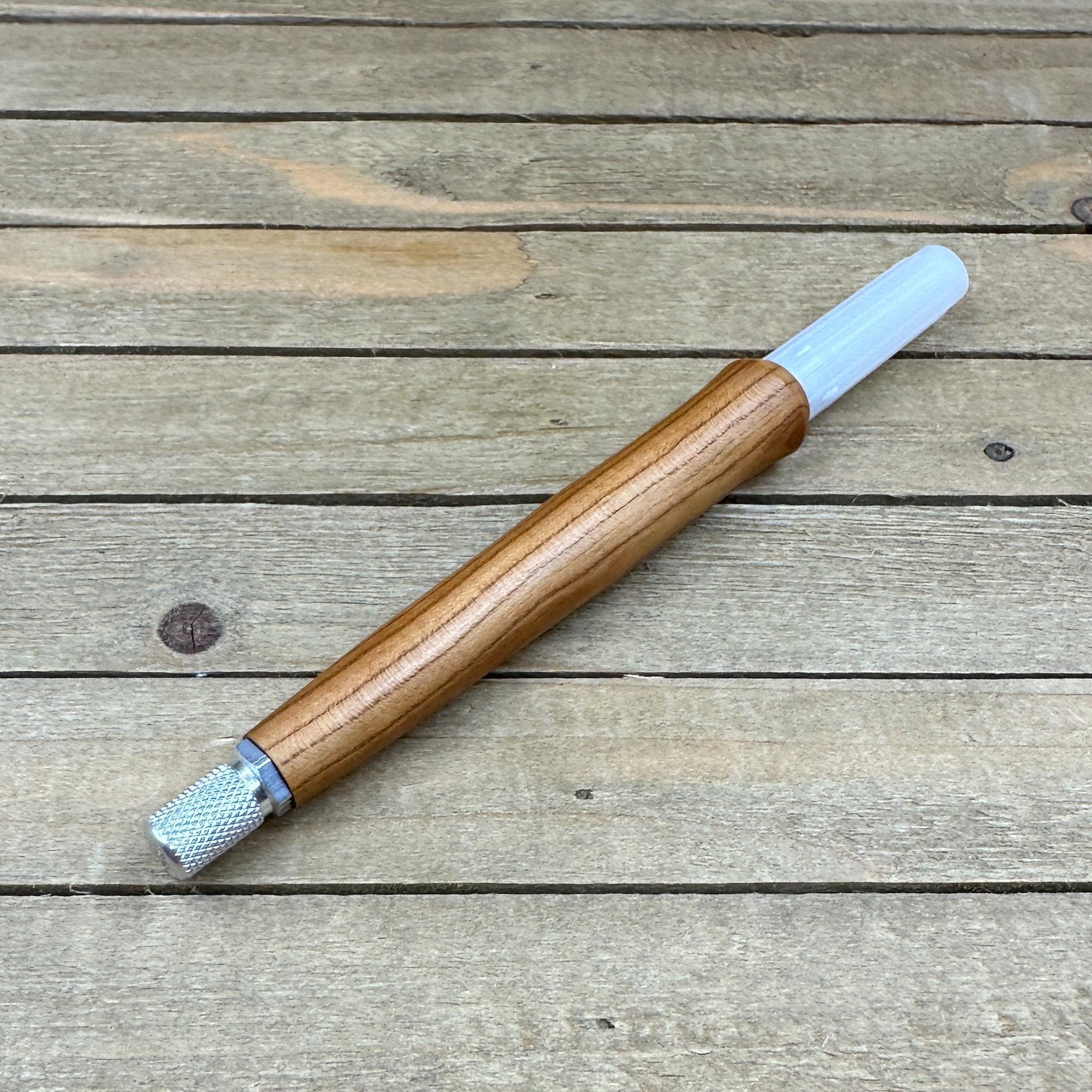 -hand turned handle in reclaimed Bradford pear wood with machined aluminum metal components