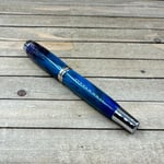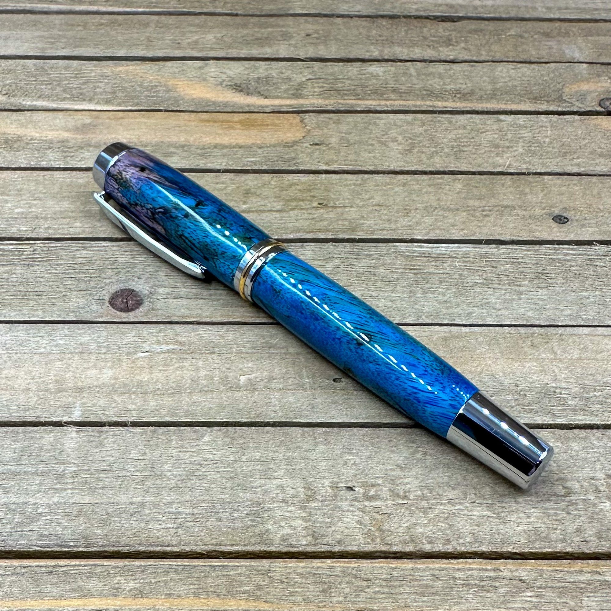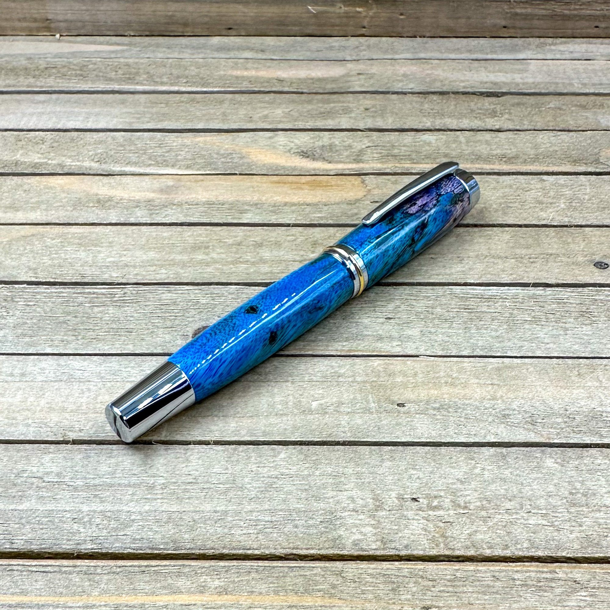 This is a large sized fountain pen that is made from a piece of spalted tamarind that has been dyed blue with a hint of purple. First, I select a beautiful piece of the spalted tamarind timber and turn it down on a wood lathe to match the pen components. The result is a beautiful and truly one of a kind pen. This pen has a hard durable finish which was polished by hand to provide depth and a glass like finish. The components are plated in chrome with gold and black chrome accents. The closed pen measures 5 3/4 inches and has a non-postable cap. This pen comes with a universal cartridge converter (for bottled inks) and accepts universal cartridges as well. The nib is a German made iridium point that is polished steel and medium-fine point. This writing instrument comes in a box ready for presentation. It will also have instructions on how to care for your new custom pen.