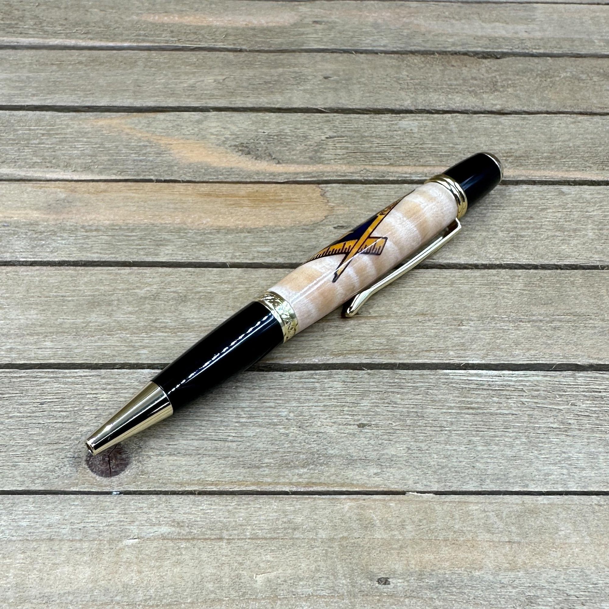 Mason Square and Compass Image on Curly Maple Wood Ballpoint Pen