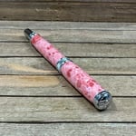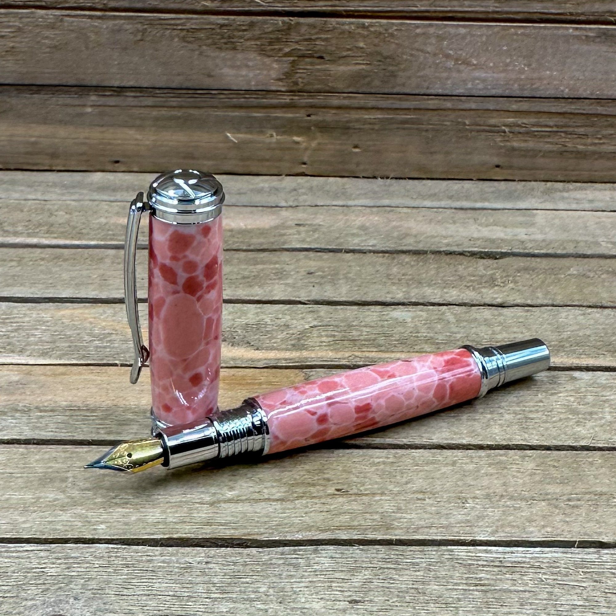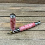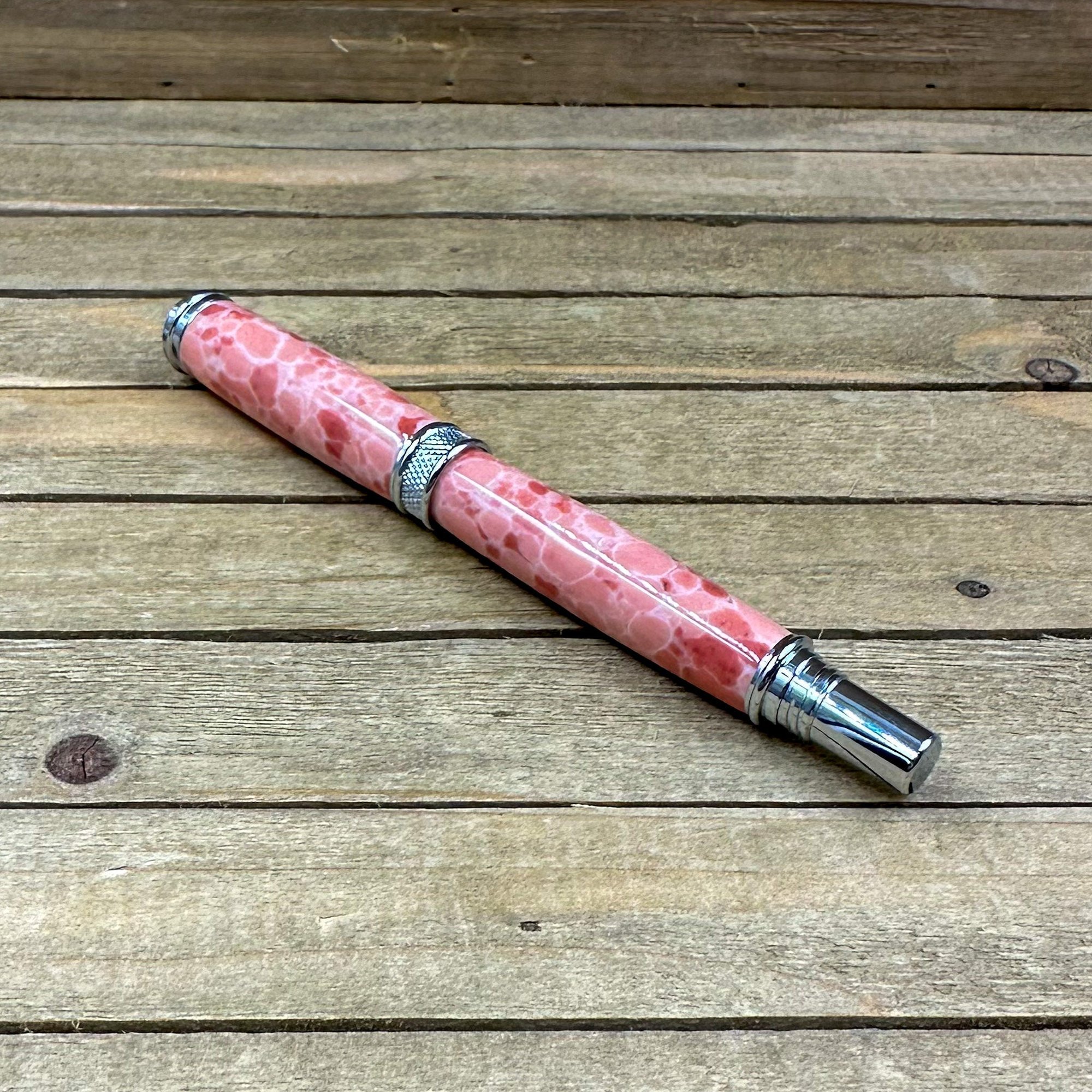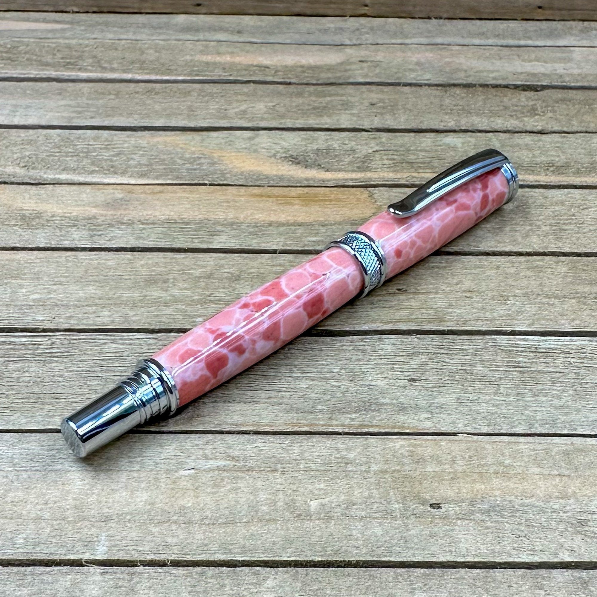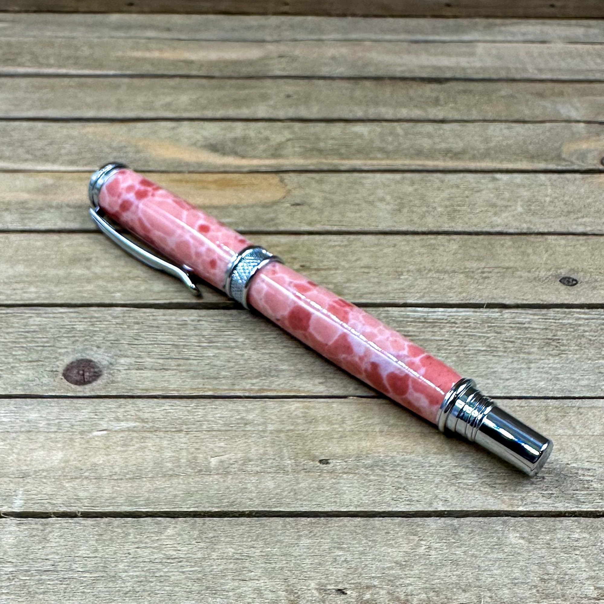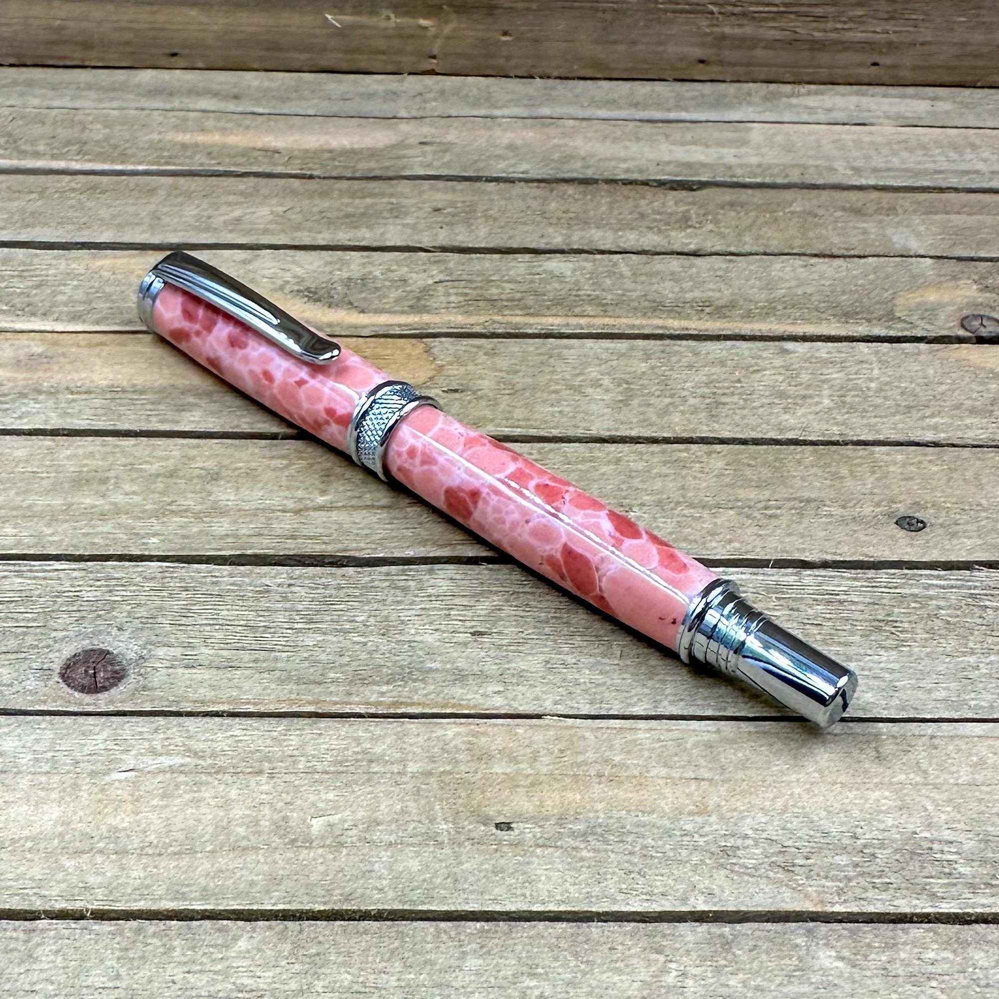 This is a medium-large sized fountain pen that is made from a product known as TruStone. TruStone is a product made from crushed stone ore, that is dyed, and stabilized with acrylic resin. First, I select a beautiful piece of Pink Larimar TruStone and turn it down on a wood lathe to match the pen components. The result is a beautiful and truly one of a kind pen. This pen has a hard durable finish which was polished by hand to provide depth and a glass like finish. The components are plated in chrome and feature a knurled center band and domed cap. The closed pen measures 5 3/4 inches and has a postable cap. This pen comes with a universal standard cartridge converter (for bottled inks) and accepts universal cartridges as well. The nib is a German made iridium point Jowo nib that is gilded steel and medium-fine point. This writing instrument comes in a box ready for presentation. It will also have instructions on how to care for your new custom pen.