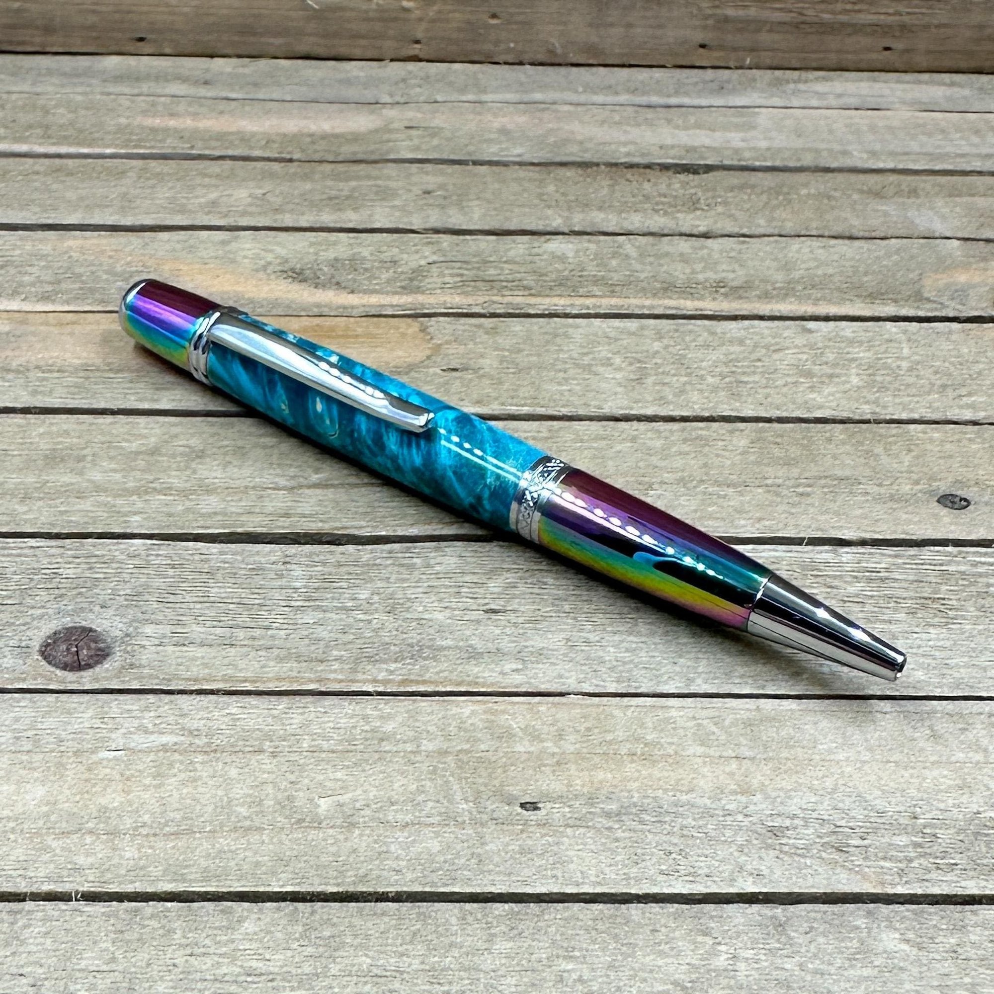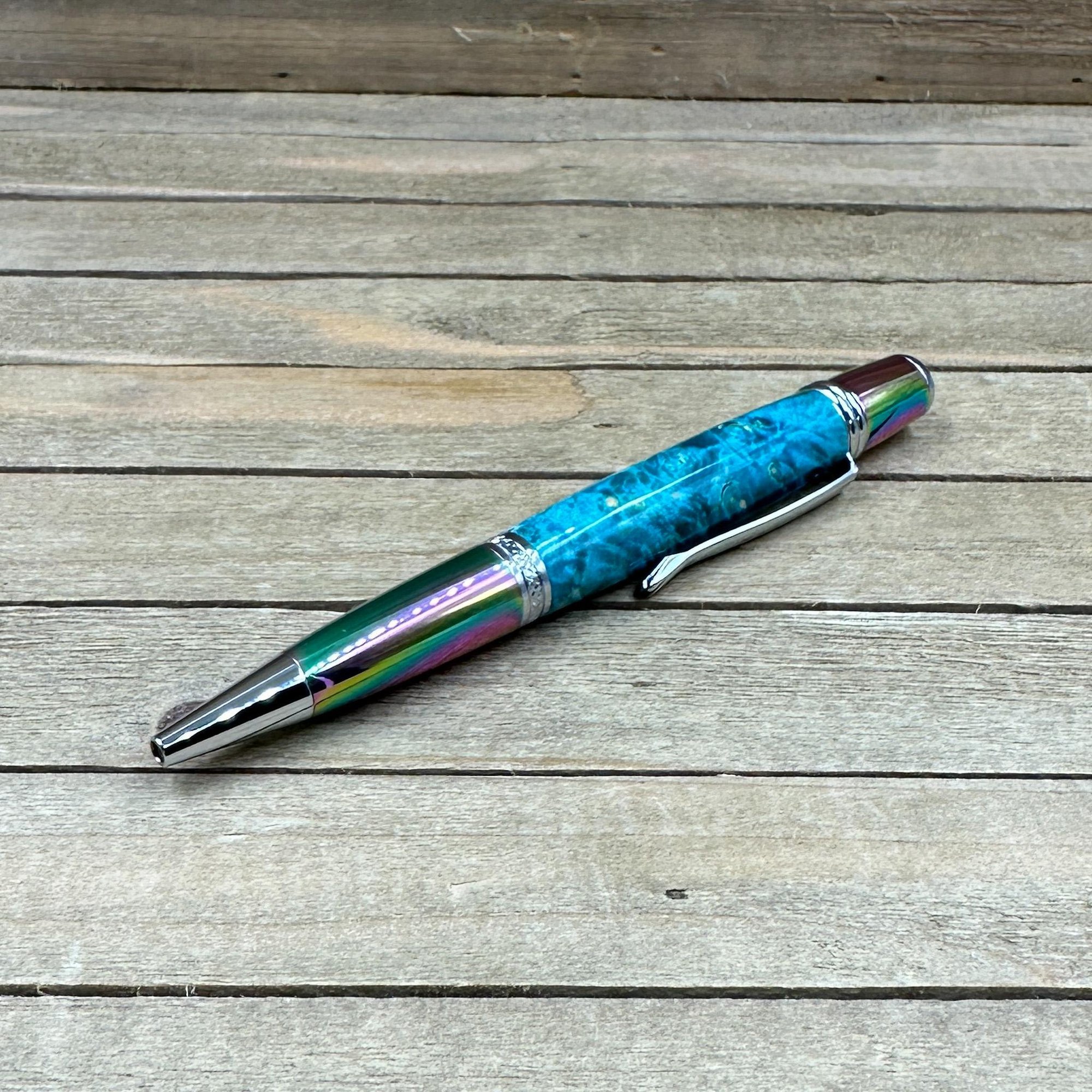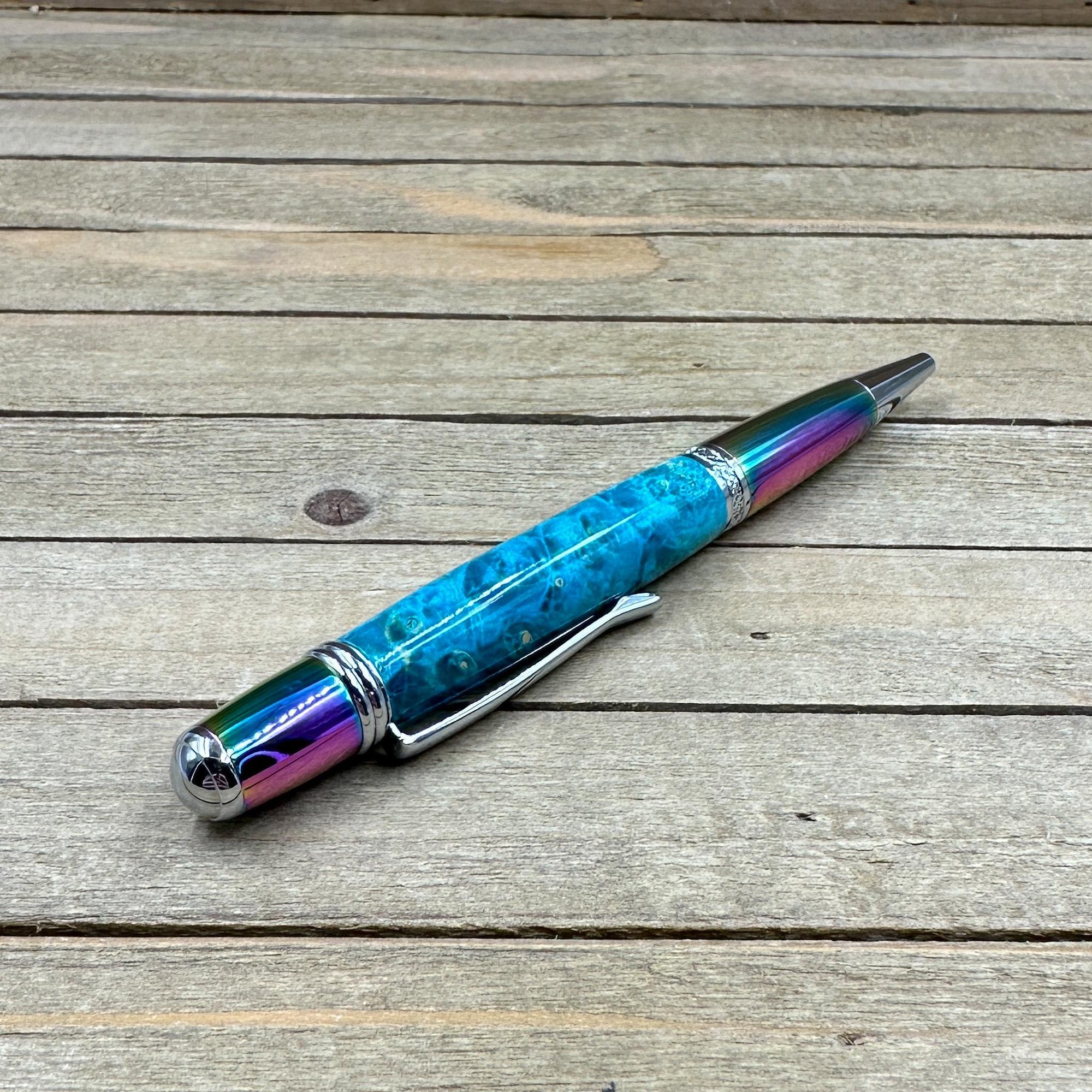 Prismatic Oil Spill Ballpoint Pen with Teal Dyed Boxelder Burl