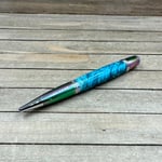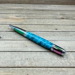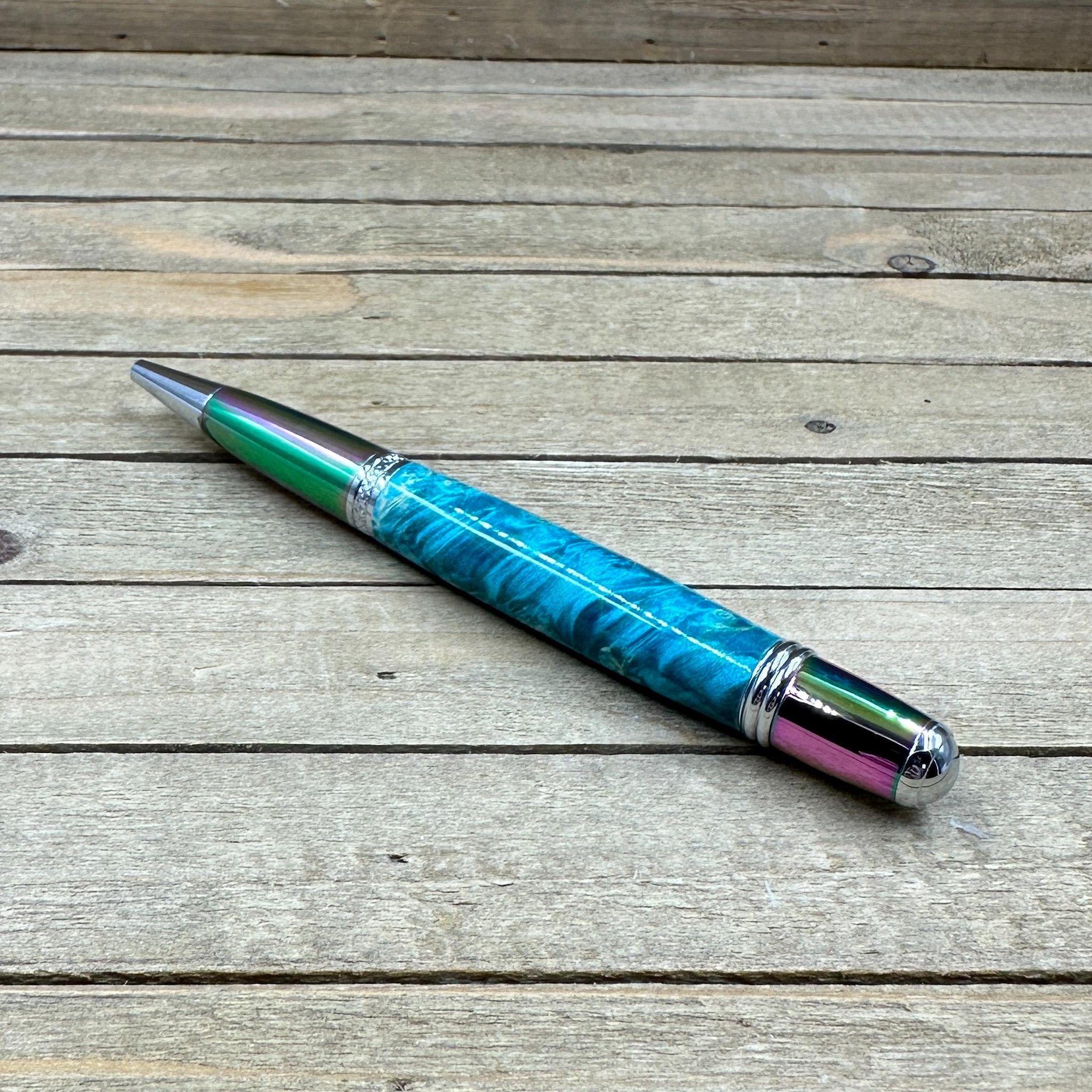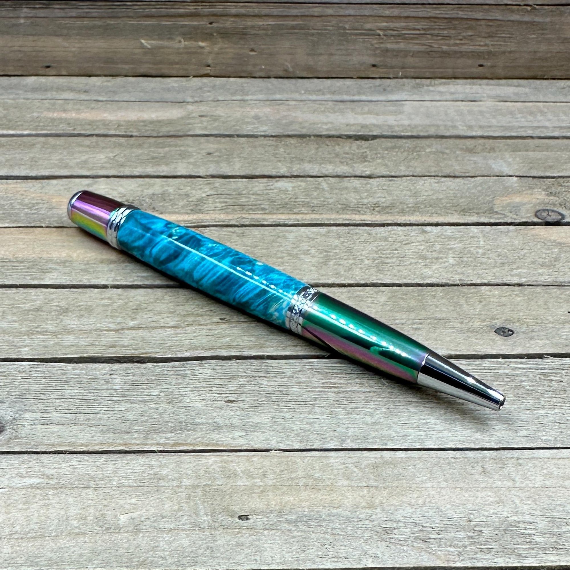 Experience a beautiful turquoise dyed piece of box elder burl on prismatic/oil spill hardware that will WOW any gift recipient. This is medium sized twist pen that is easy to hold and provides a comfortable writing experience.. Handcrafted to perfection, this writing instrument combines dyed burl wood with the convenience of a smooth twist mechanism. Elevate your writing experience with this unique blend of craftsmanship and style. This "Caldera" style pen was made in Michael's woodshop and features the following: