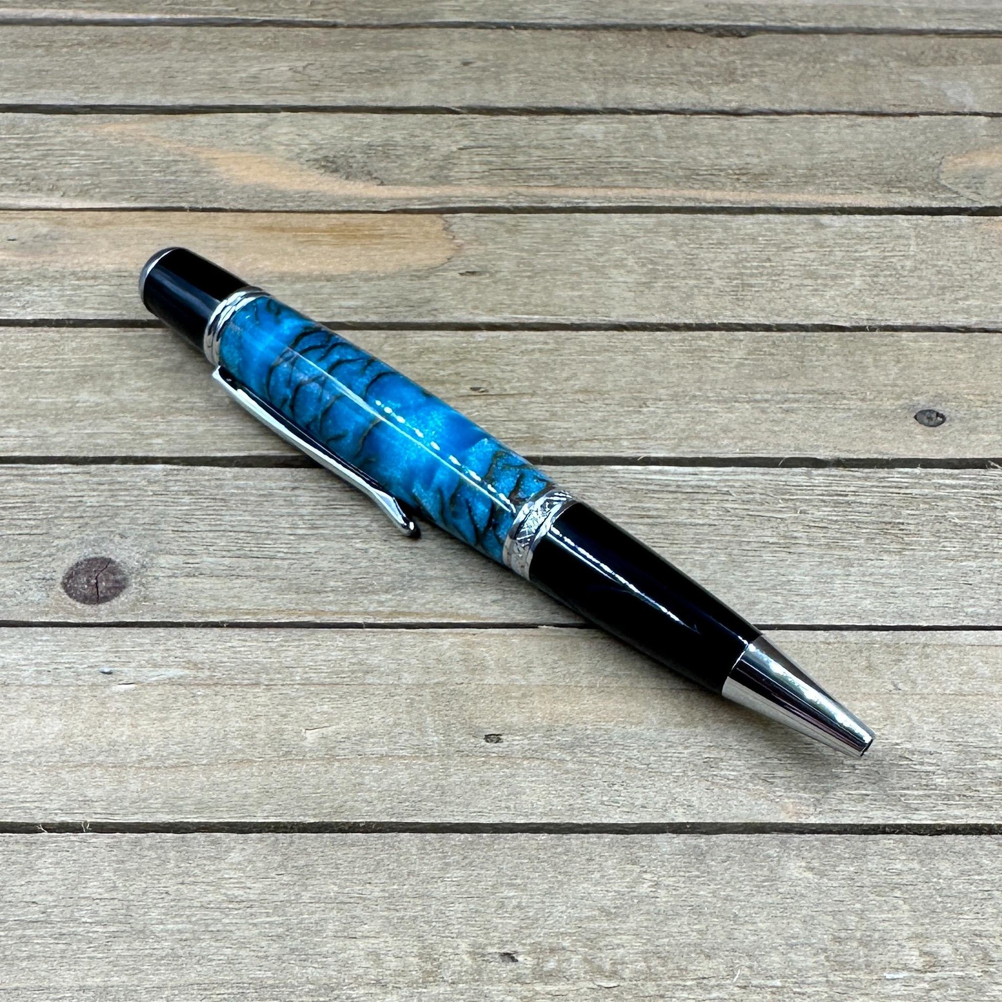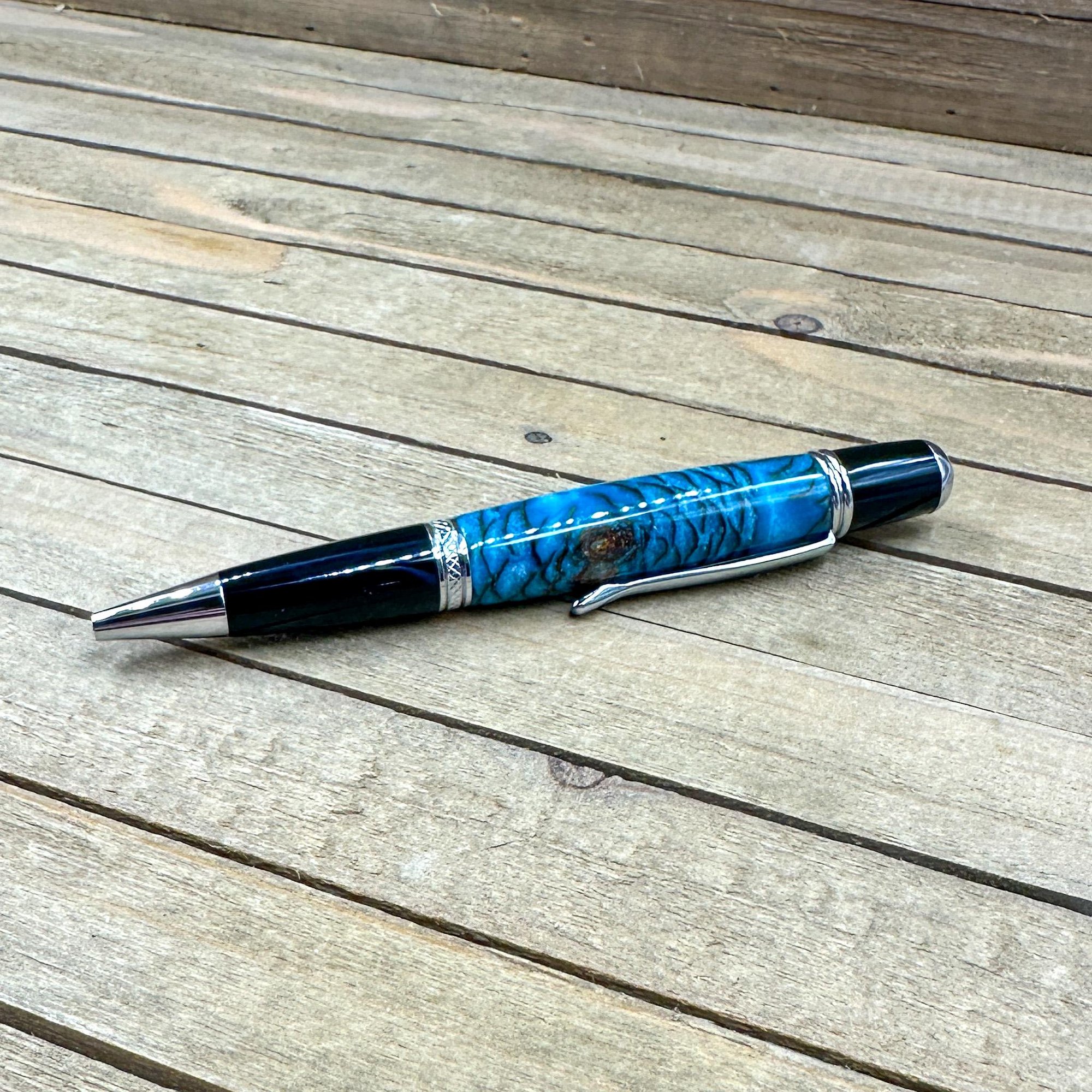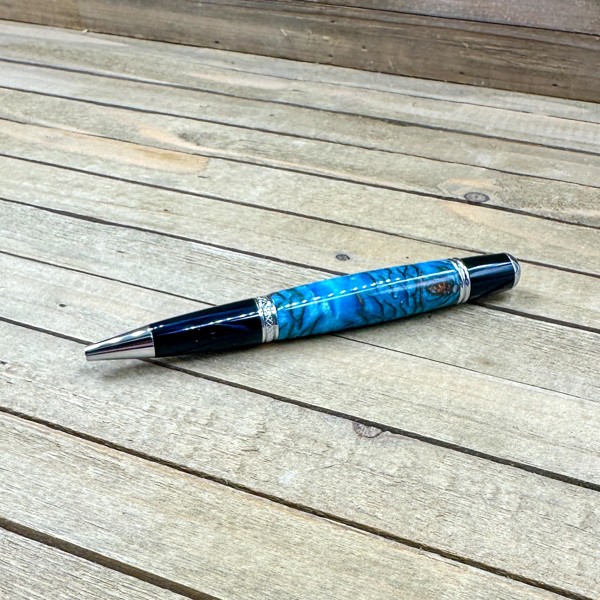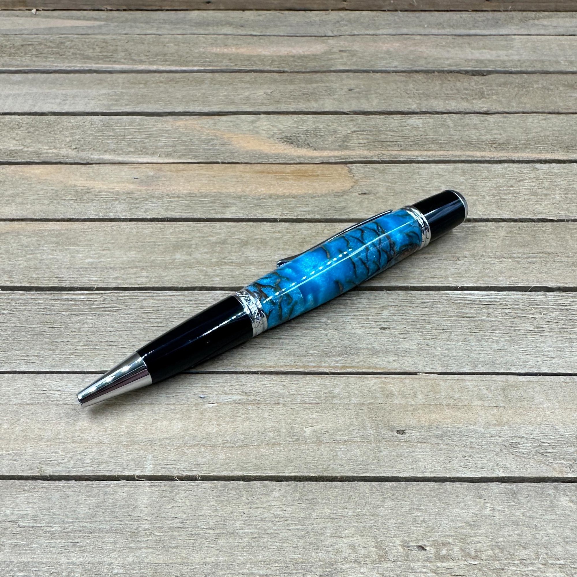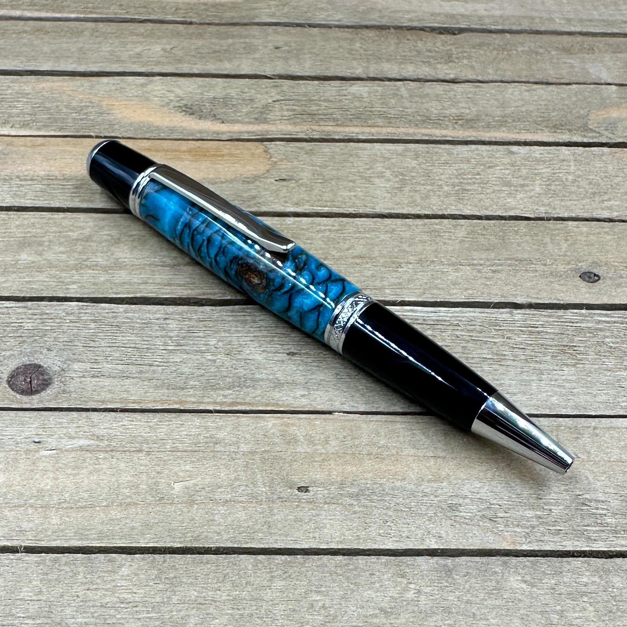 Experience a beautiful turquoise resin pen with resin cast alder pinecones that will WOW any gift recipient. This is medium sized twist pen that is easy to hold and provides a comfortable writing experience.. Handcrafted to perfection, this writing instrument combines resin and pinecones with the convenience of a smooth twist mechanism. Elevate your writing experience with this unique blend of craftsmanship and style. This "Caldera" style pen was made in Michael's woodshop and features the following: