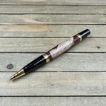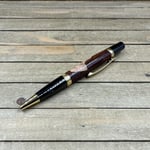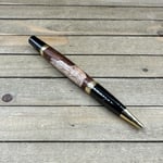 The components are plated in dark gunmetal with elegant gold accents. The Elegant Beauty style pen is a medium size pen perfect to carry in a purse, wallet, or front pocket. This pen comes with a high-quality Schmidt German made Parker style refill which is extended by twisting the nib end of the pen. Refills can be purchased from me or any office supply store. This writing instrument comes in a box ready for presentation. It will also have instructions on how to care for your new custom pen.