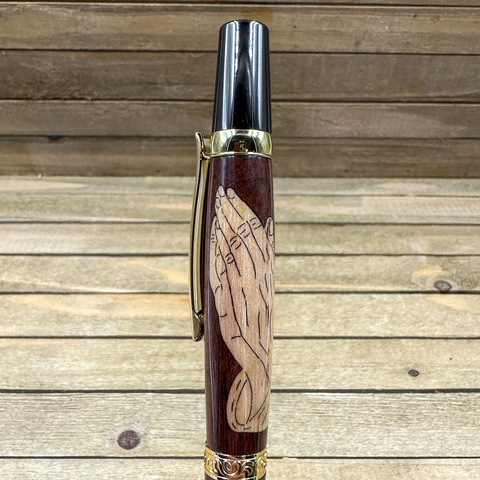 This is a Elegant Beauty style pen that features "Praying Hands" which are cut with a laser and assembled onto the pen. The wood inlay is turned down to fit the components, finish is applied, and then it is buffed out to a high gloss.